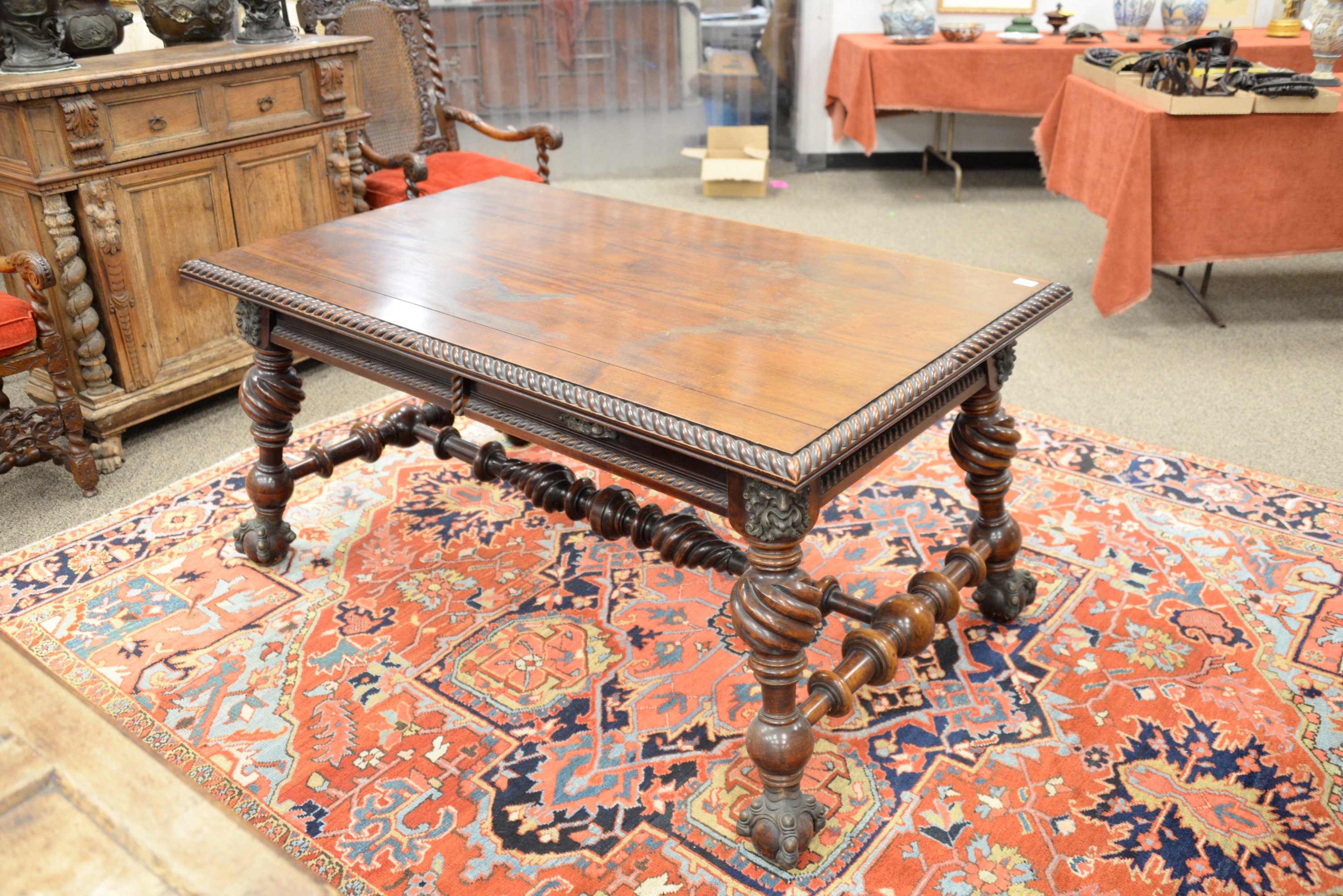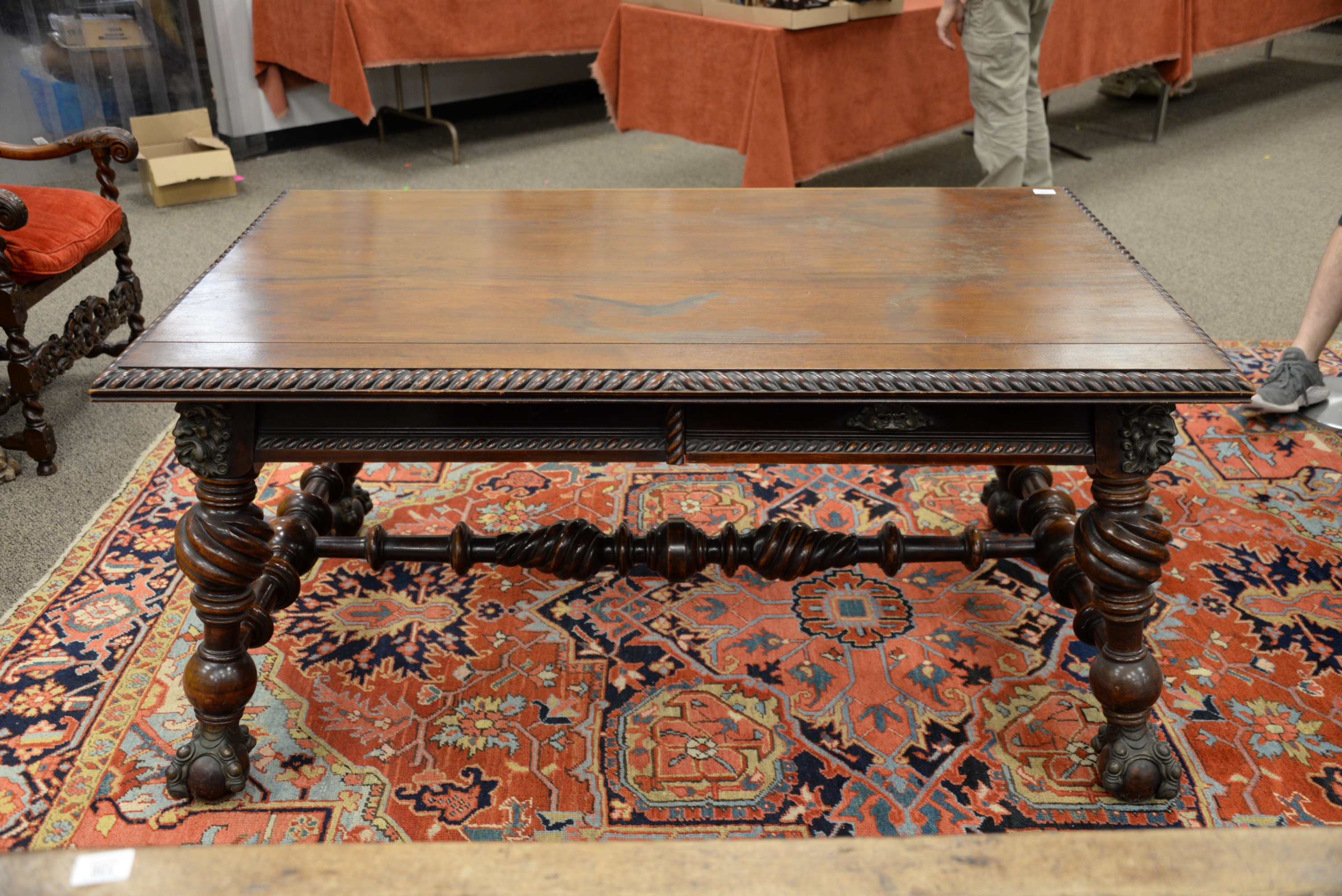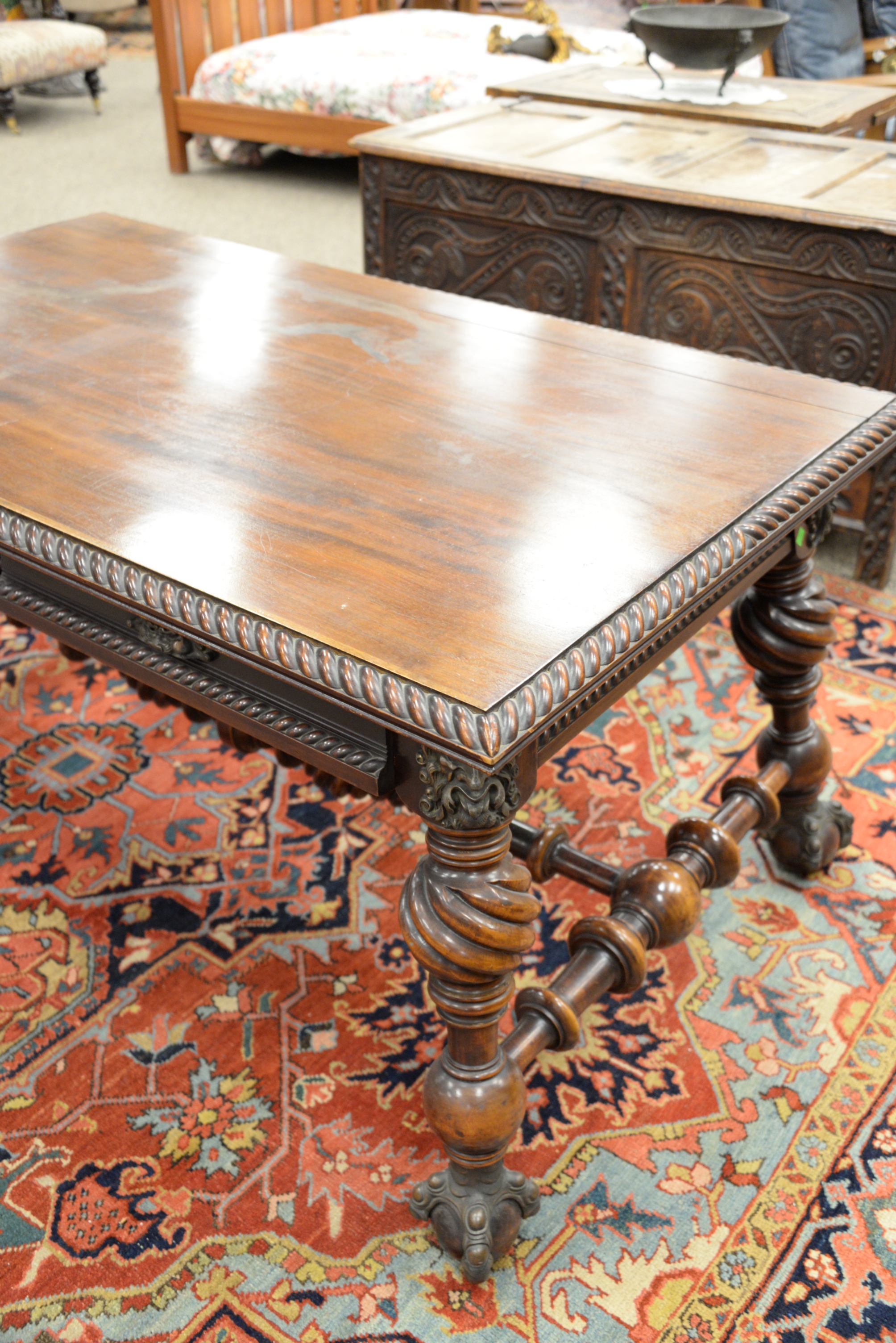 Victorian Mahogany Library Table, having rectangular top with gadrooned edge over one drawer on either side with bronze lion mask pulls and bronze lion mask corners, with spiral carved legs joined by bold turned stretcher, set on large ball and claw feet, having ball and claw feet with bronze claws, top with separation and stain, height 29 inches, top 60″ x 36″.