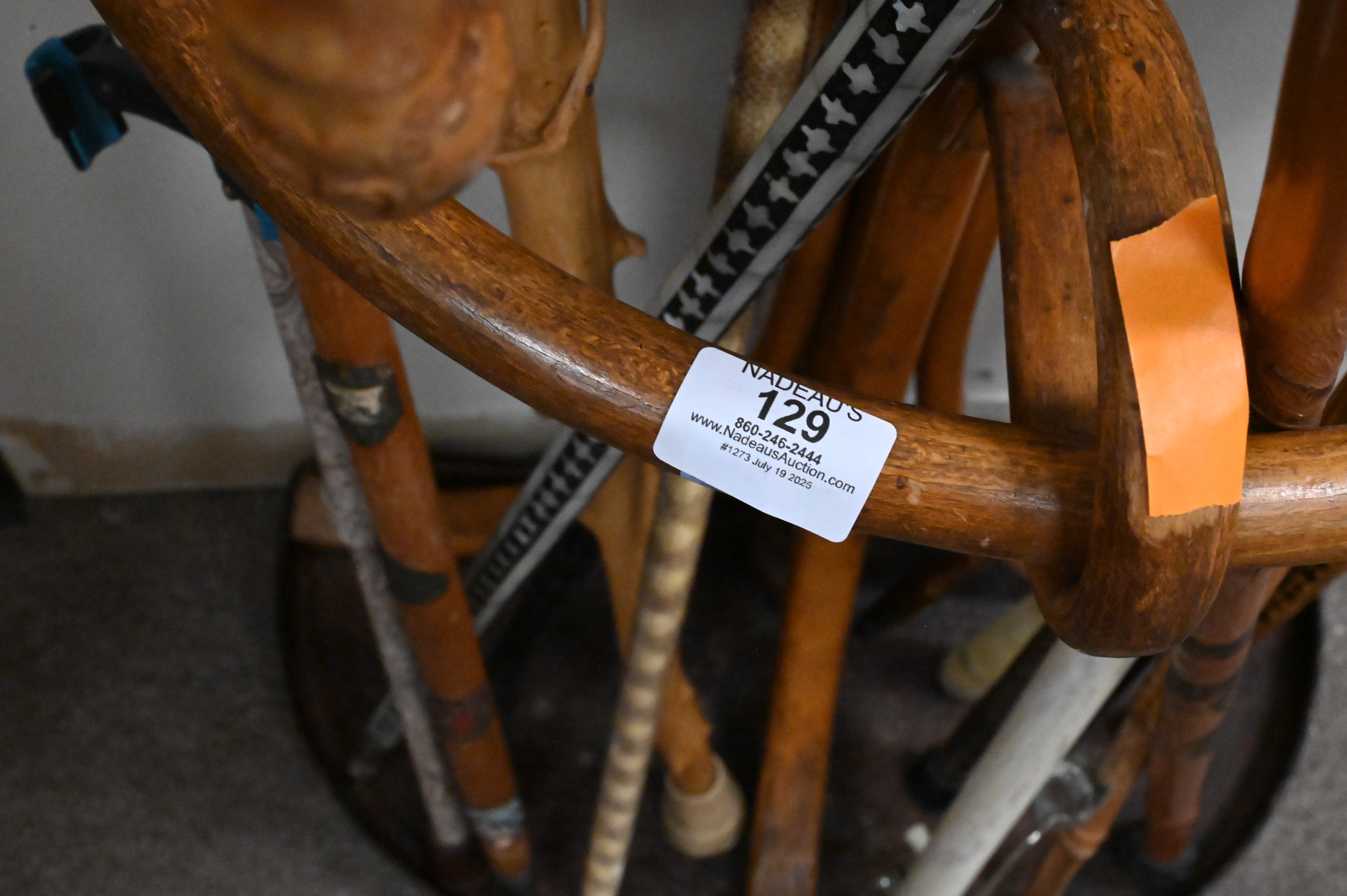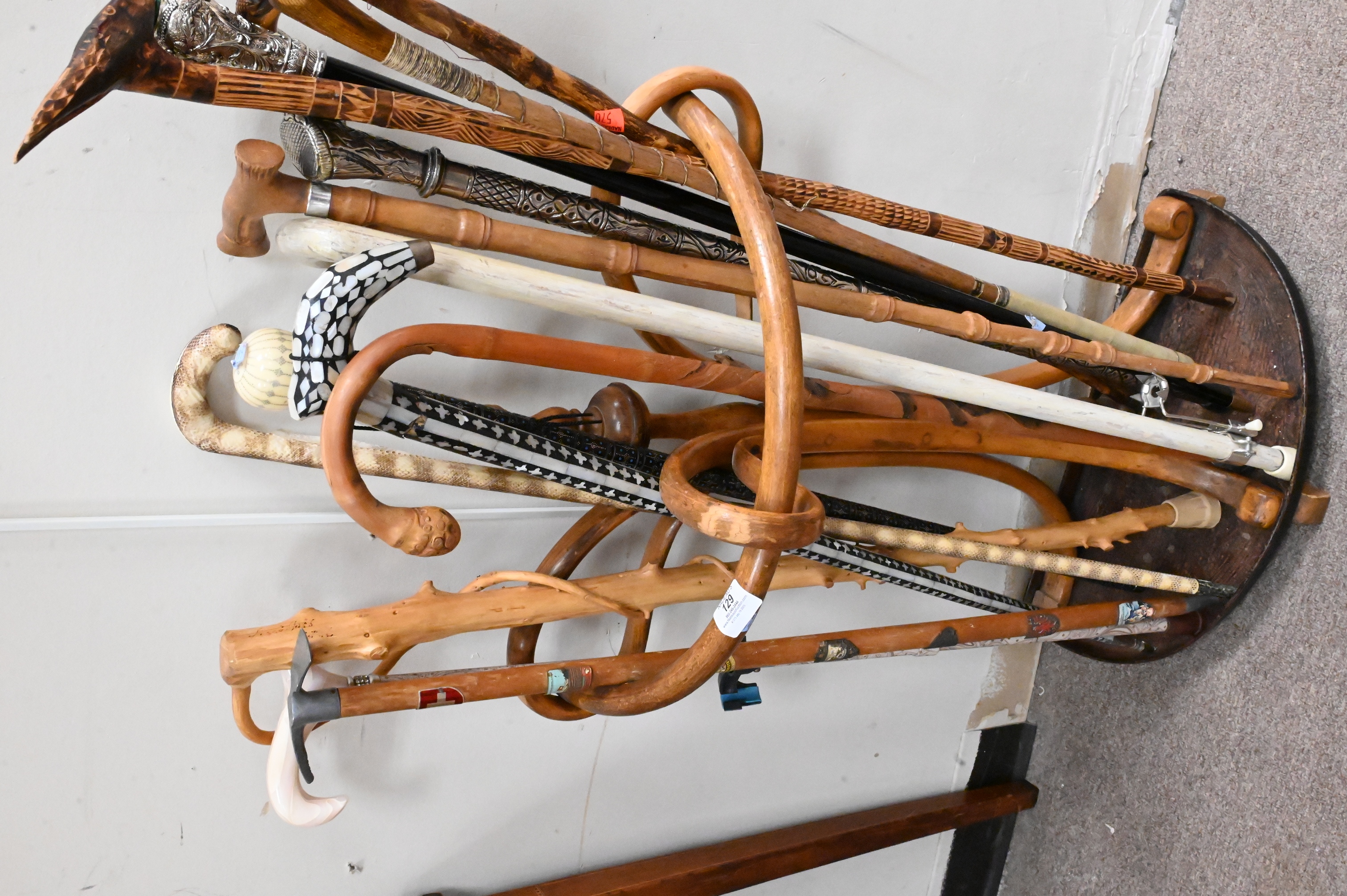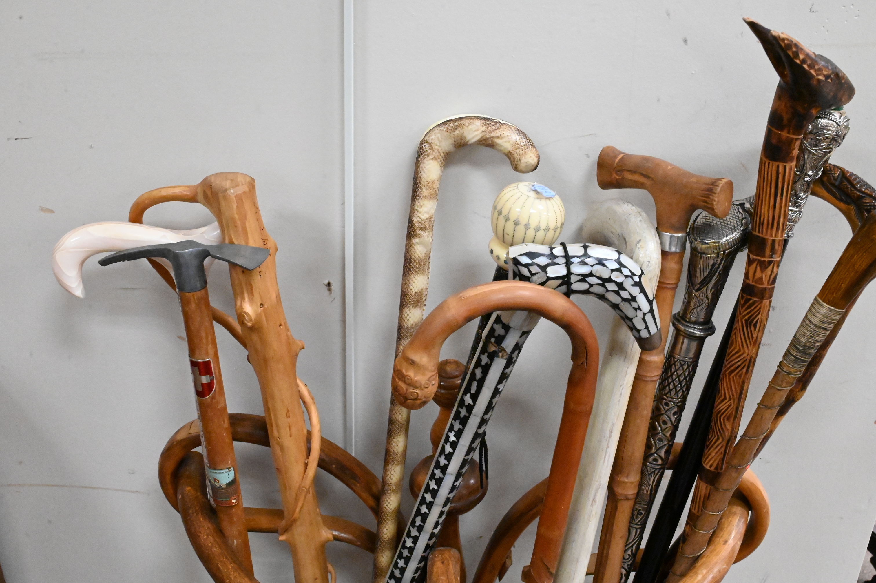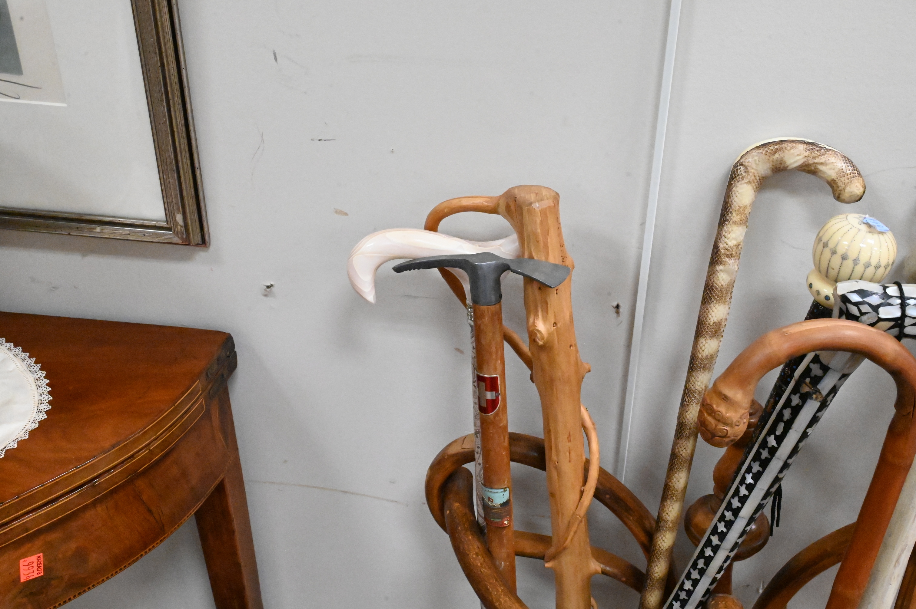 to include moroccan style inlaid, carved, snakeskin and figural canes, along with Abercrombie golf clubs in bentwood rack