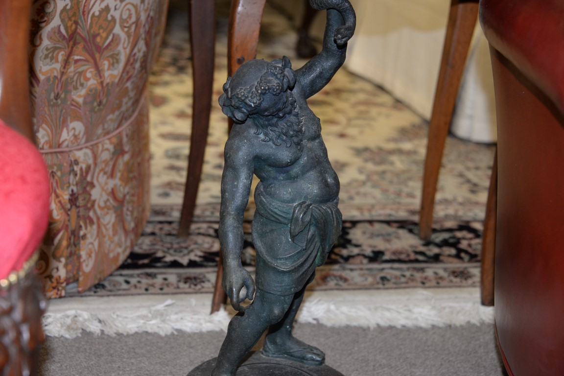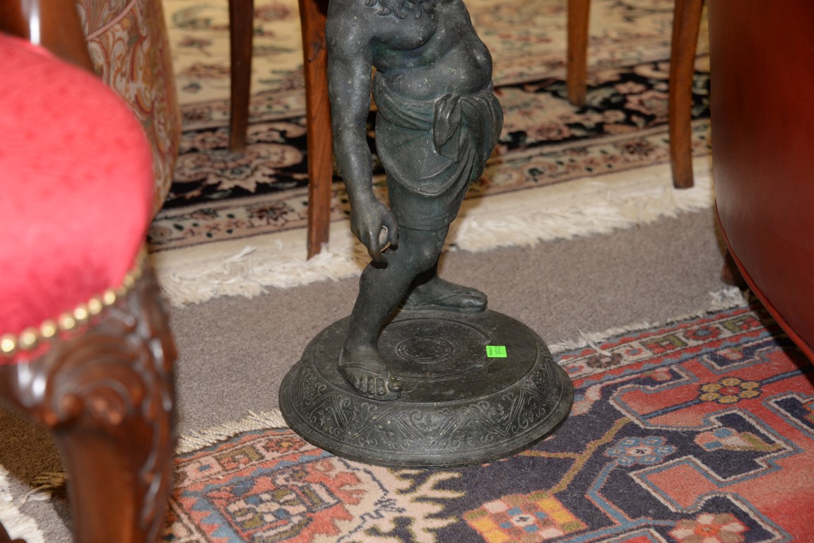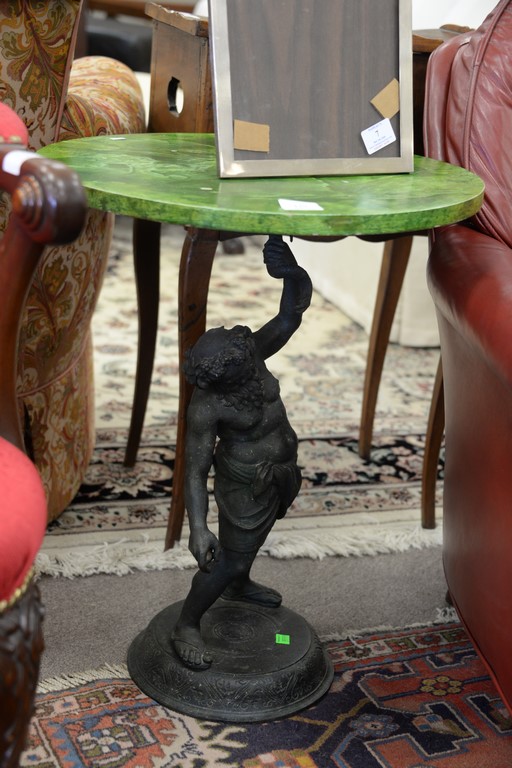 Lot 129: Bronze standing Goddess figure holding a snake made into a stand with round top. ht. 24in., dia. 19in.
