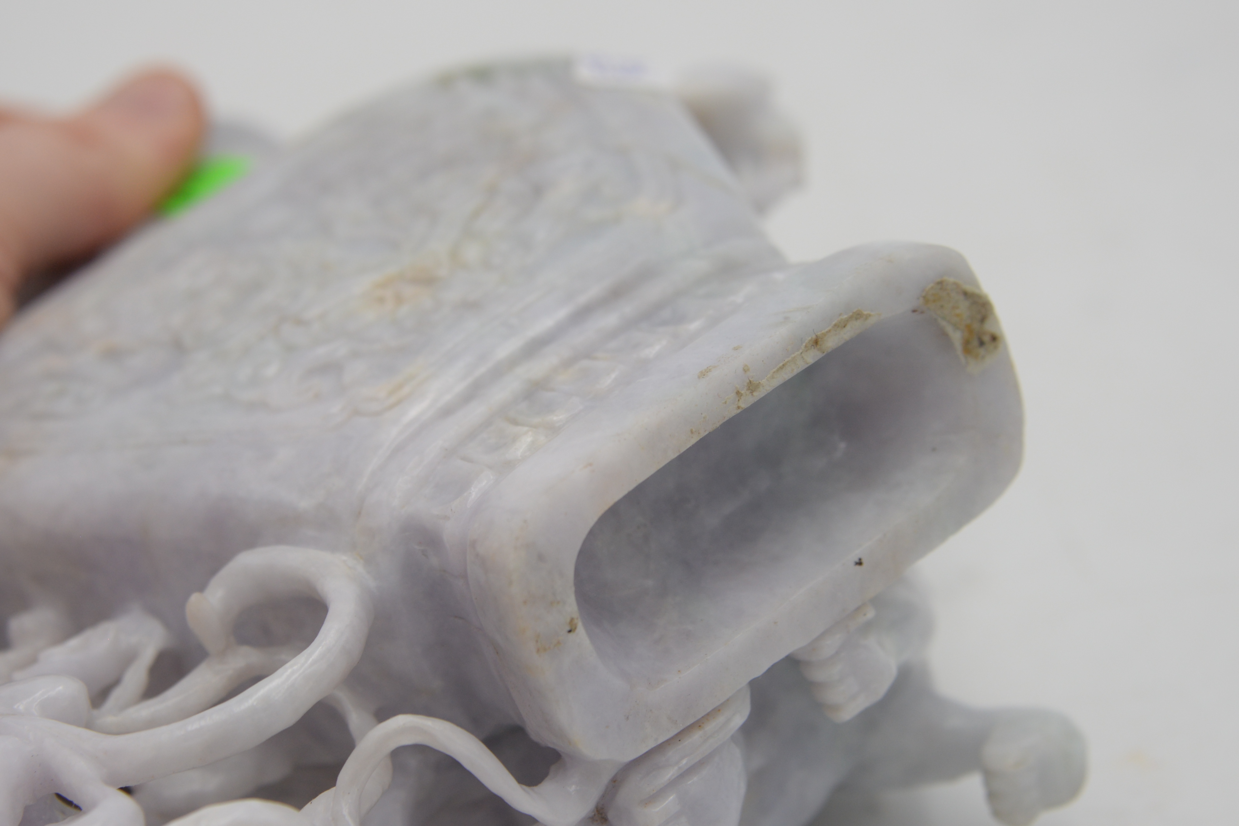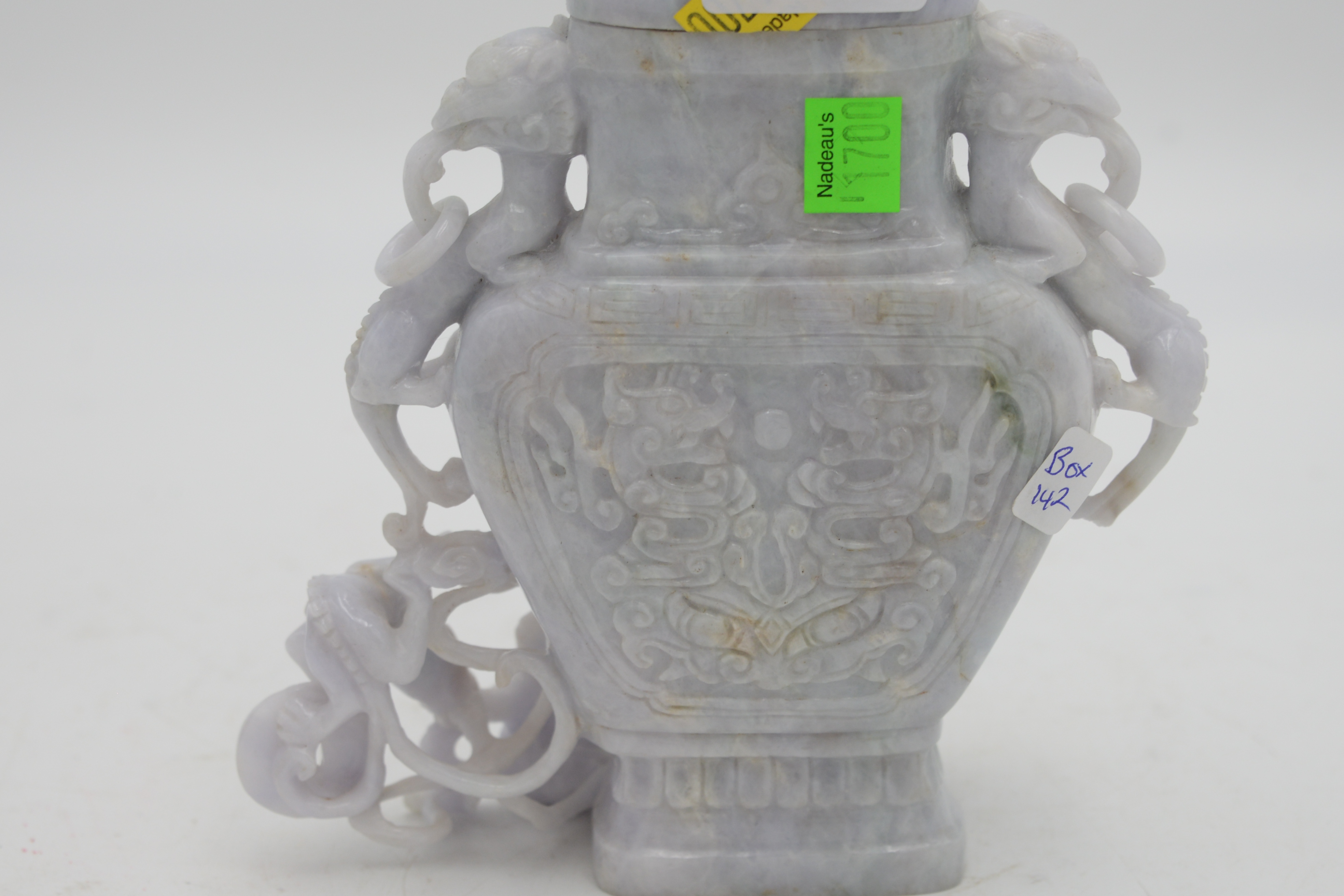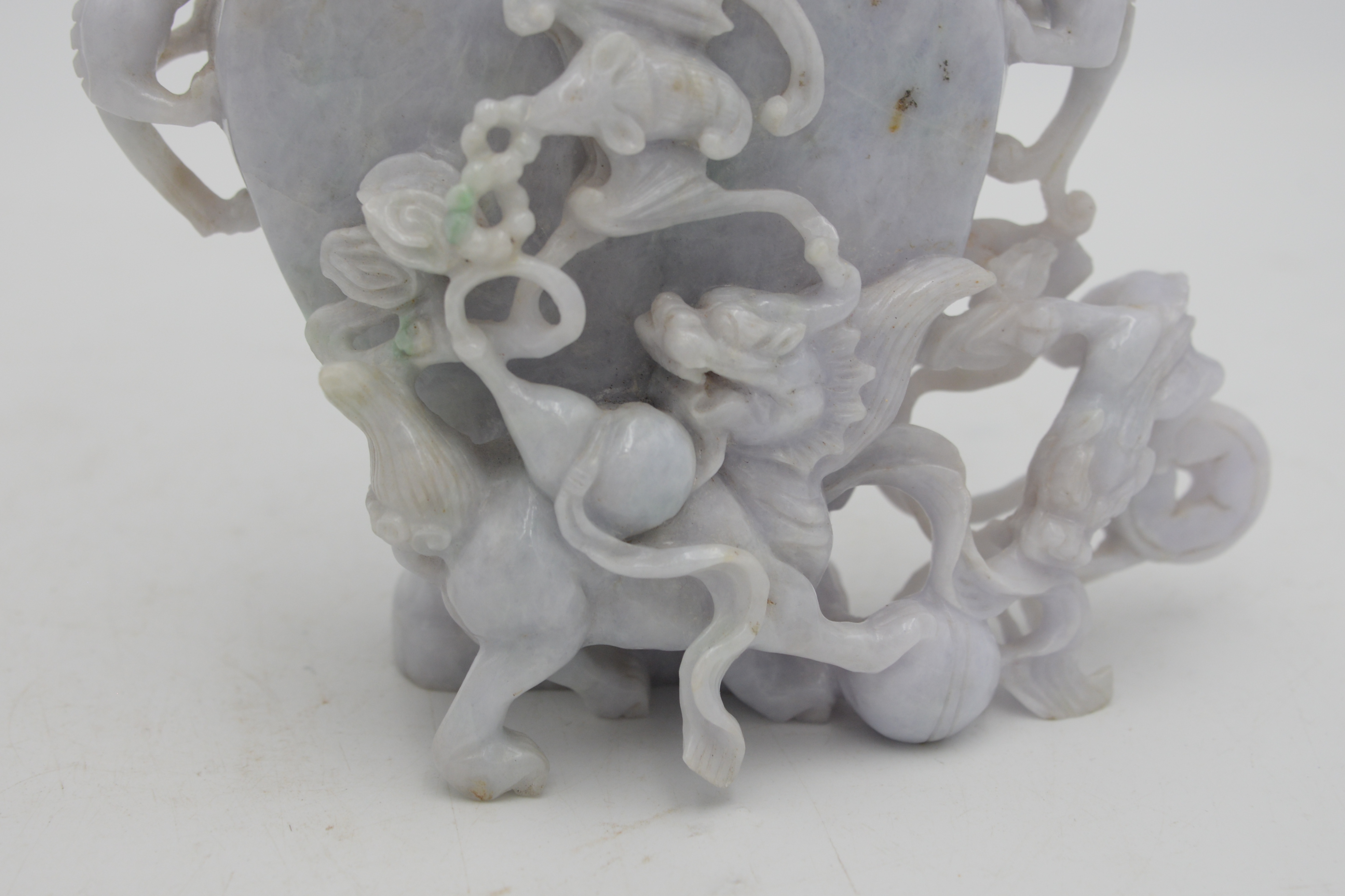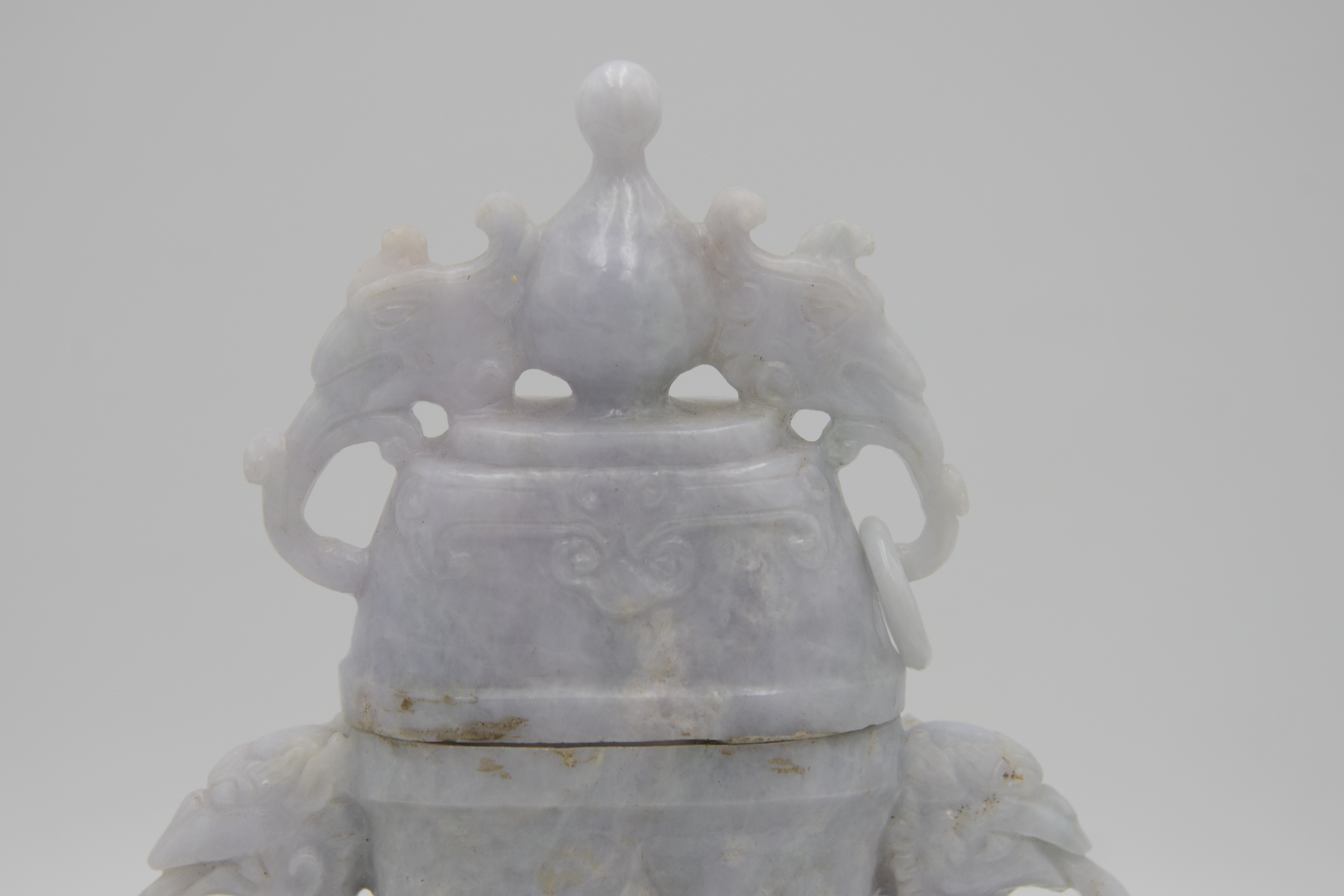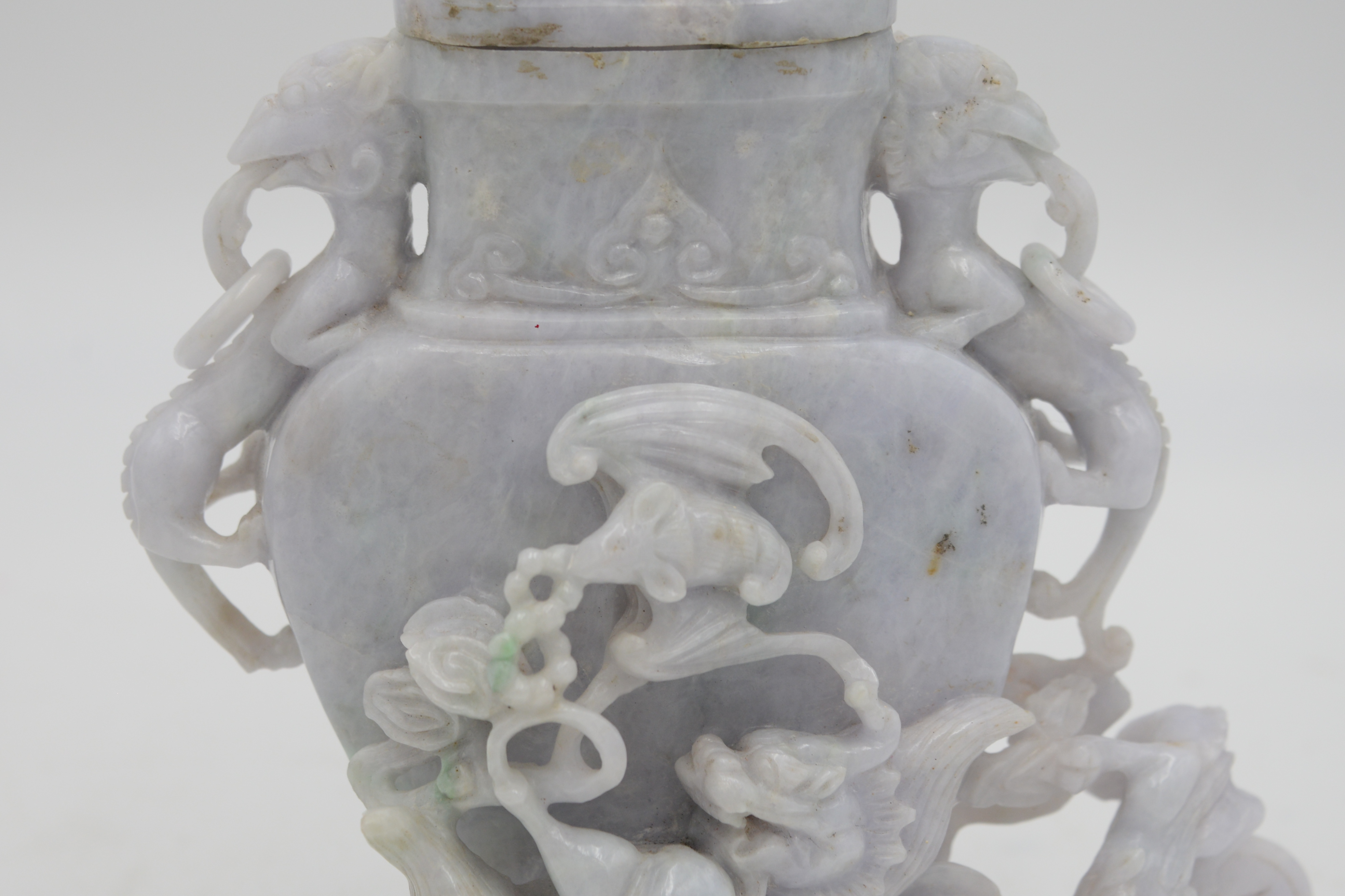 Chinese Hardstone Phoenix Covered Urn, having carved dragons and bats, one missing chain, height 9 3/4 inches