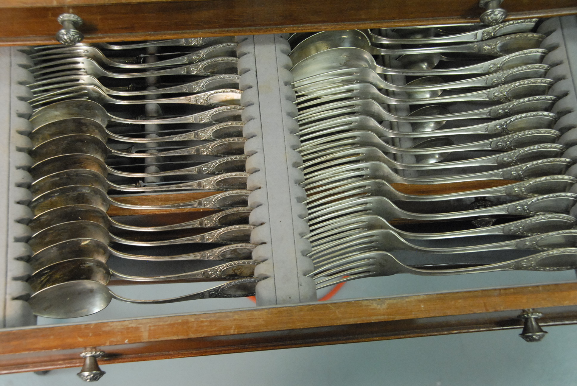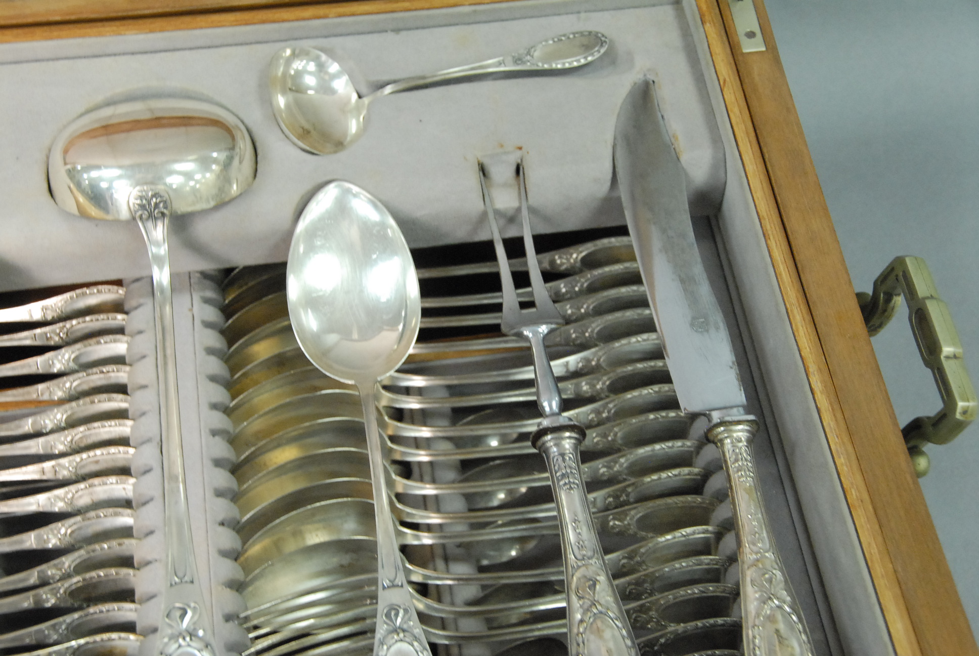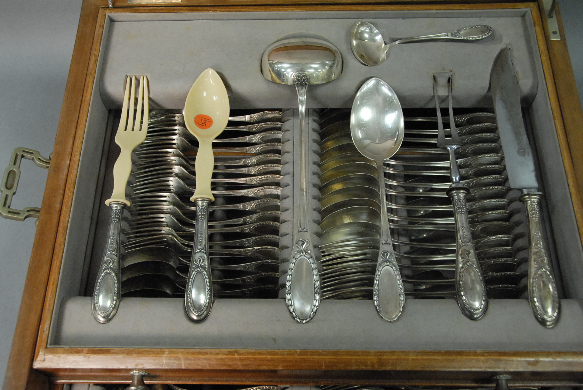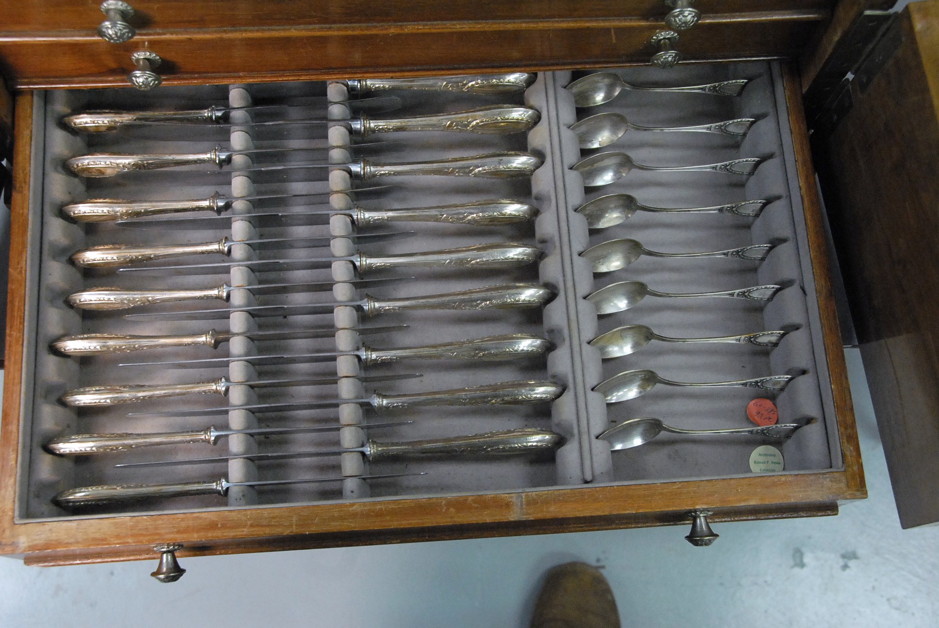 Continental silver flatware set in a fitted box with drawers, 92 pieces, 71.8 weighable troy oz. plus 28 handles.