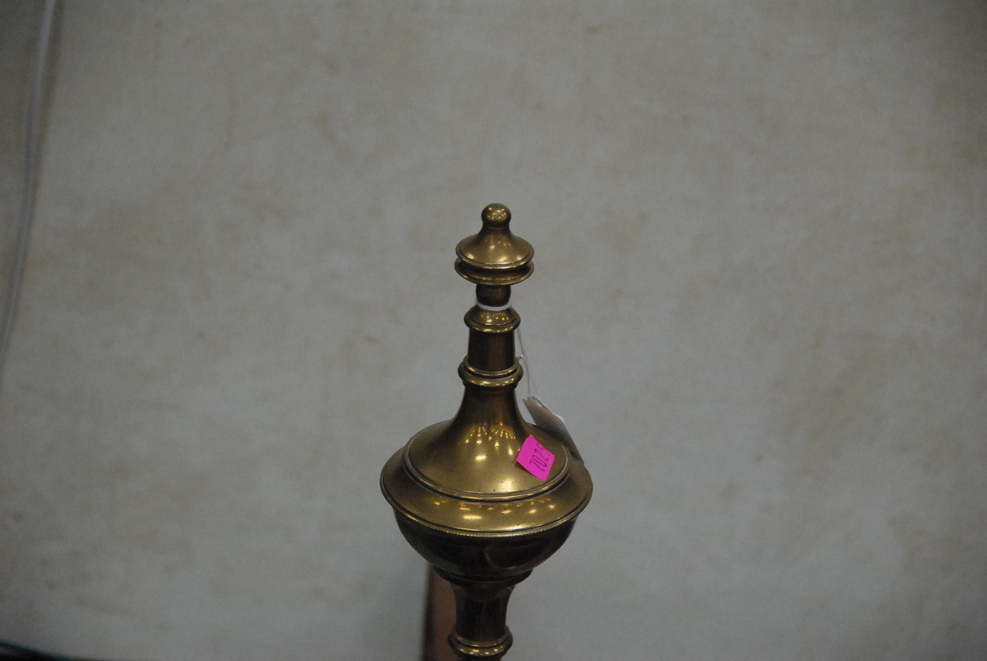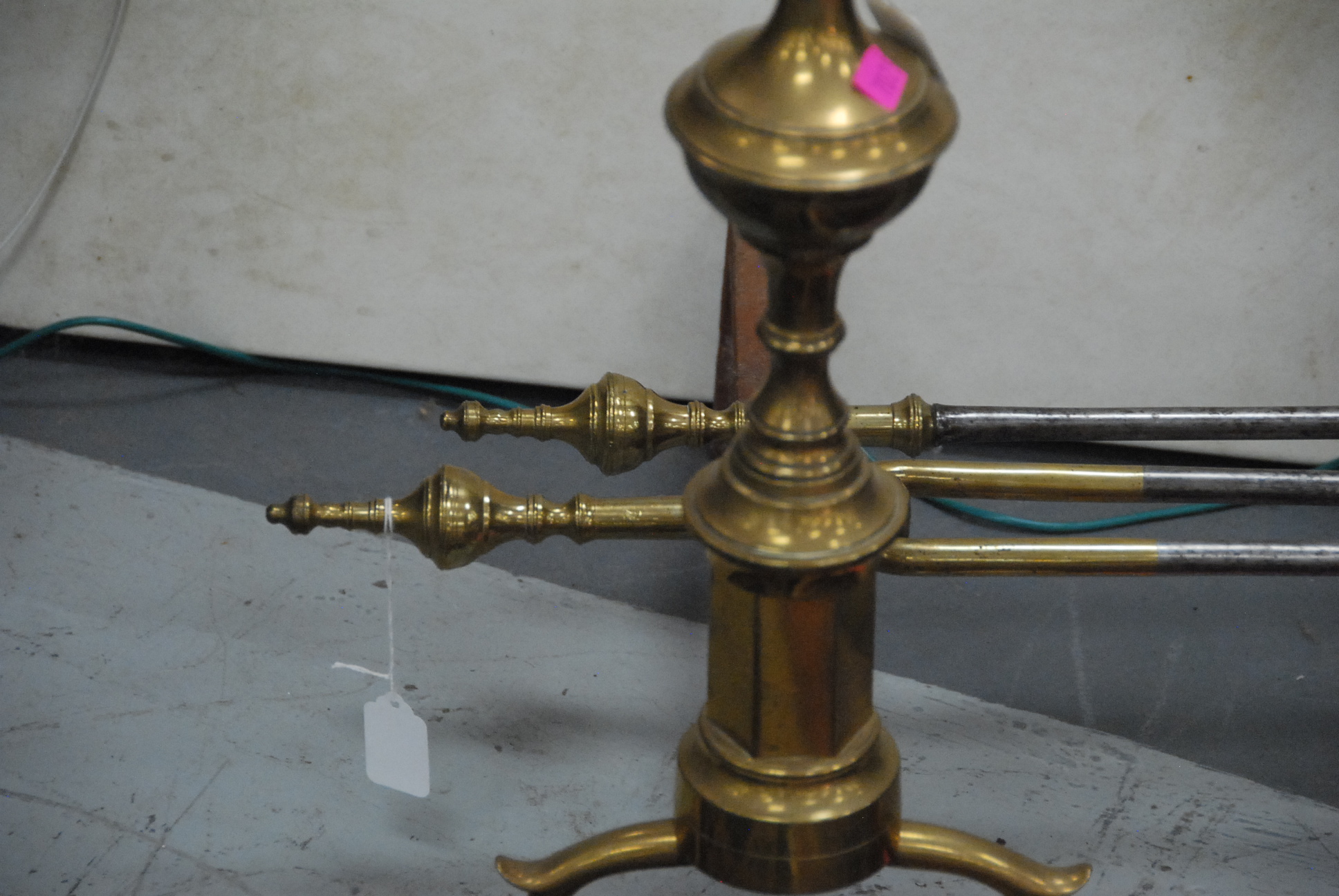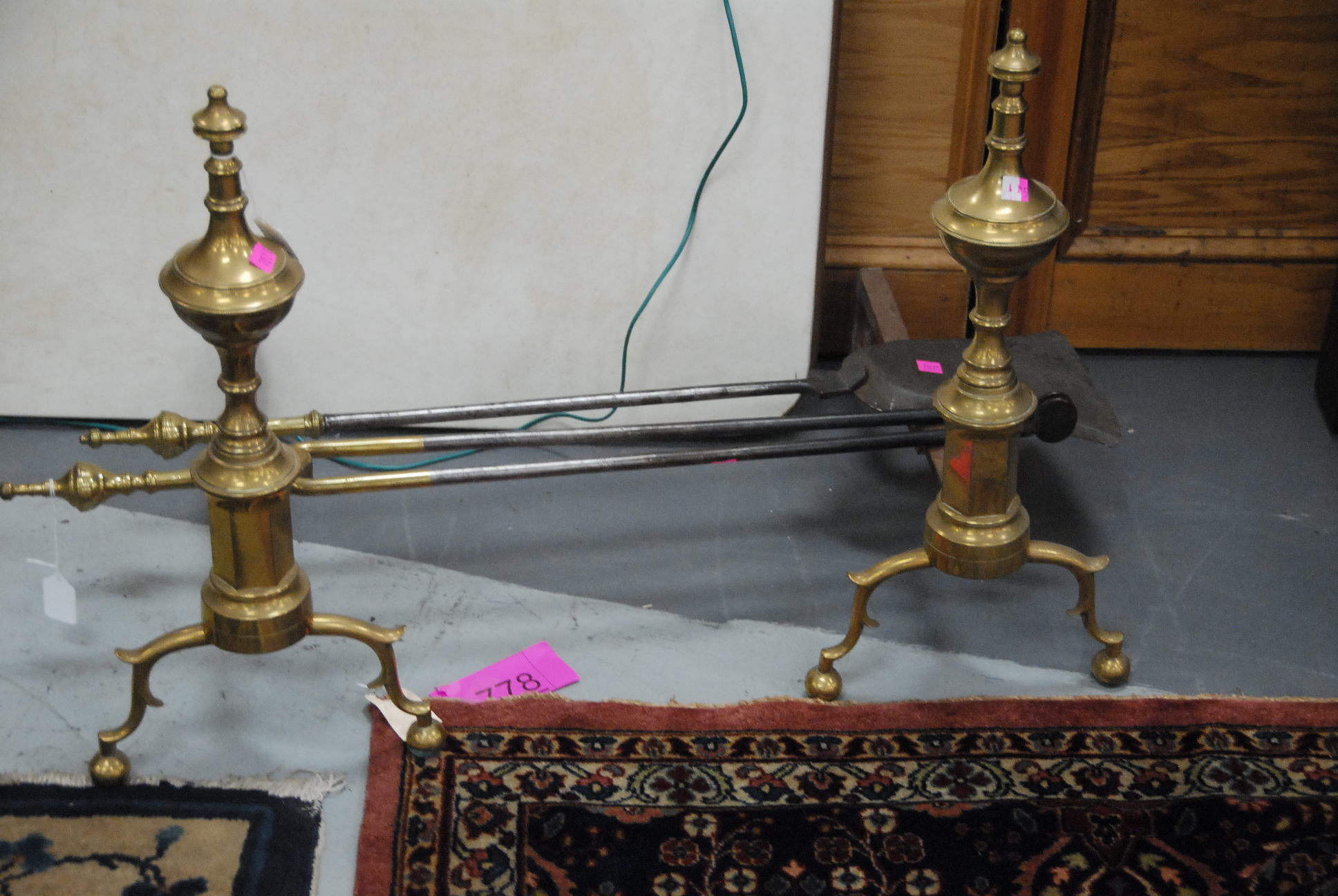 Lot 129: Four piece lot to include pair of Federal brass andirons and two matching brass top fire tools. ht. 22in.
