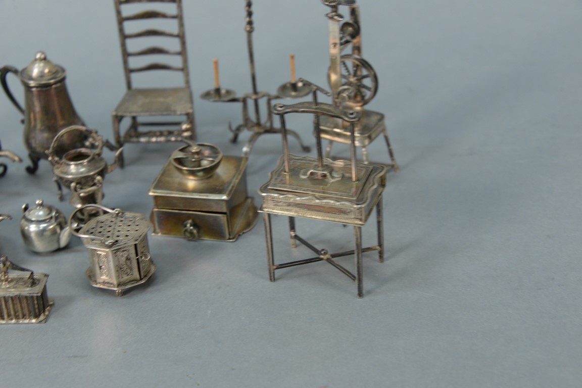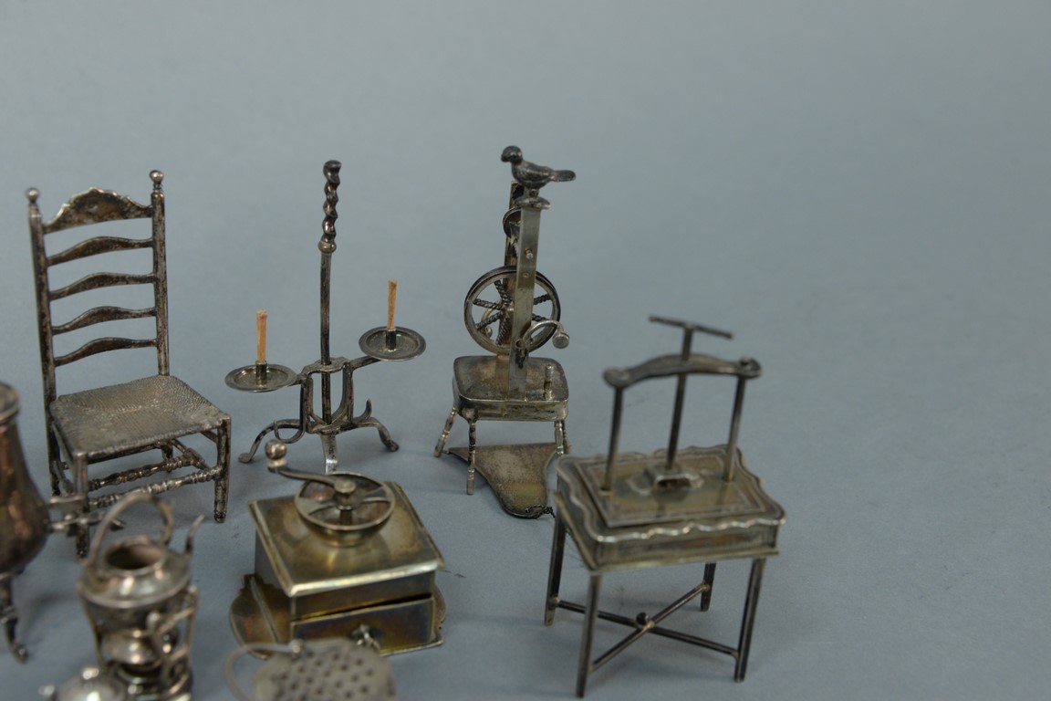 Fourteen miniature silver dollhouse tableware and furniture group to include a chair, table press, birdcage with stand, adjustable candlestand, and yarn winder.