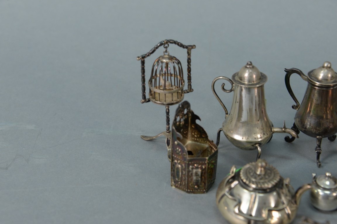 Lot 129: Fourteen miniature silver dollhouse tableware and furniture group to include a chair, table press, birdcage with stand, adjustable c…