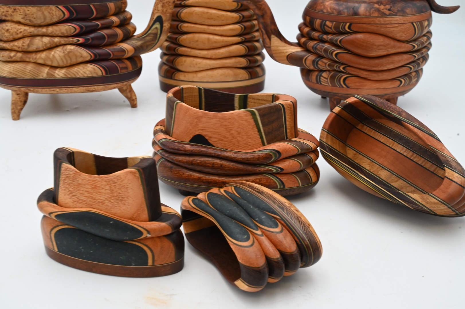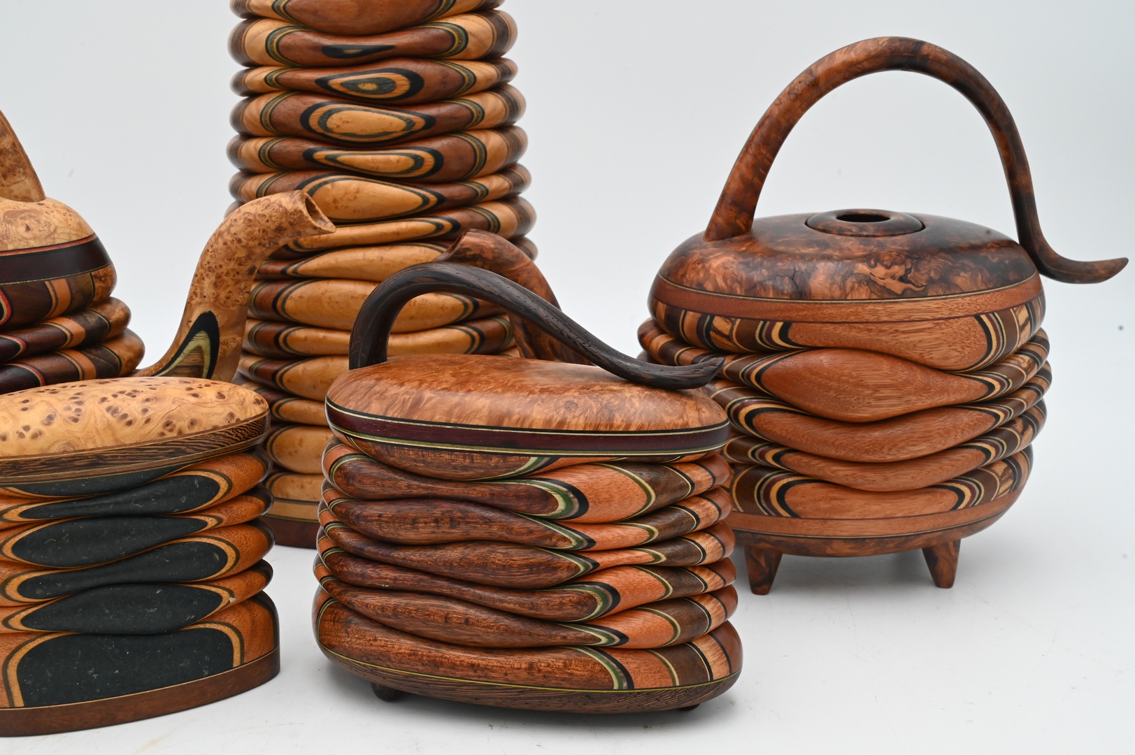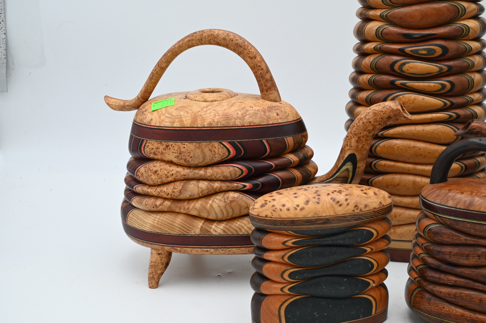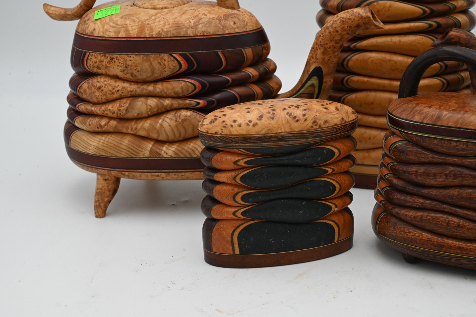 Group of Five Terry Evans Carved Spiritwood Pieces, to include two teapots, triple box, box with handle, along with a small box; all hand carved, made up of Bubinga boxwood indian rosewood, red elm, walnut, sycamore, wenge, ash, as well as birdseye maple, tallest 11 1/2 inches. Provenance: Estate of Peter Tillou, Litchfield, Connecticut.