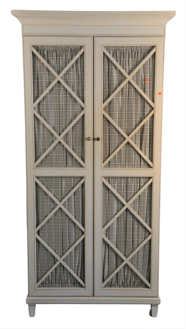 Lot 129: Paint Decorated Two Door Cabinet, having glass doors and shelves, height 81 inches, width 36 inches, depth 16 1/2 inches. Provenance: David and Cynthia Kim, 22 Stoney Wylde Lane, Greenwich, Connecticut. View home by visiting: https://www.zillow.com/homedetails/22-Stoney-Wylde-Ln-Greenwich-CT-06830/177238281_zpid/