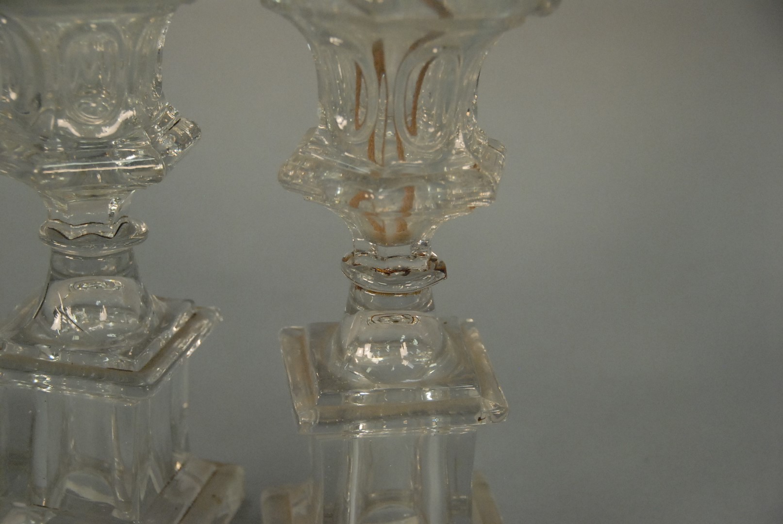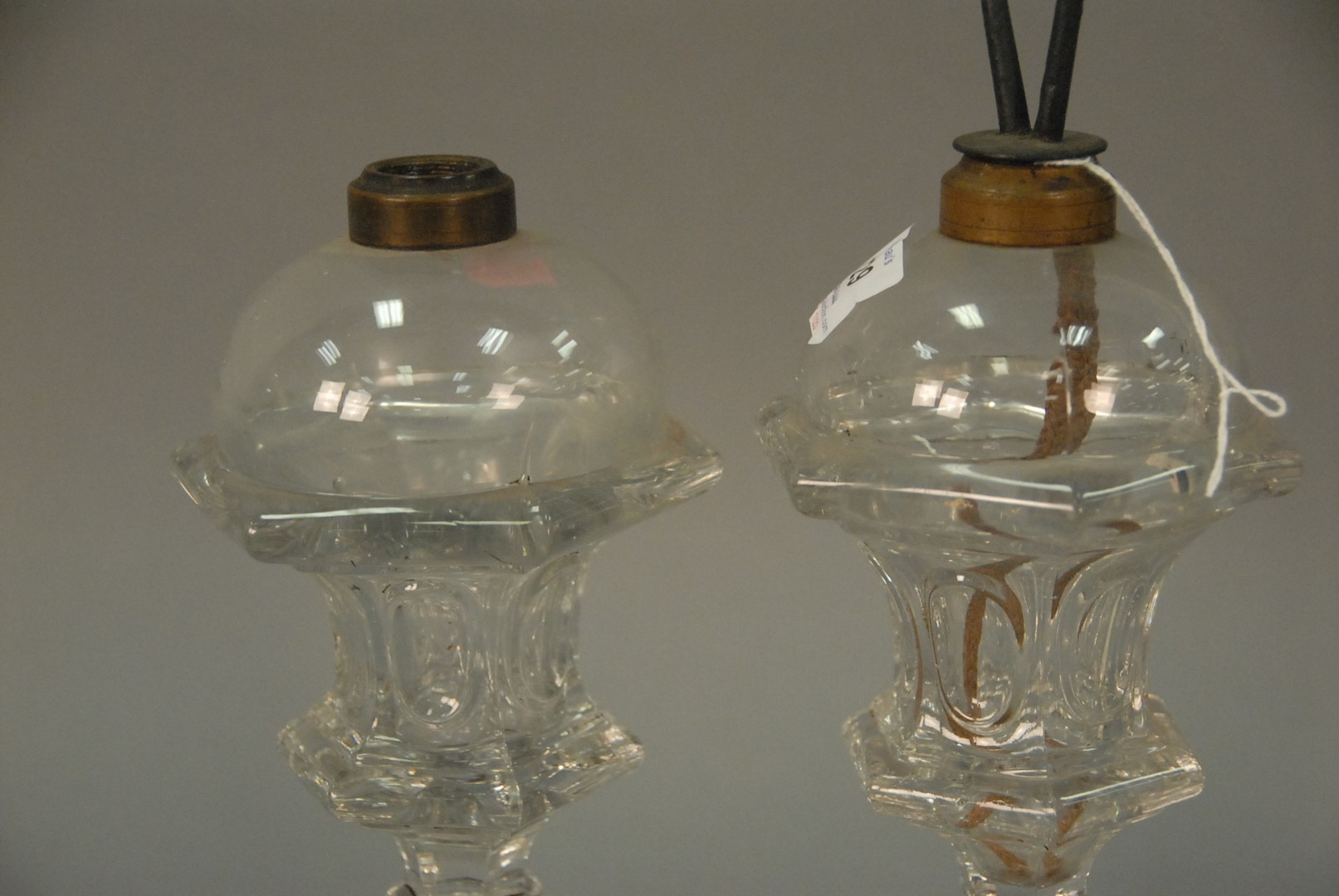 Pair of pressed glass whale oil lamps. ht. 13 1/2