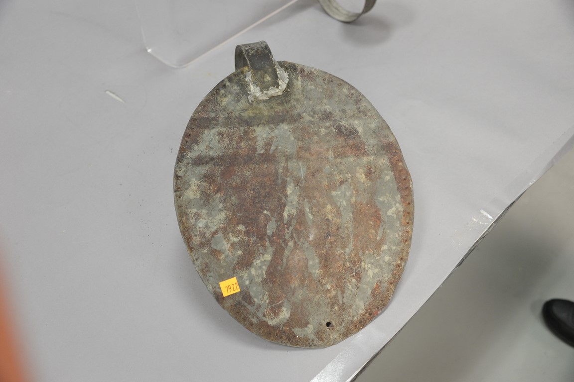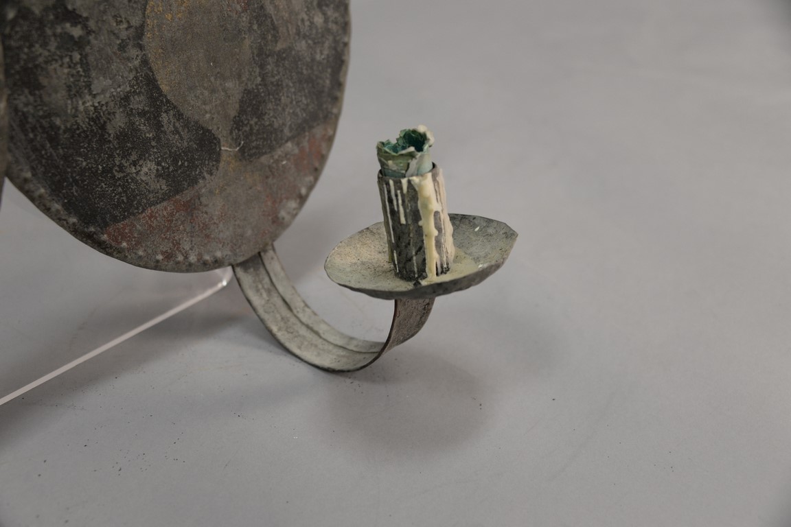 Lot 129: Pair of tole candle sconces with remnants of original paint, early 19th century. ht. 16in., wd. 11 1/4in.