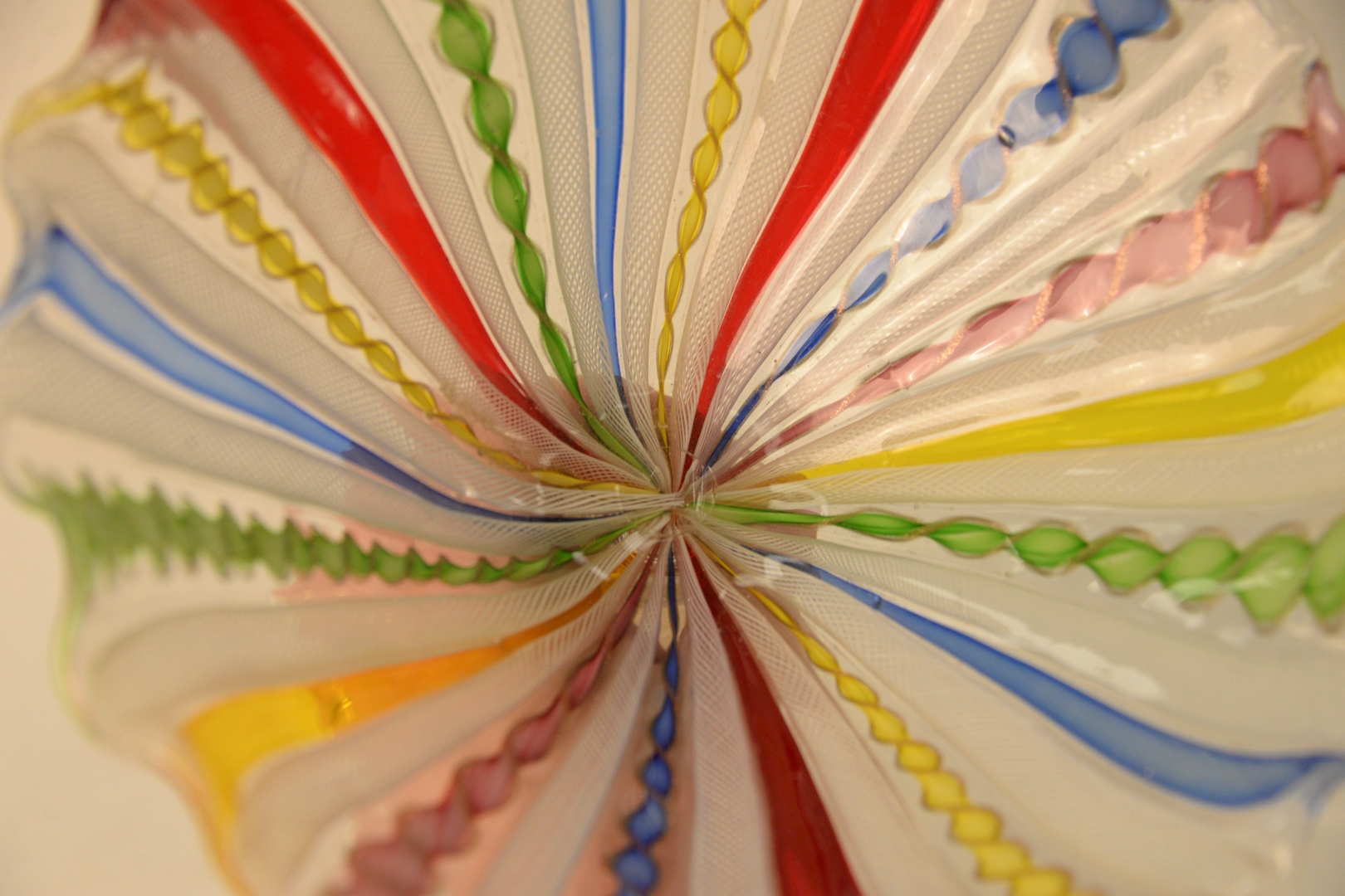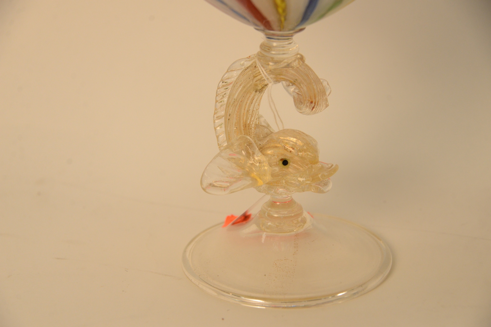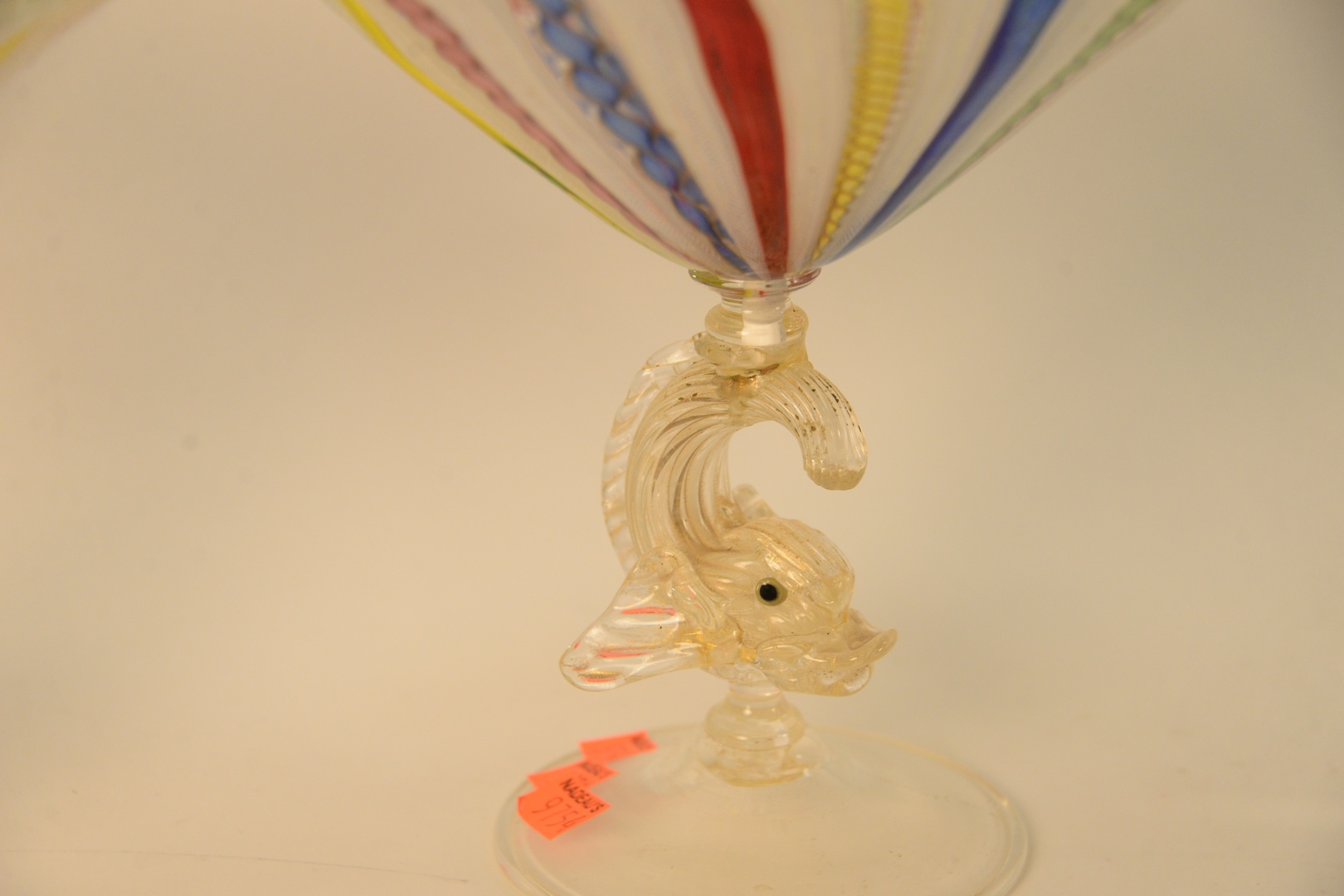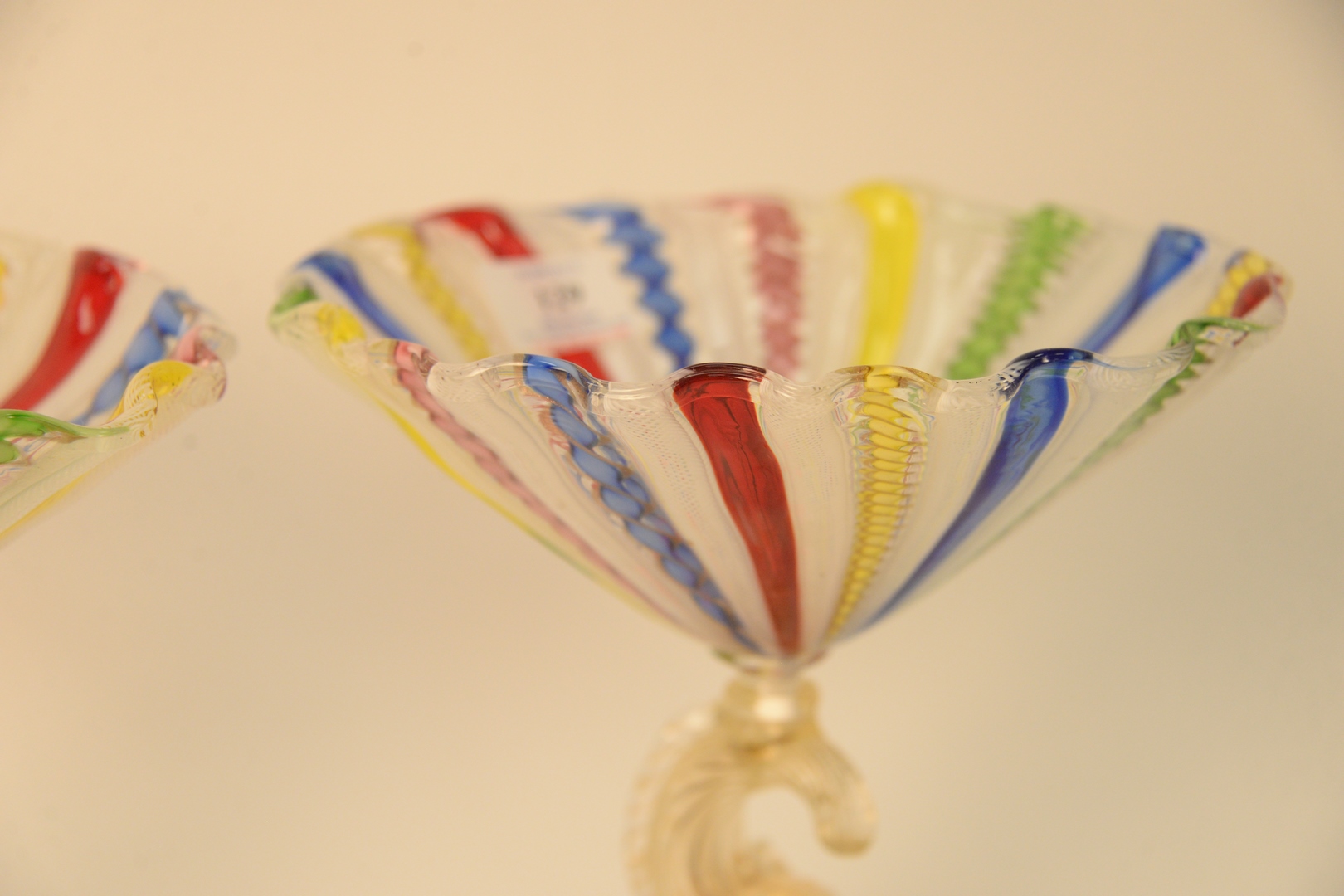 Lot 129: Pair of Venetian Compotes, having candy twist bowl with ruffle rim over swan stem base, height 8 3/4 inches, width 8 3/4 inches.