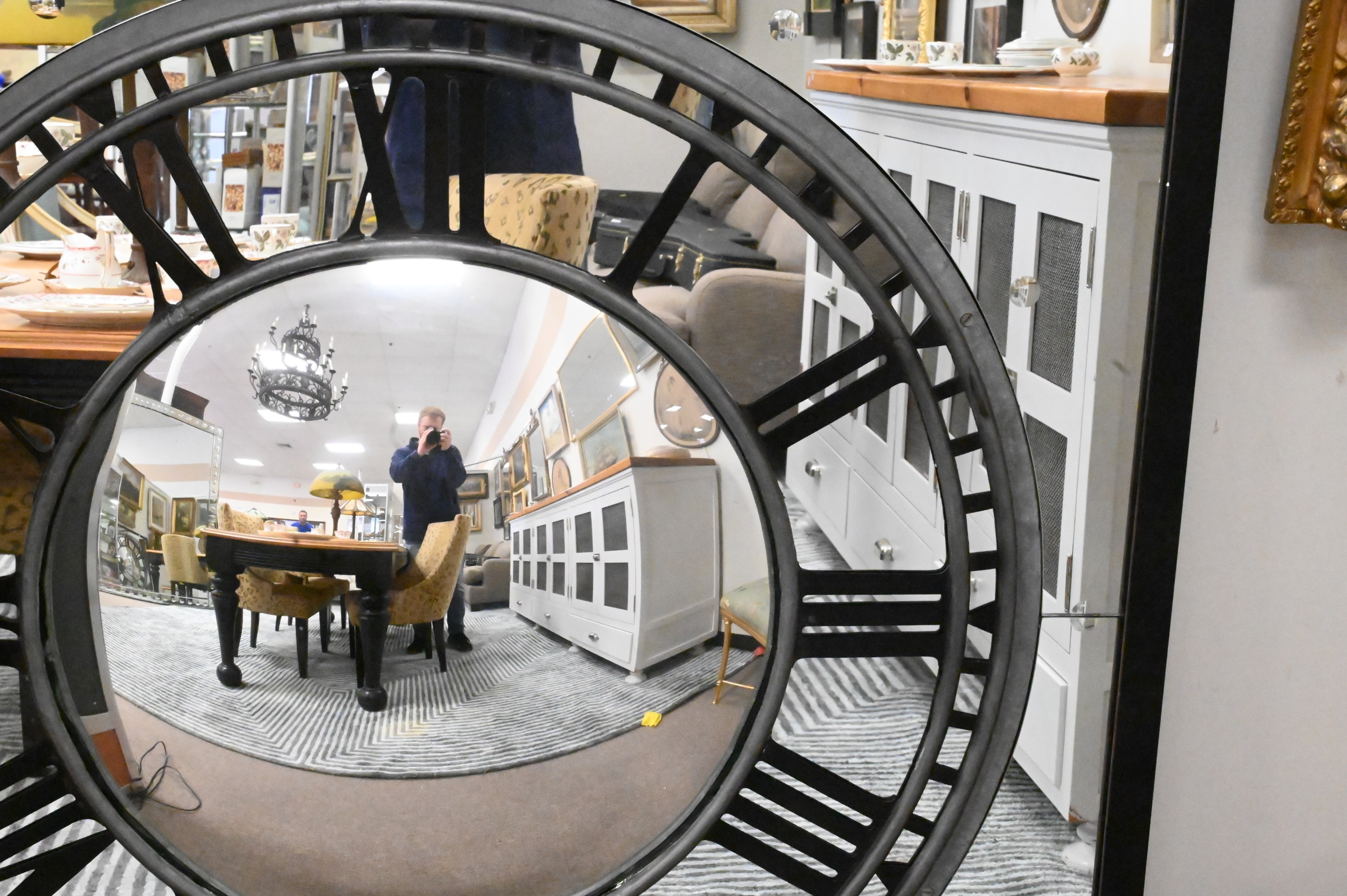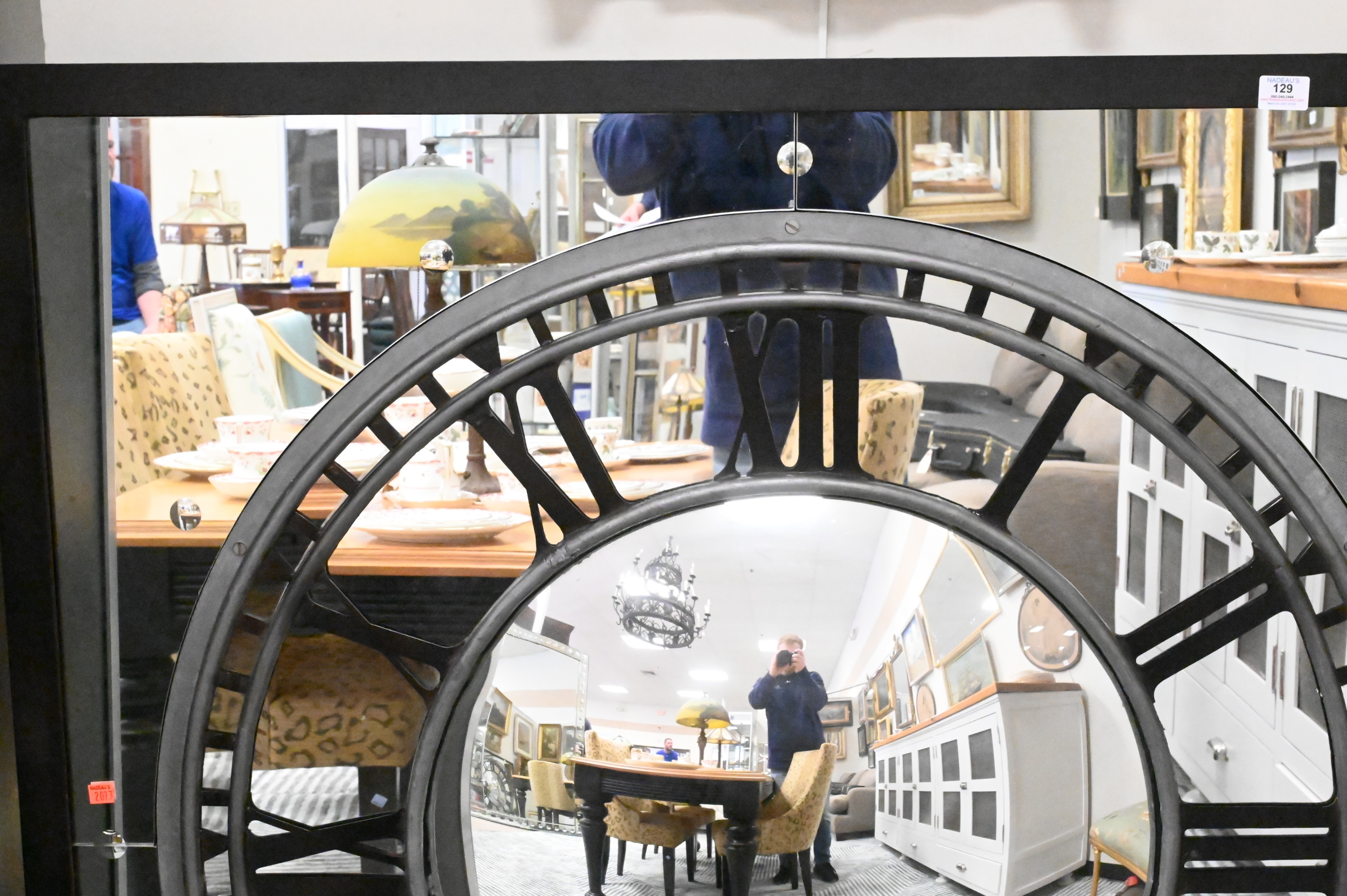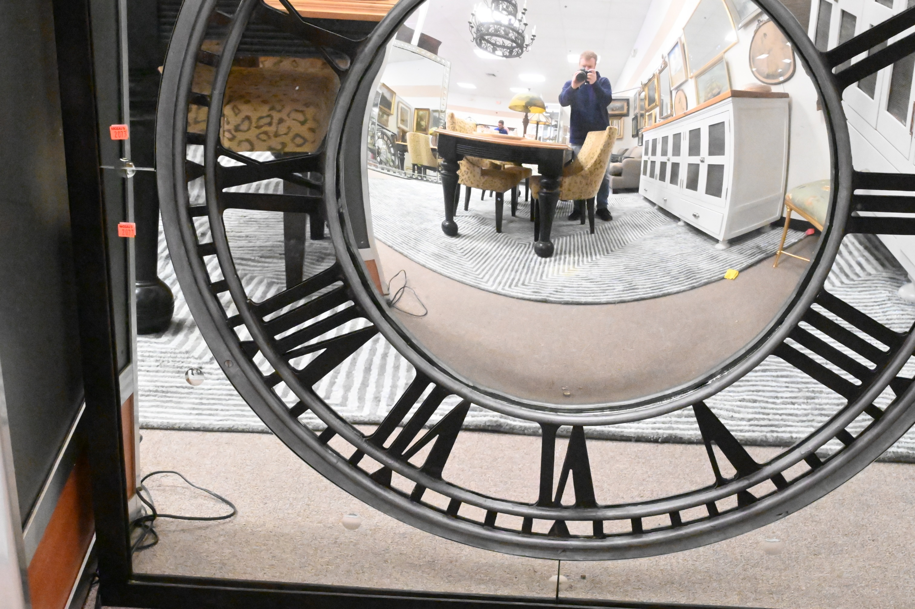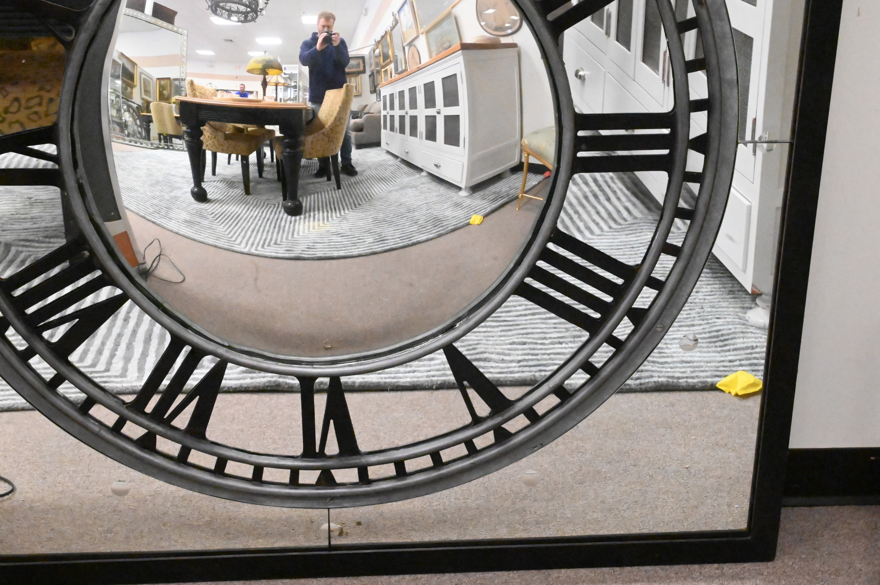 Restoration Hardware Contemporary Mirror, having Roman numeral clock motif, 50 1/2″ x 50 1/2″.