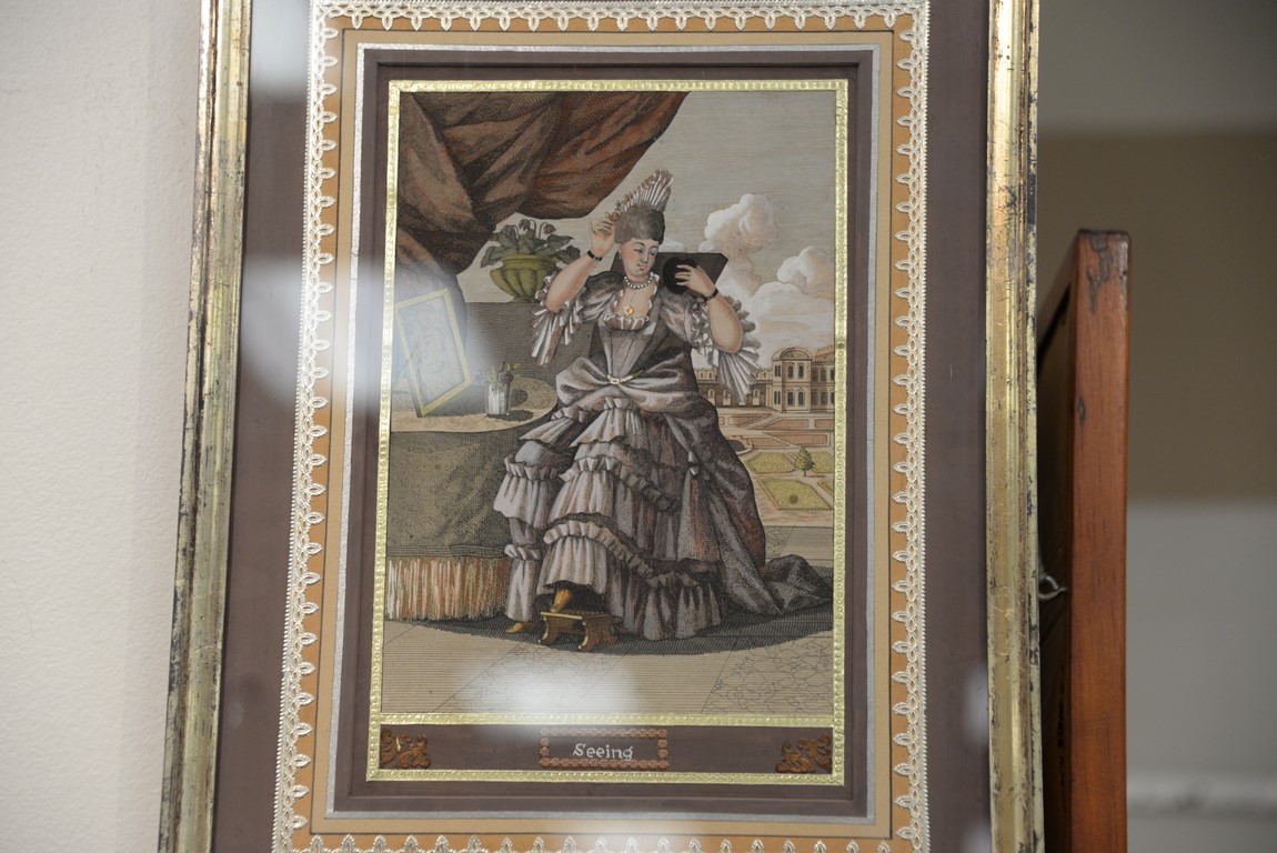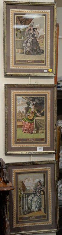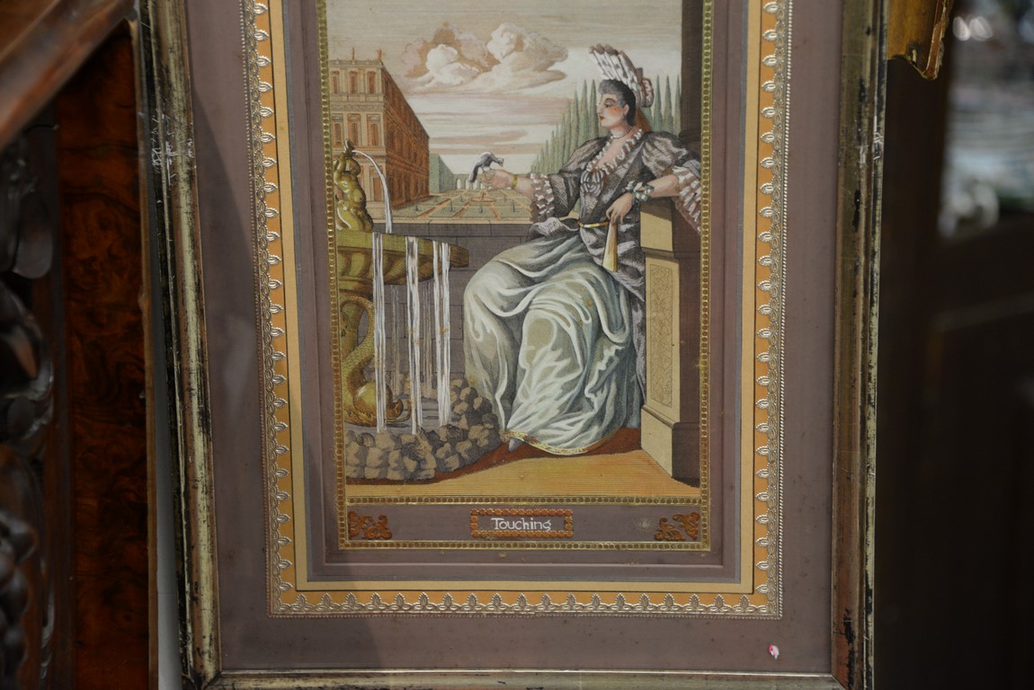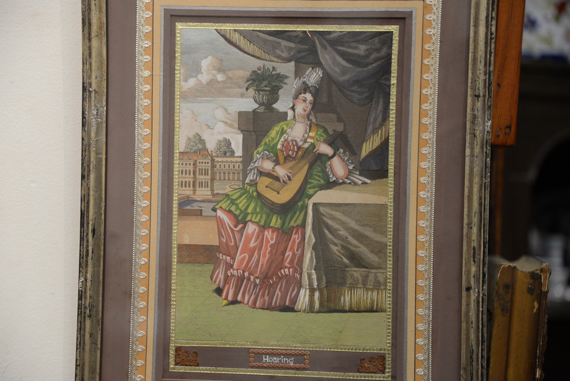 Lot 129: Set of five The Five Senses hand colored engravings on woven paper, framed and matted, 19th century. 11 x 7