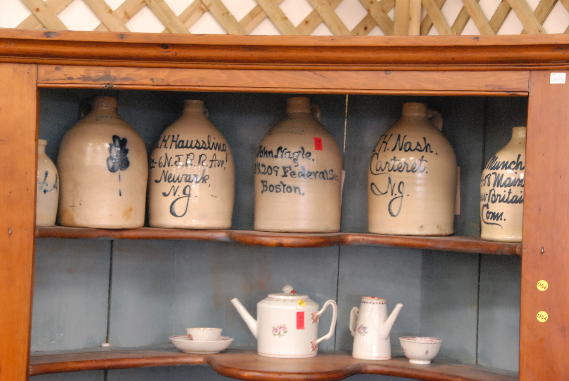 Six stoneware jugs and crocks with blue writing, New Britain Ct, NJ, Boston, Newark NJ, one as is