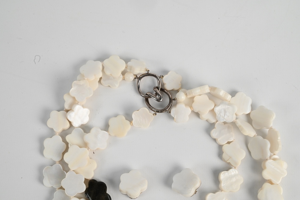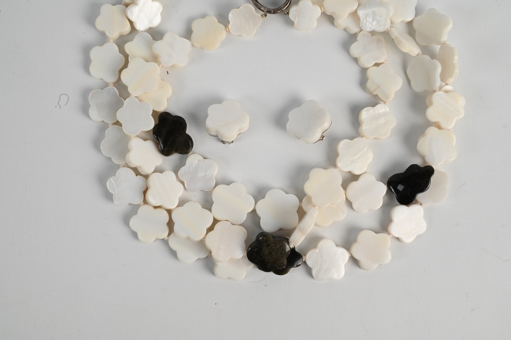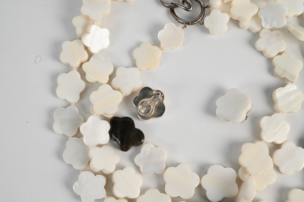 Tambetti Mother of Pearl Alhambra Earrings, along with a matching three strand necklace having sterling clasp, length 17 inches; backing of earring marked Tambetti Sterling.