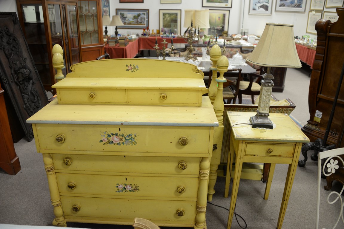 Lot 129: Three piece painted and stenciled bedroom set with four post rope bed, Sheraton chest, and Federal one drawer stand, circa 1830. ht….