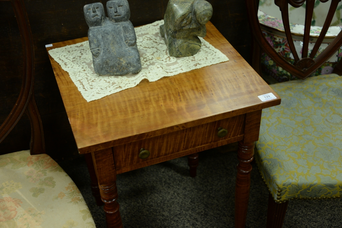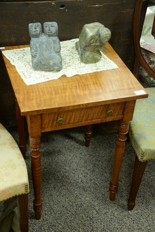 Tiger maple Sheraton one drawer stand. ht. 26 1/2in., top: 19 x 19