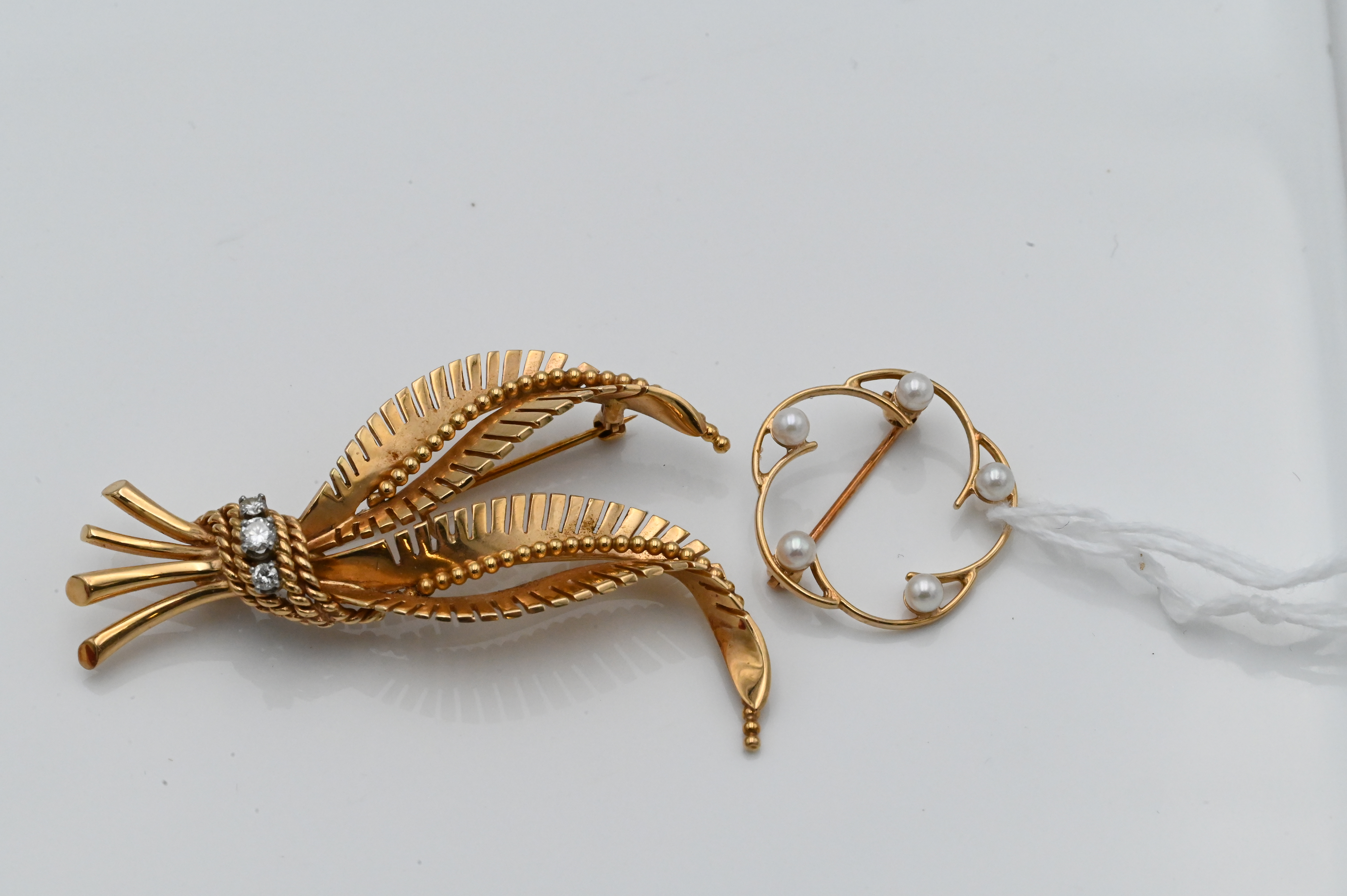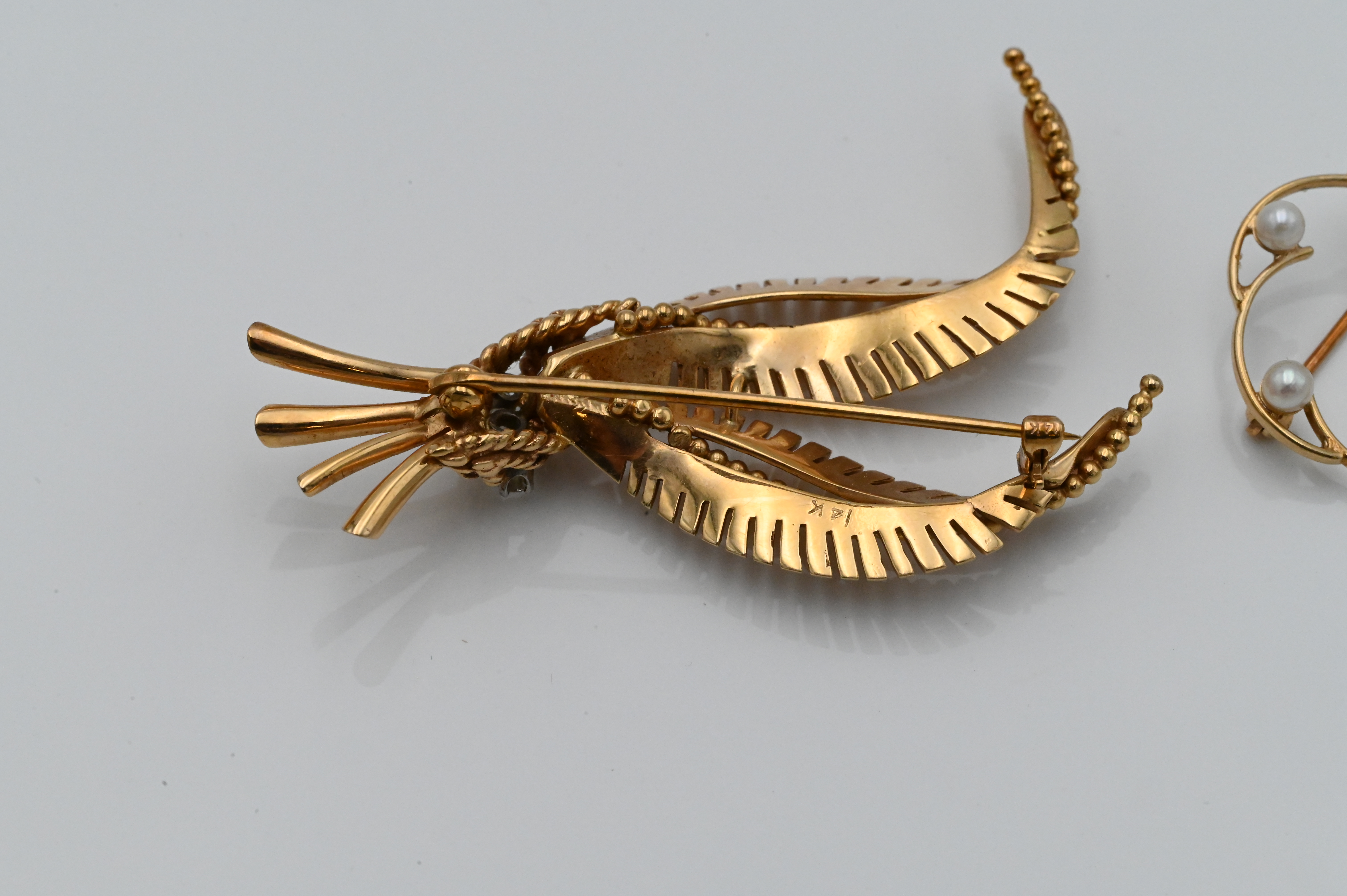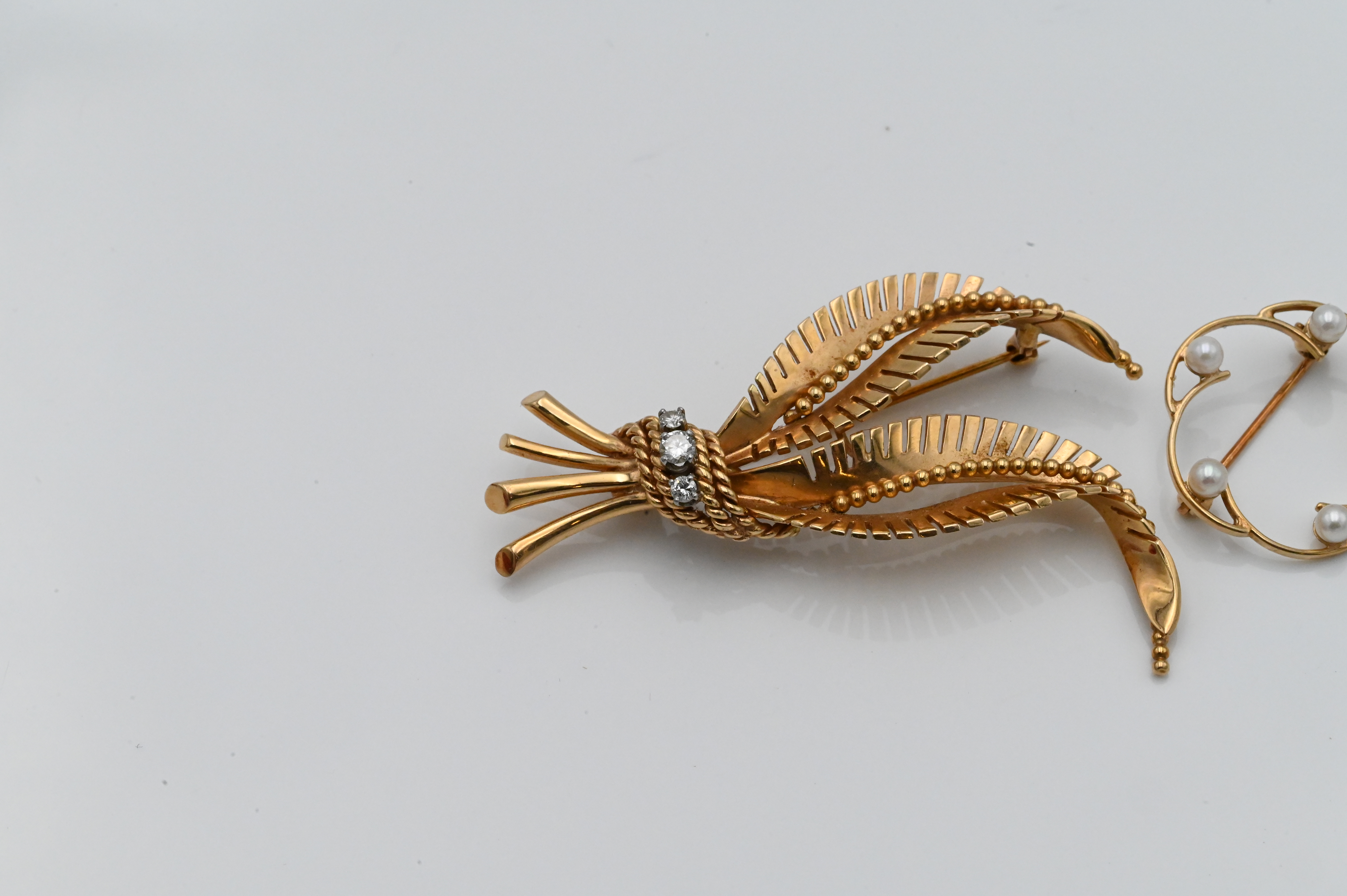 Two 14 Karat Yellow Gold Brooches, to include one with ferns and three diamonds, 10.9 grams.
