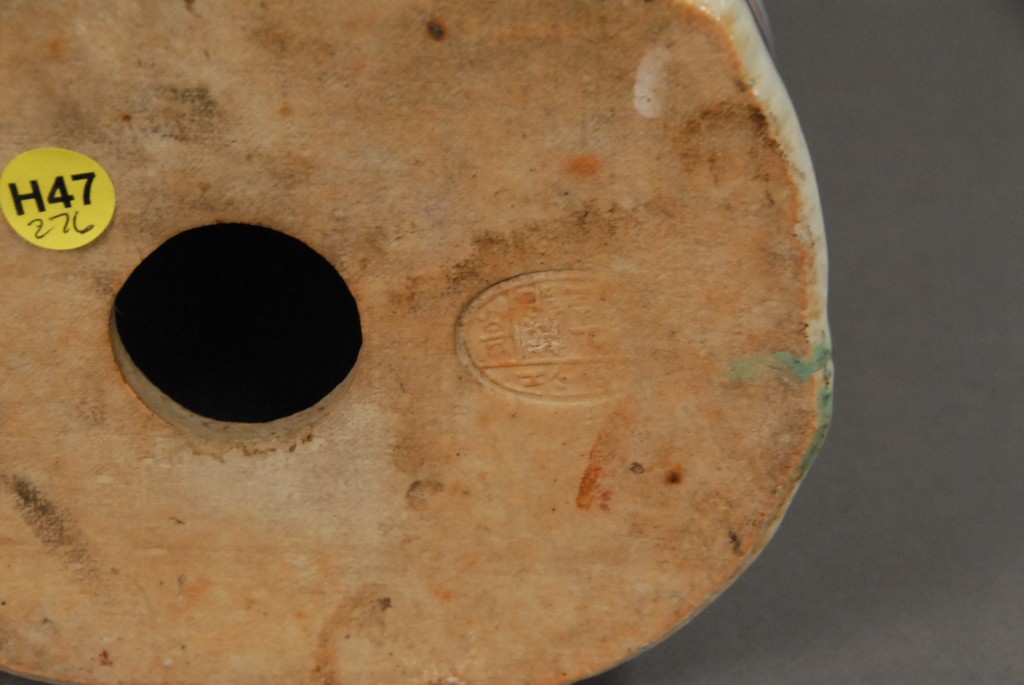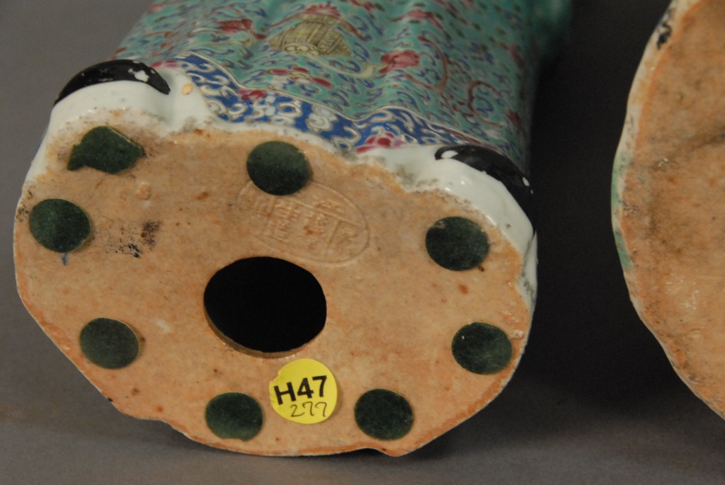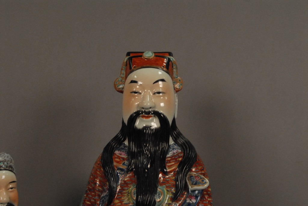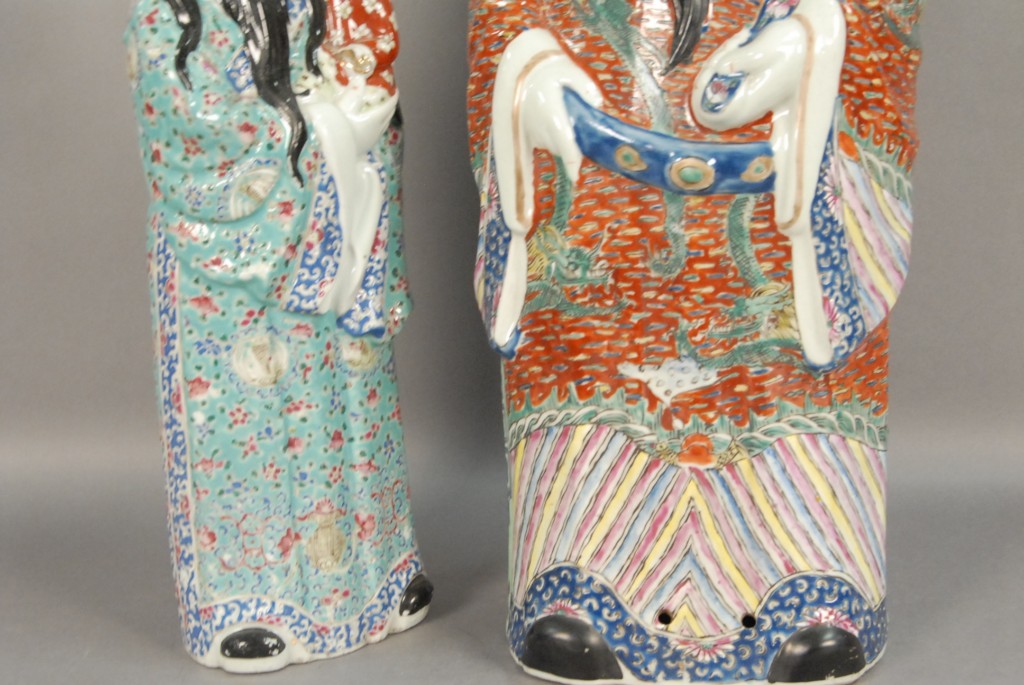Lot 129: Two Famille Rose porcelain figures of bearded men holding a boy, marked on bottom, one in turquois robe the other in a red robe, ht….