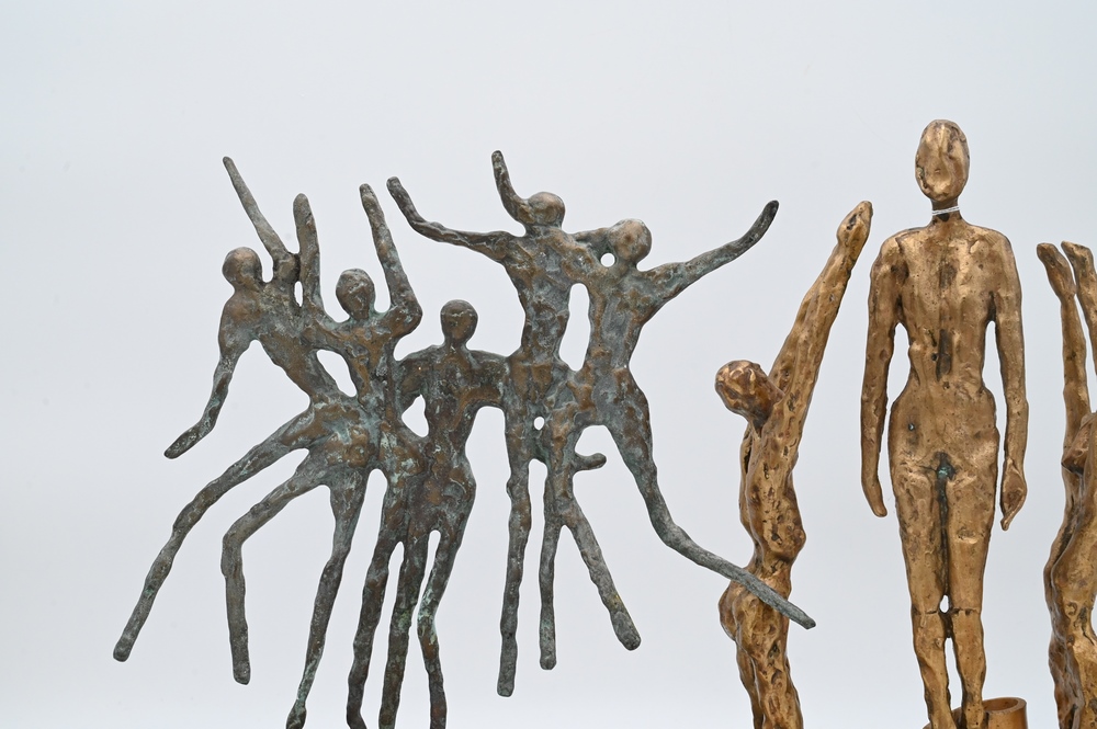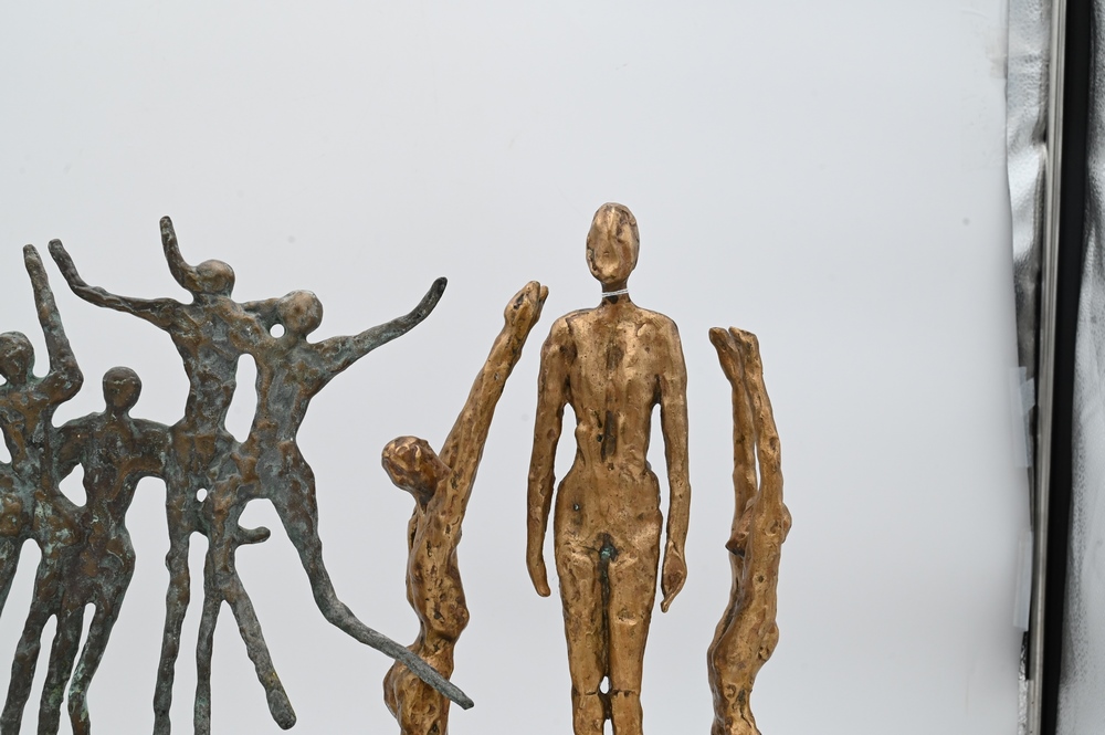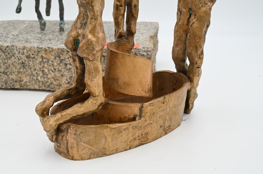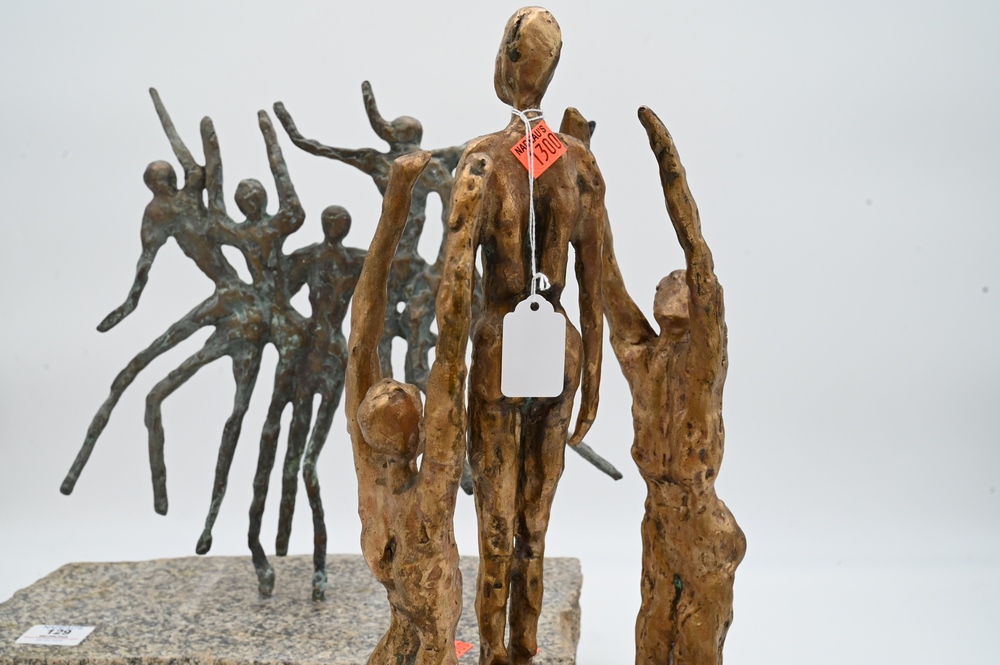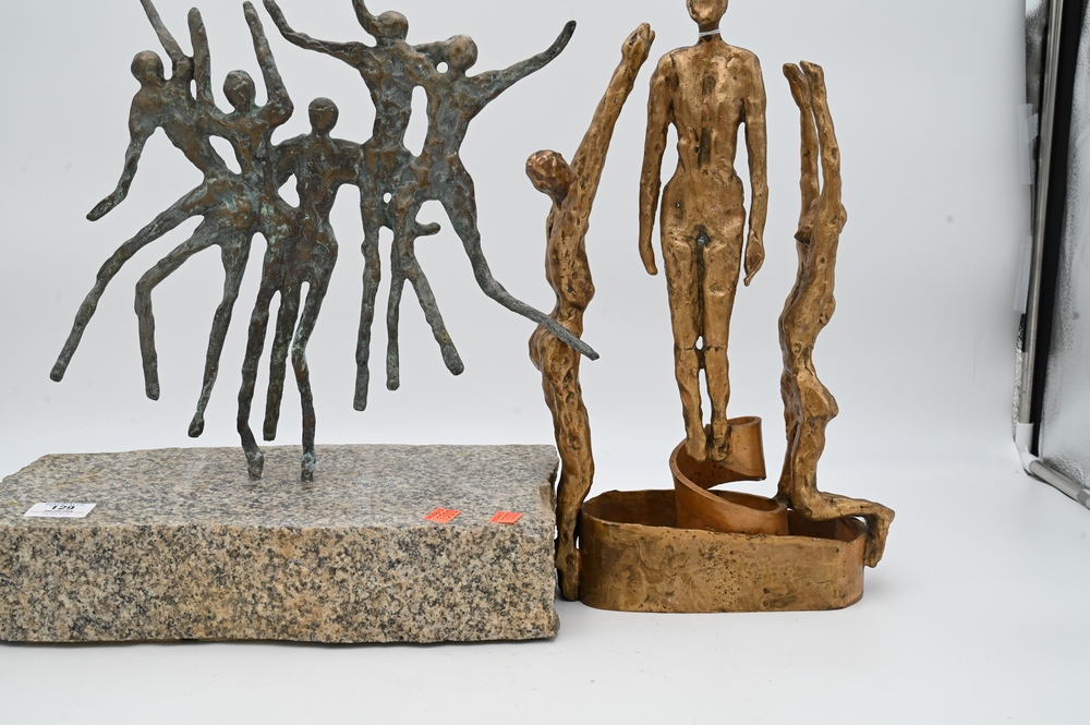 Two Mid Century Modern Figural Sculptures, five figures mounted on granite base, height 16 1/2 inches; along with a group of three gilt figures, height 16 3/4 inches.