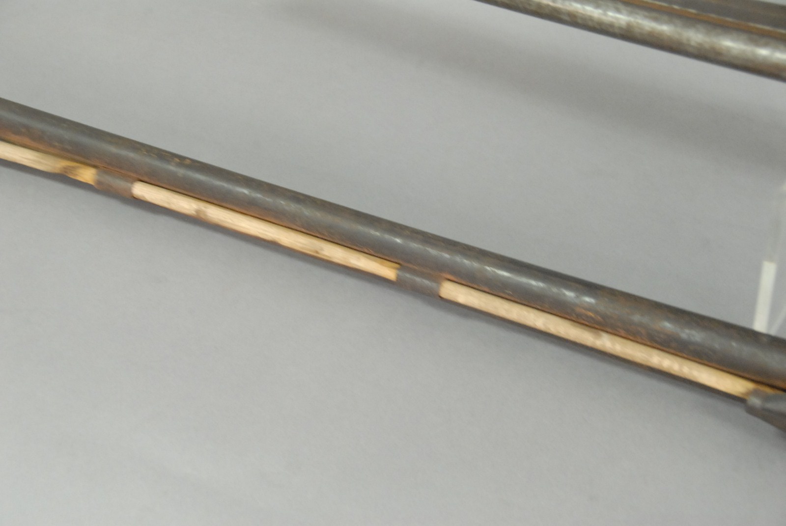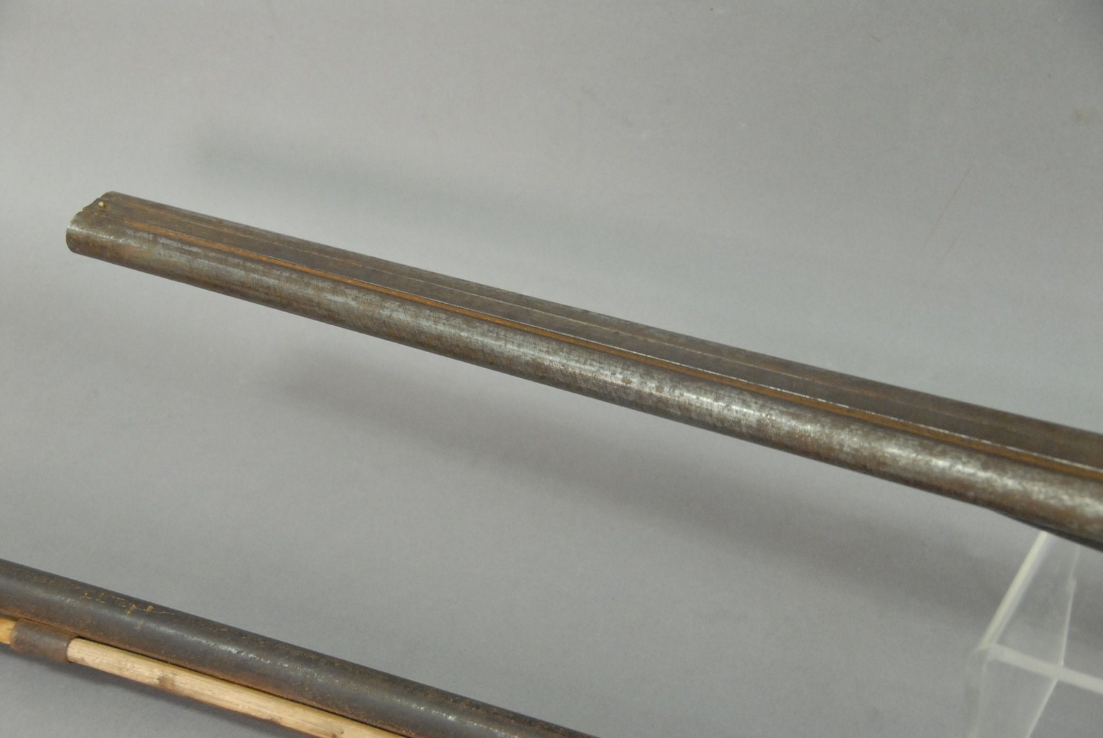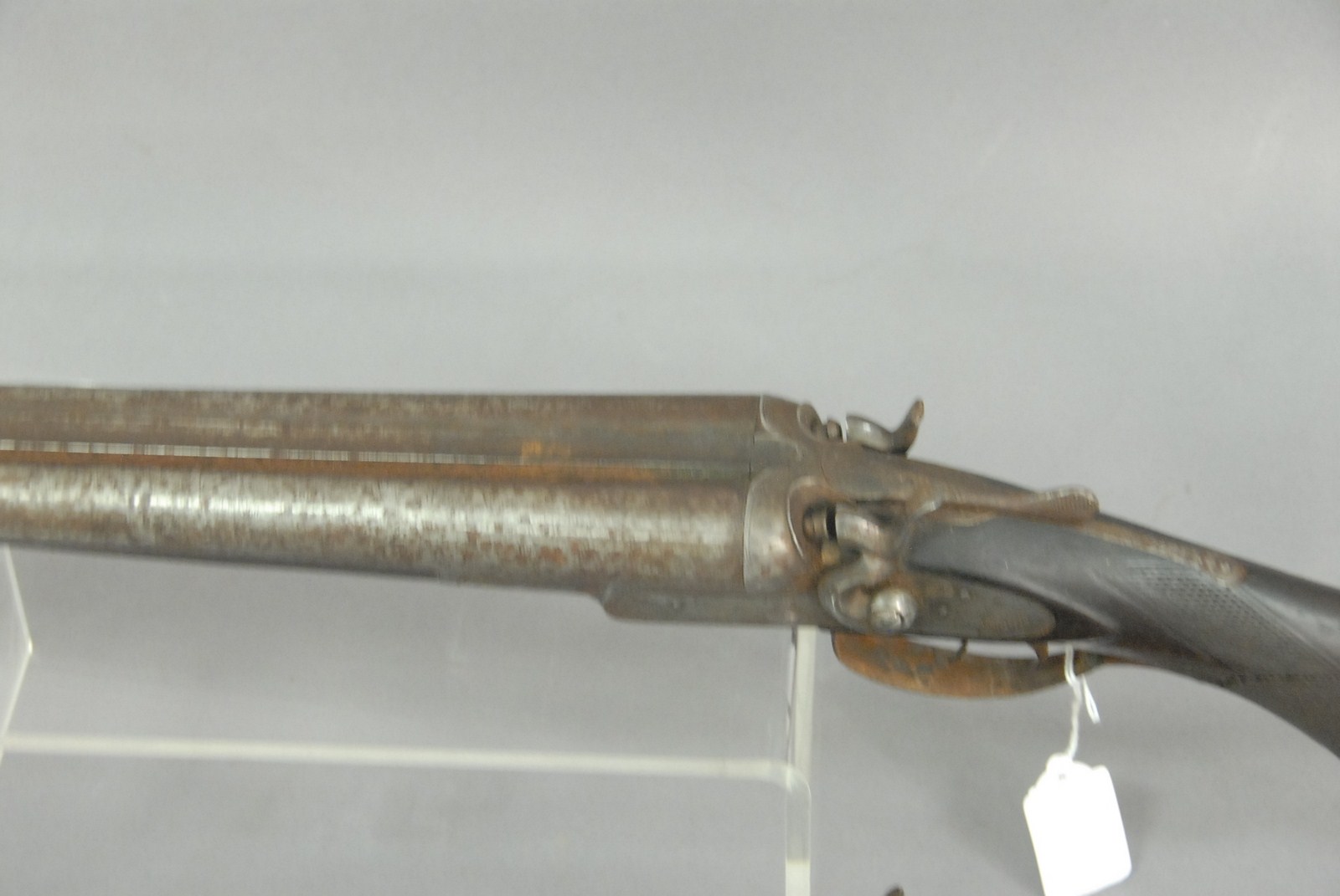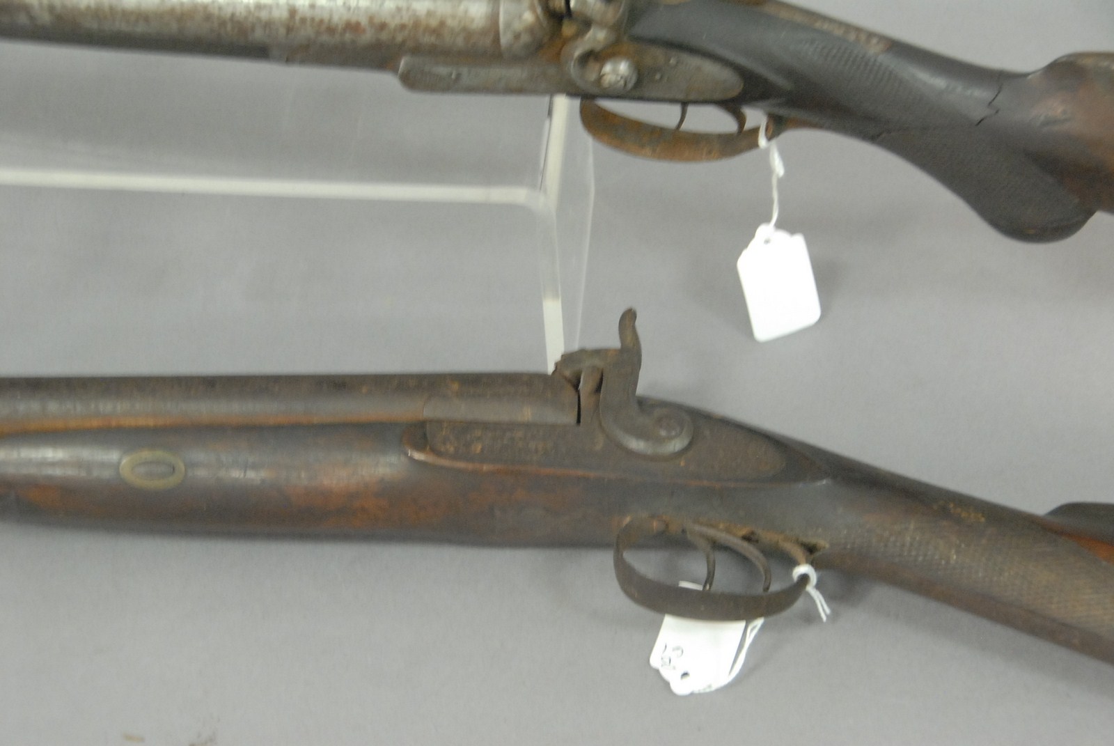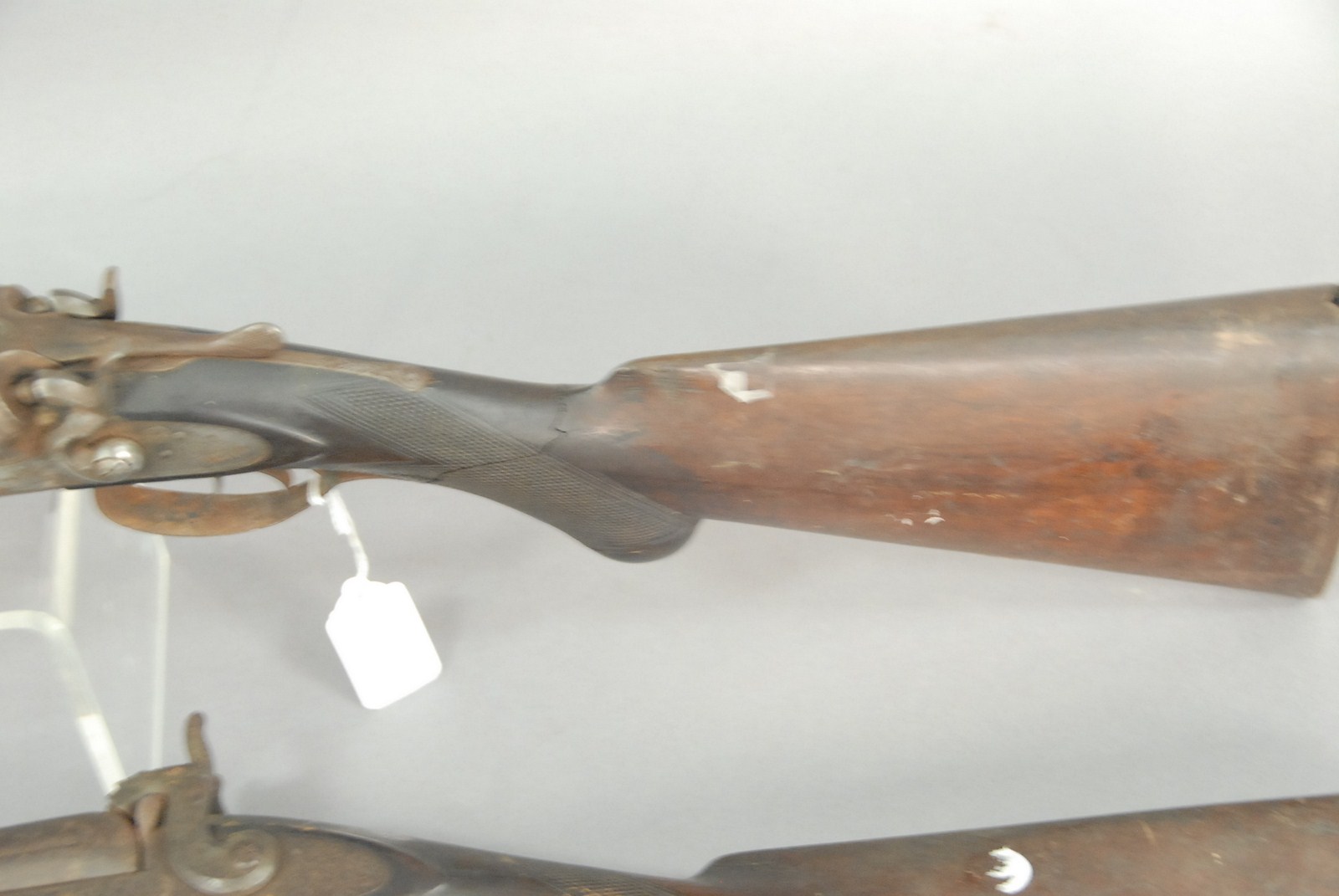 Two piece lot to include Bonehill London double barrell, 12 gauge hammer shotgun, broken butt stock and Double barrel percussion 12 gauge shotgun, as is.
