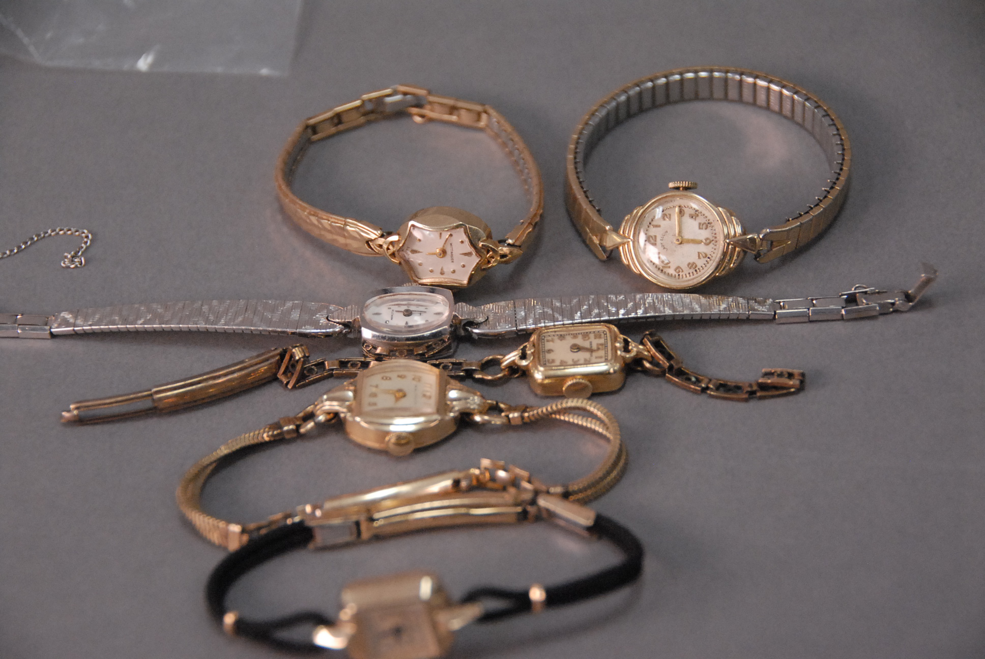Group of six ladies 14K gold wristwatches.