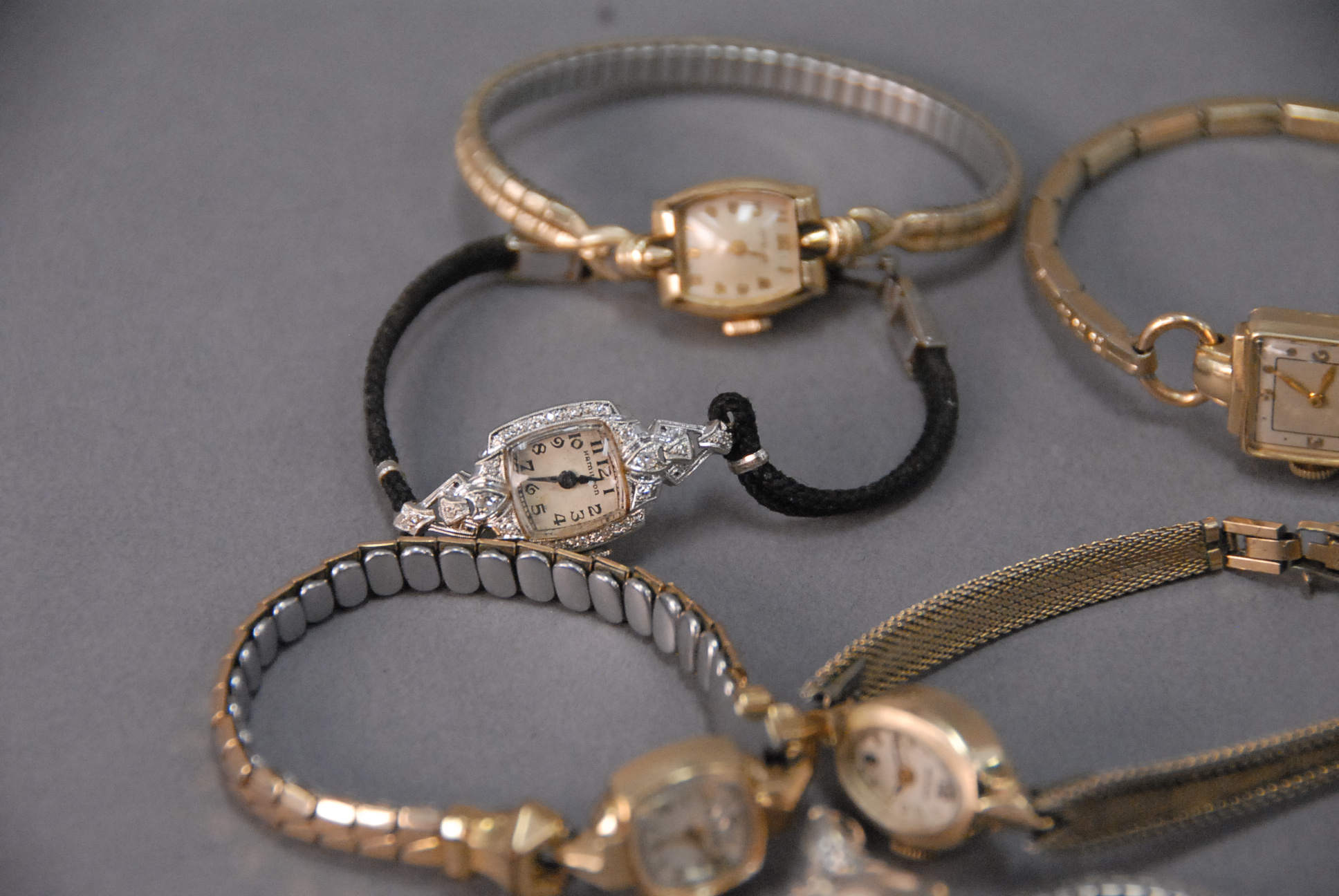 Lot 12B: Group of six ladies 14K gold wristwatches.