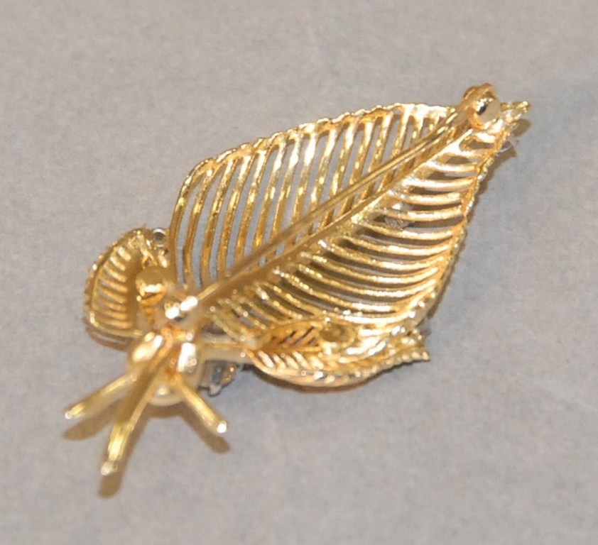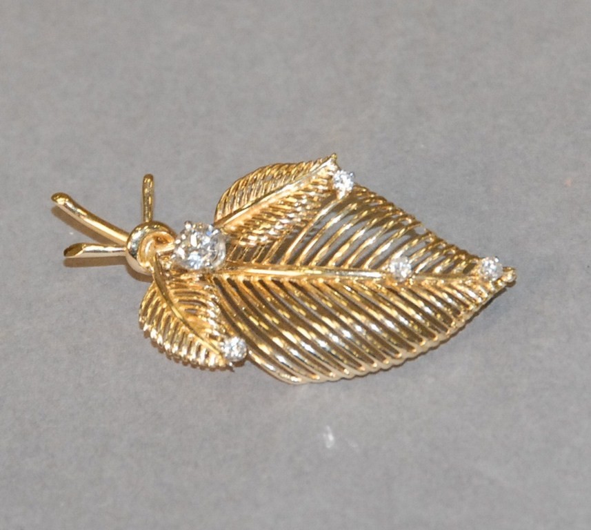 14kt gold and diamond leaf form pin with four diamonds, largest diamond is approximately .35 cts.