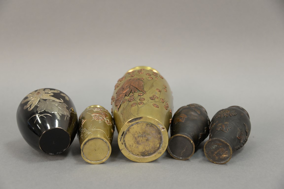 Five bronze vases including pair of multimetal Oriental style bronze vase with applied copper and brass leaf, flowers, and birds silver and copper overlay vase, possibly Heintz and two Asian bronze munted with copper birds and flowers. ht. 4 1/4in. to 8 1/2in.