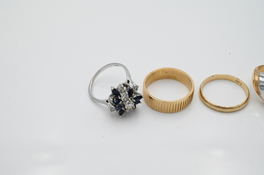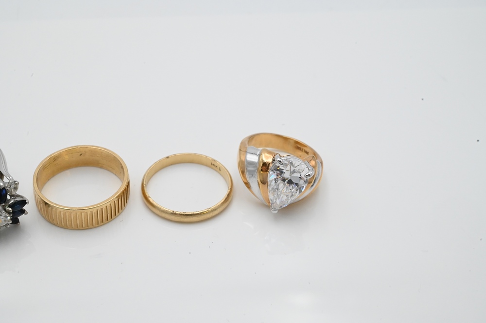 Lot 13: Four 14 Karat Rings, to include two with stones, one with large zirconia, 20.1 grams.