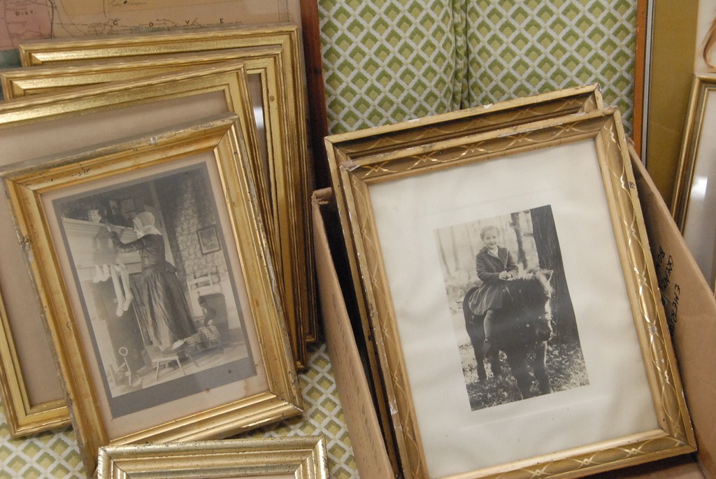 Four boxes of pictures and prints, mid century canlendars, and Bolton / Andover map.