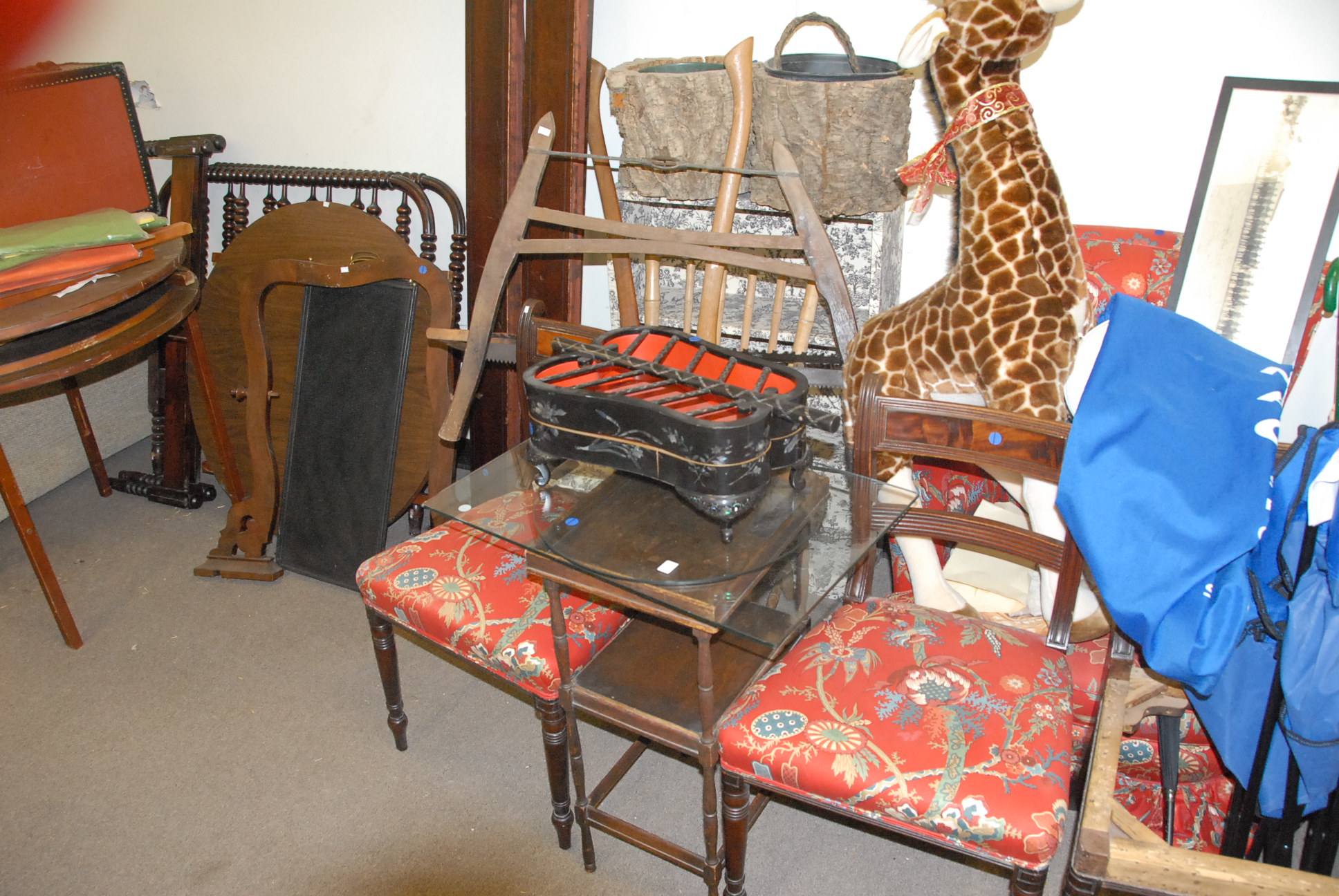 Group lot of furniture to include hanging shelves, tea cart, painted bookcase, three early Sheraton chairs, upholstered book case, Windsor armchair, bark planters, giraffe stuffed animal, umbrellas, and canes.