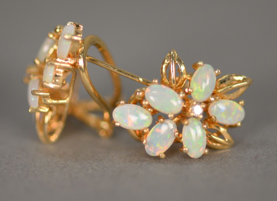 Lot 13: Pair of 14K gold and opal earrings. ht. 3/4 in.