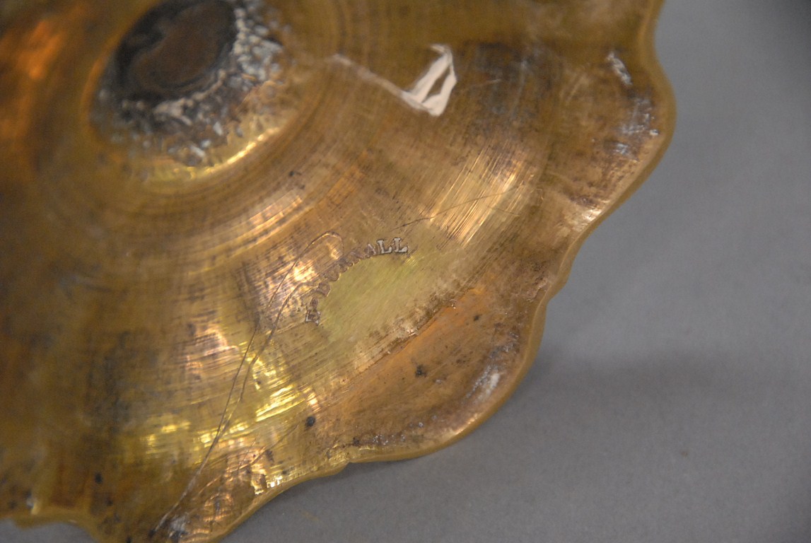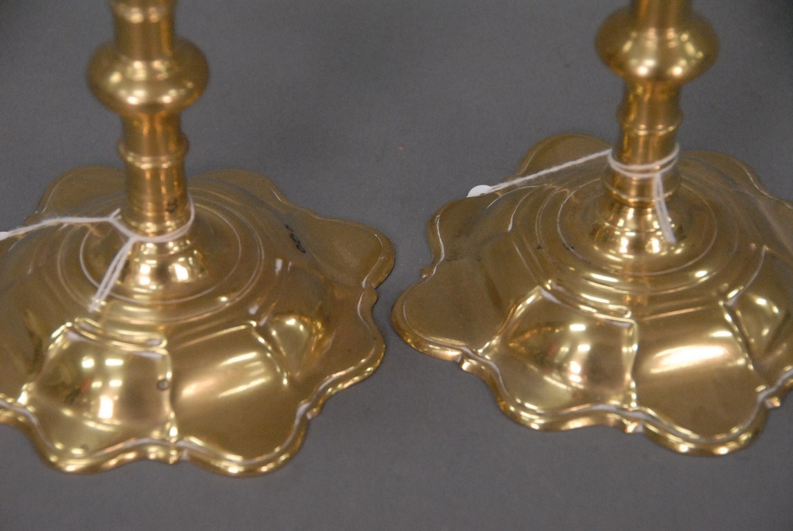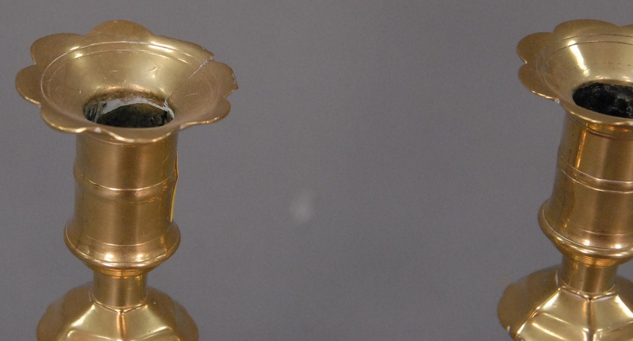 Lot 13: Pair of Durnall brass petal base candlesticks marked underneath E. Durnall, 18th century. ht. 9in. From the collection of…