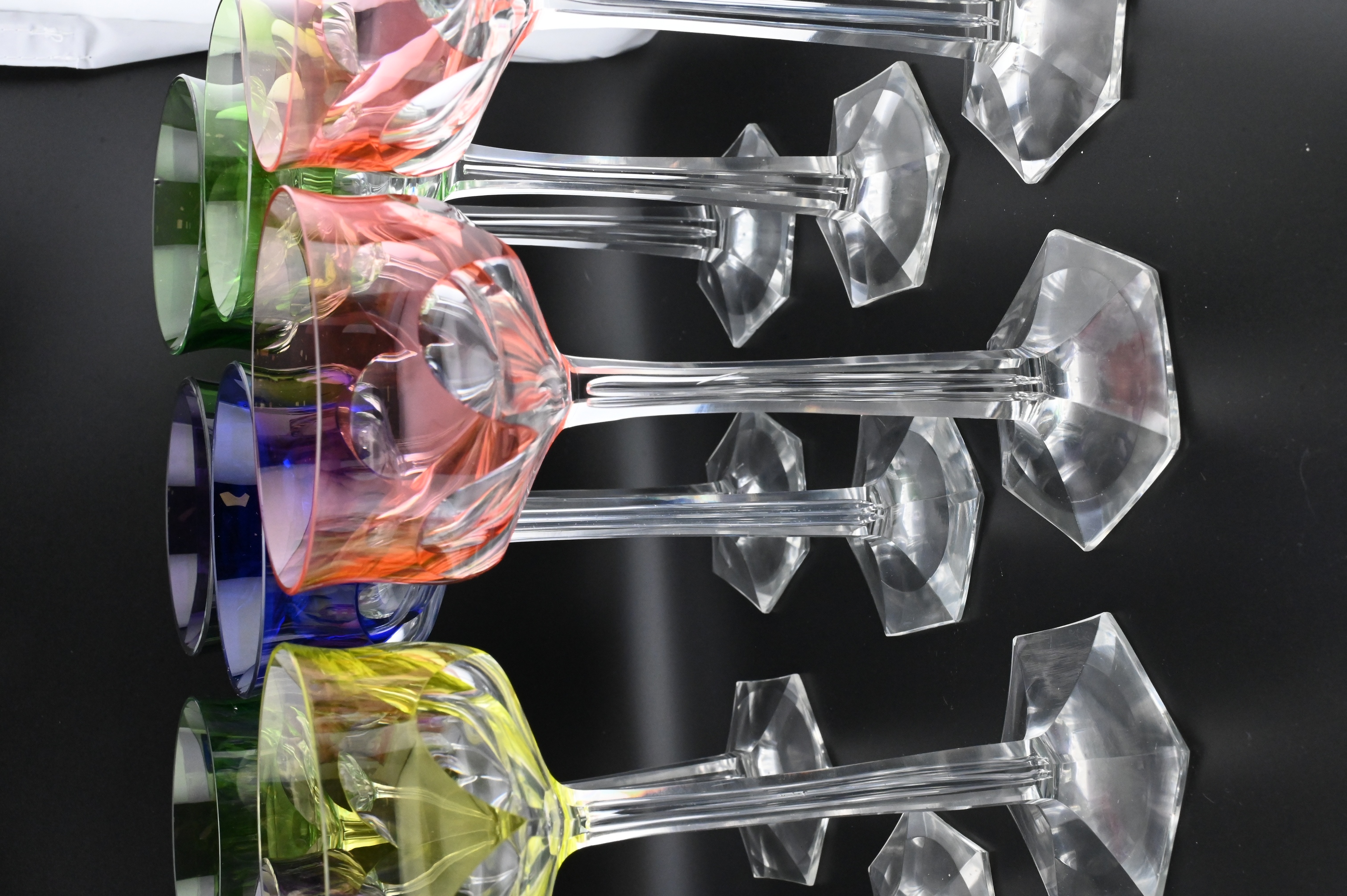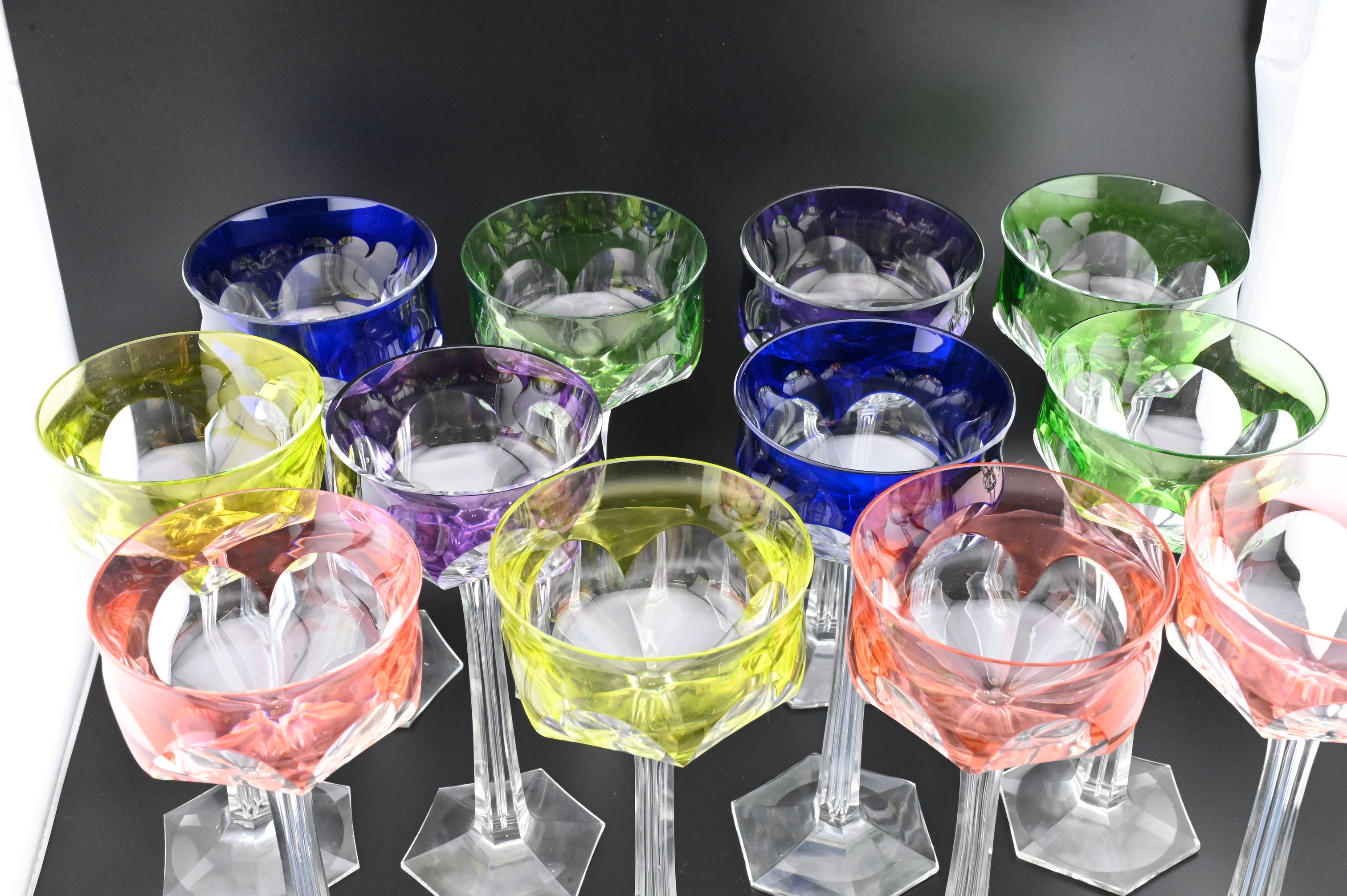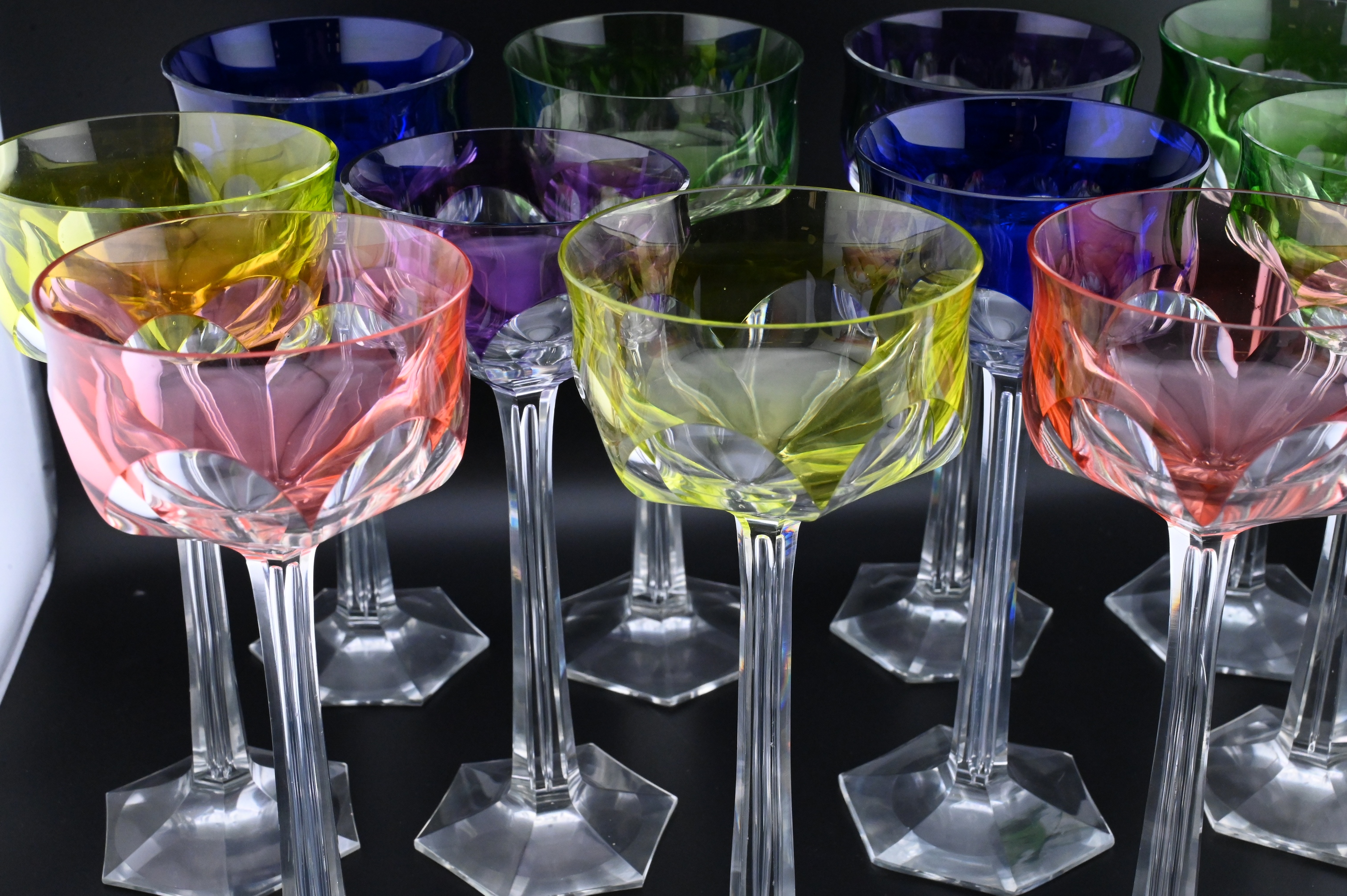 group of twelve tall hock goblets, each with a paneled clear stem and a brightly flashed and cut bowl in assorted colors including amethyst, green, orange, and blue, classic Bohemian form with strong decorative appeal