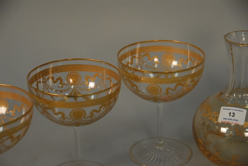 Lot 13: Six piece set of gold decorated crystal.