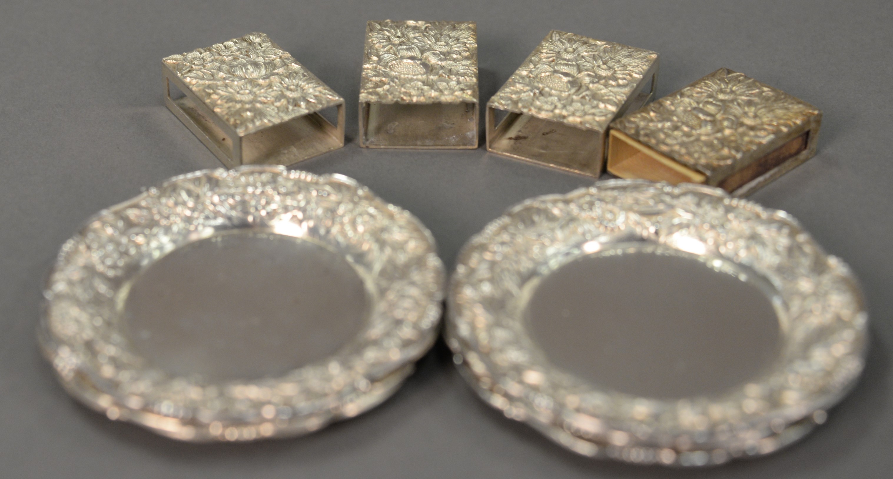 Ten piece lot of sterling silver kirk repousse including six coasters and four matchbox holders. 10.3 t oz.