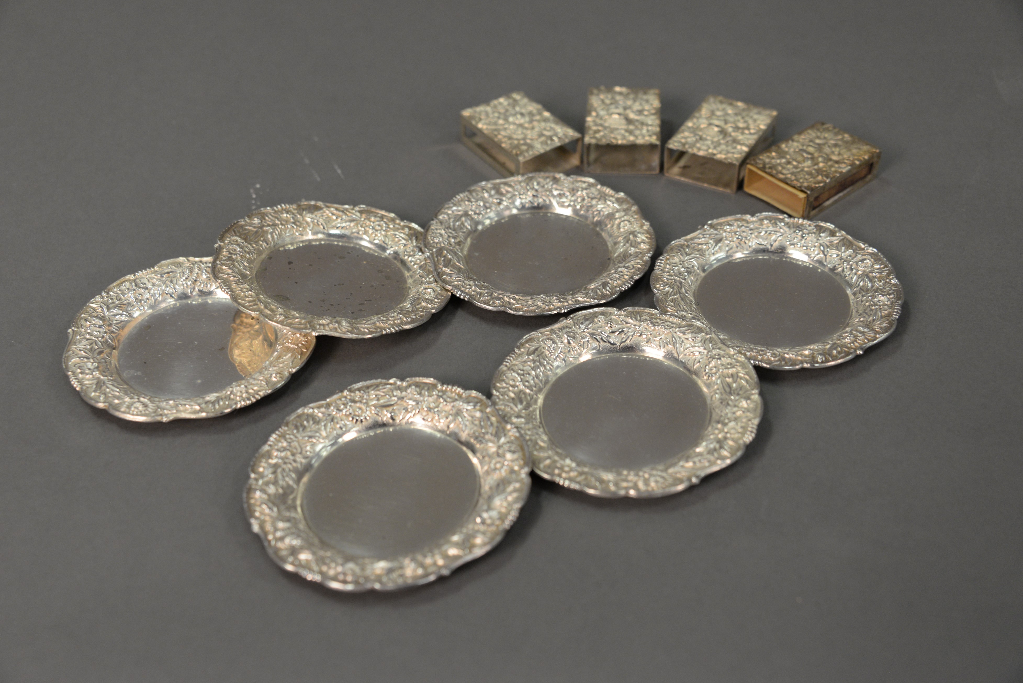 Lot 13: Ten piece lot of sterling silver kirk repousse including six coasters and four matchbox holders. 10.3 t oz.