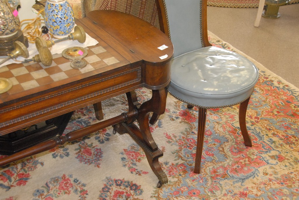 Lot 13: Three piece gaming set mahogany leather inlaid gaming table and leather upholstered side chairs some buttons missing on seats.