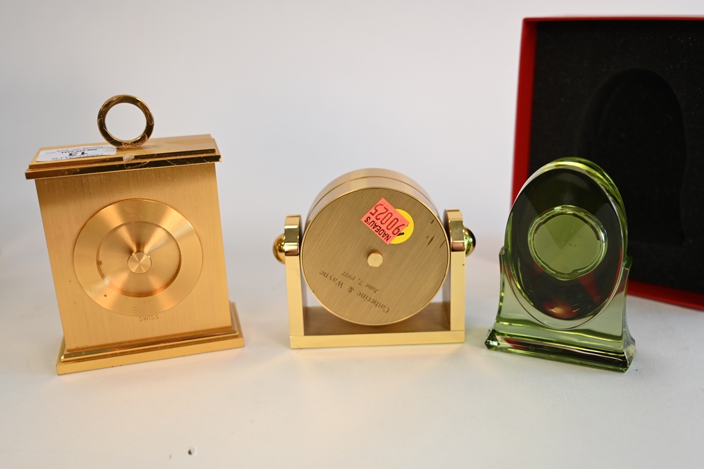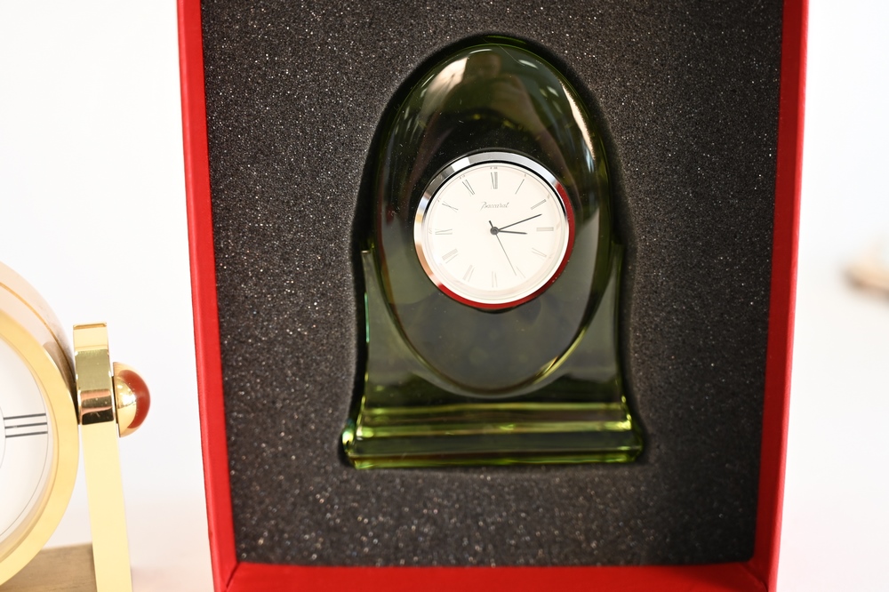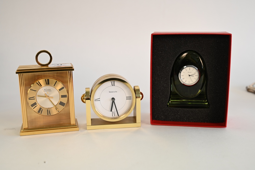 Lot 13: Three Piece Lot of Desk Clocks, to include a round Tiffany and Company, inscribed on the reverse, a rectangle Bolova, along with a green glass Baccarat, in original box, tallest 4 1/2 inches.