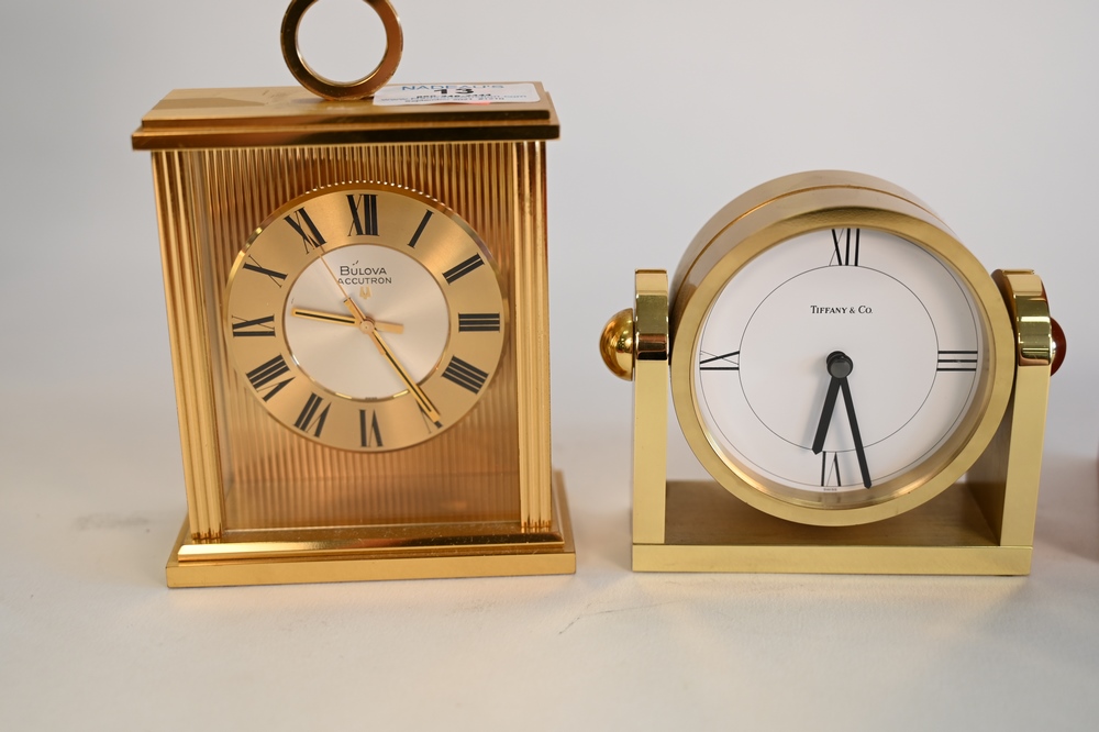 Three Piece Lot of Desk Clocks, to include a round Tiffany and Company, inscribed on the reverse, a rectangle Bolova, along with a g…