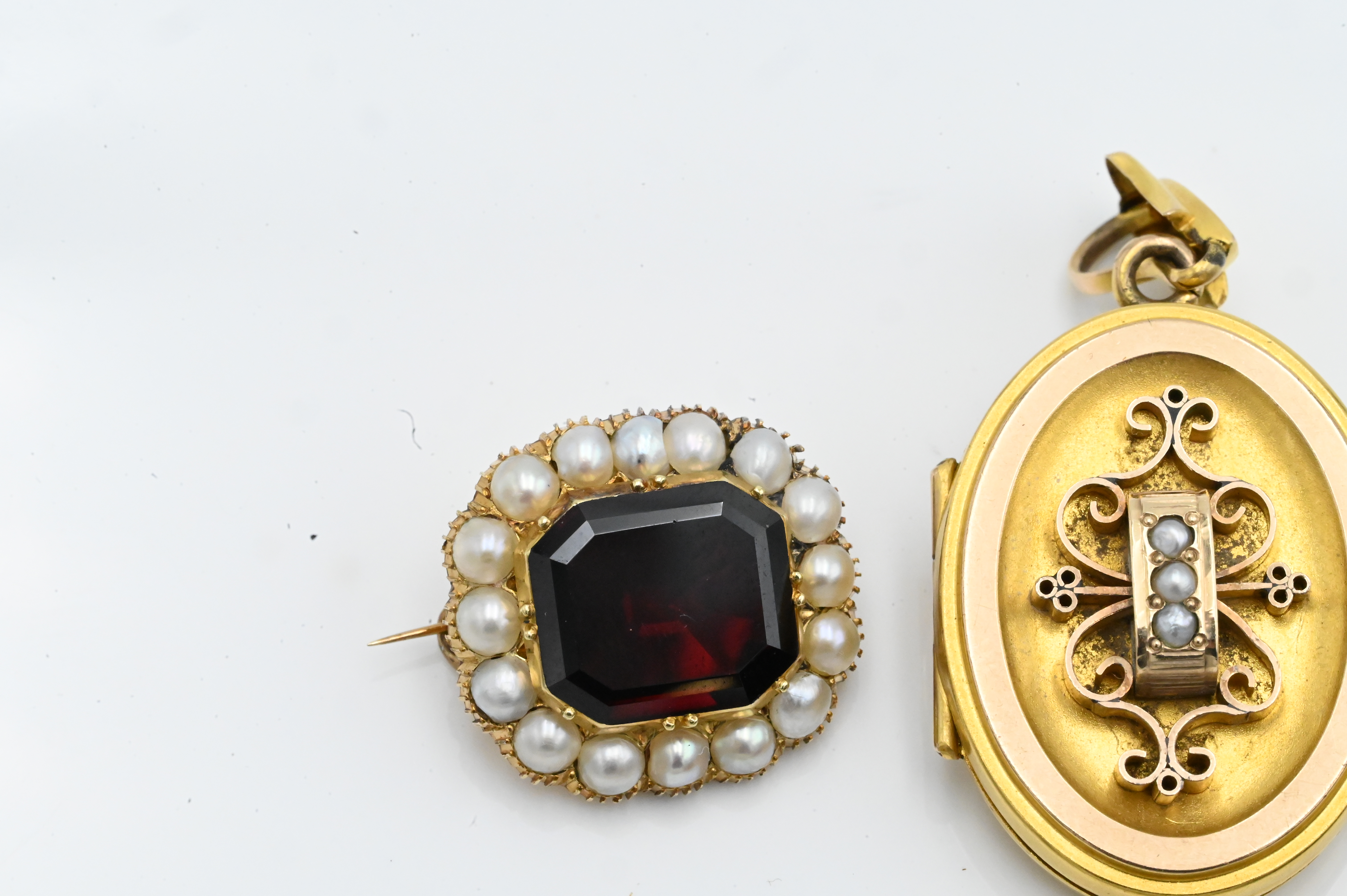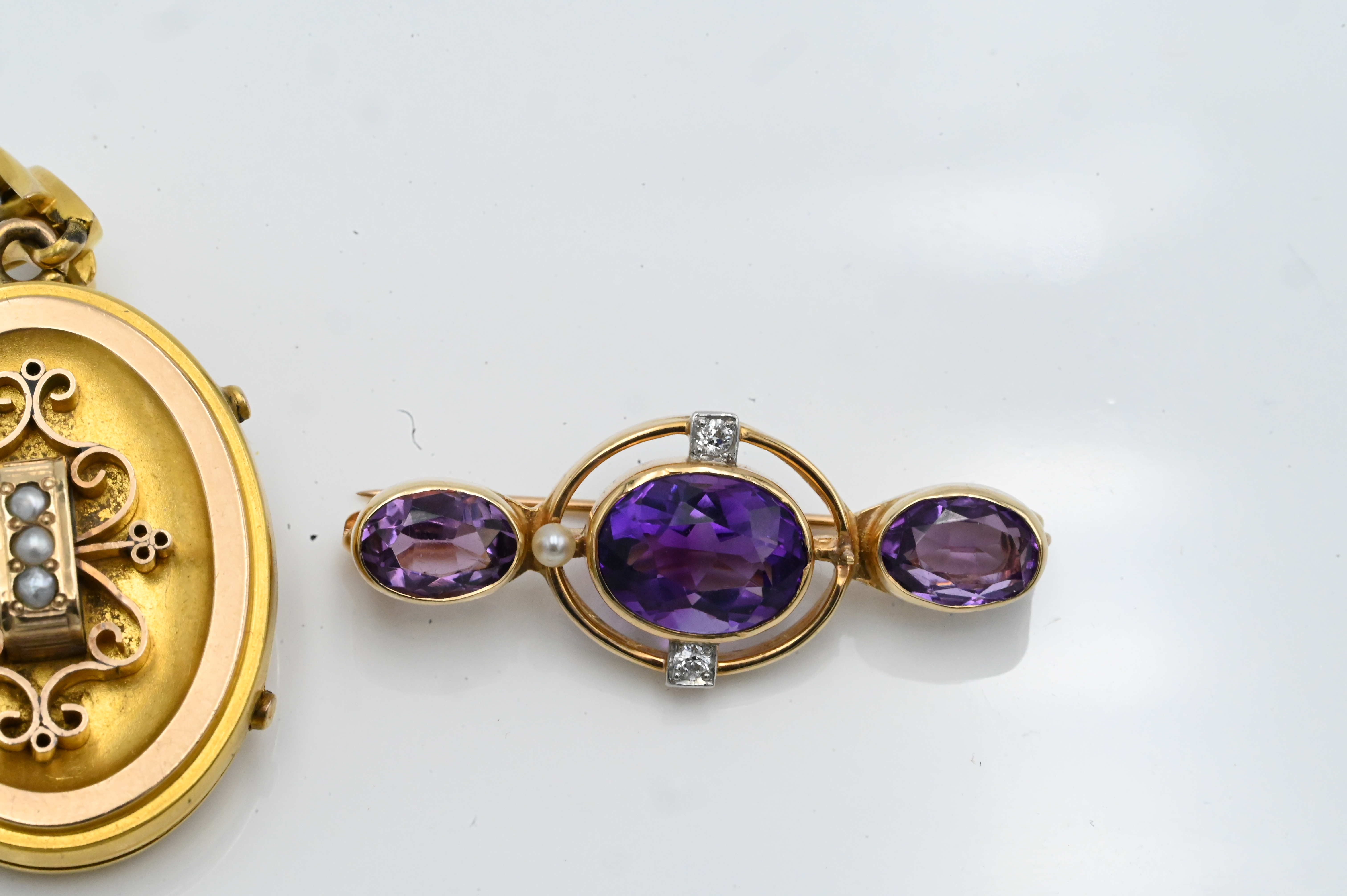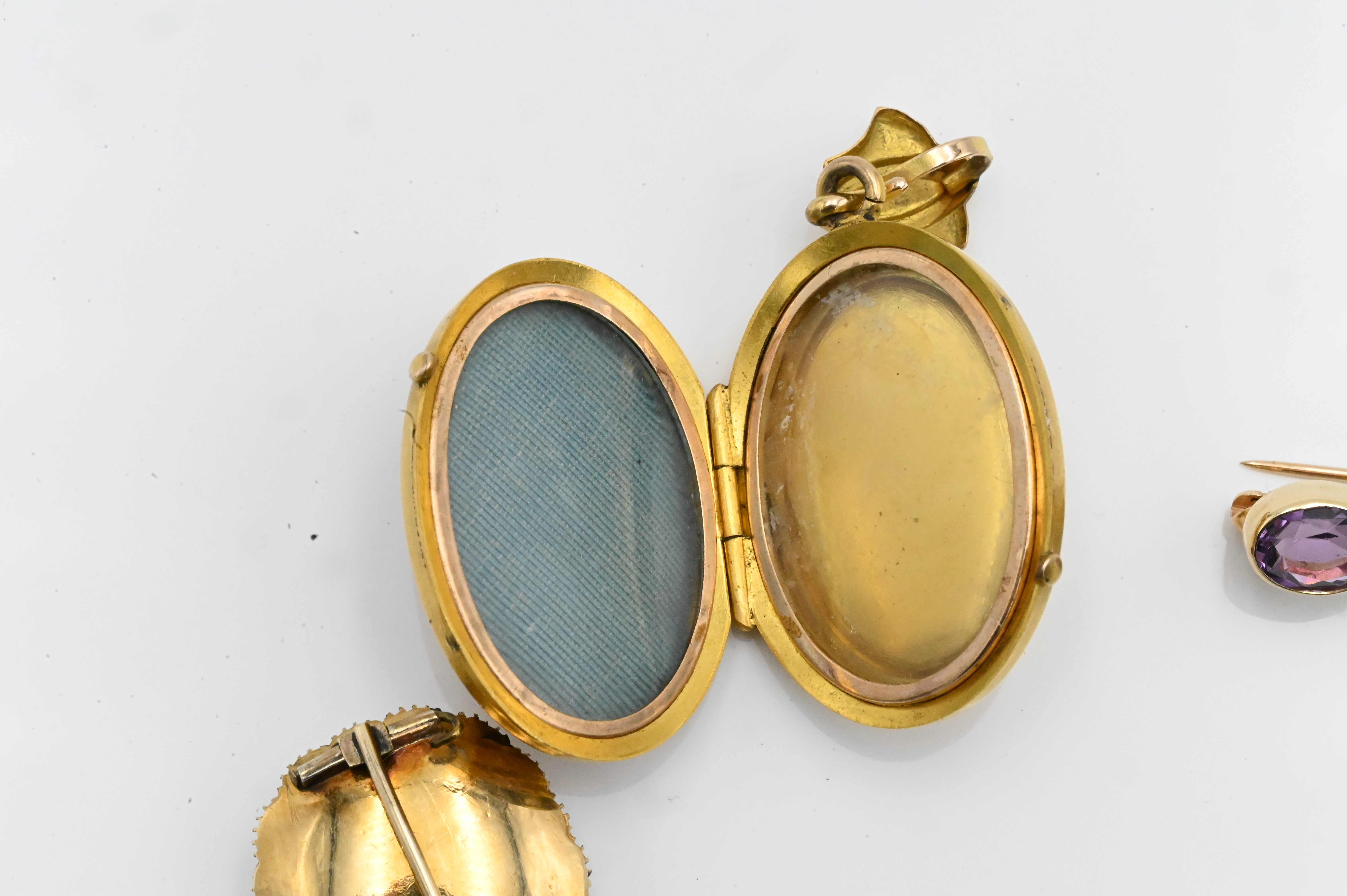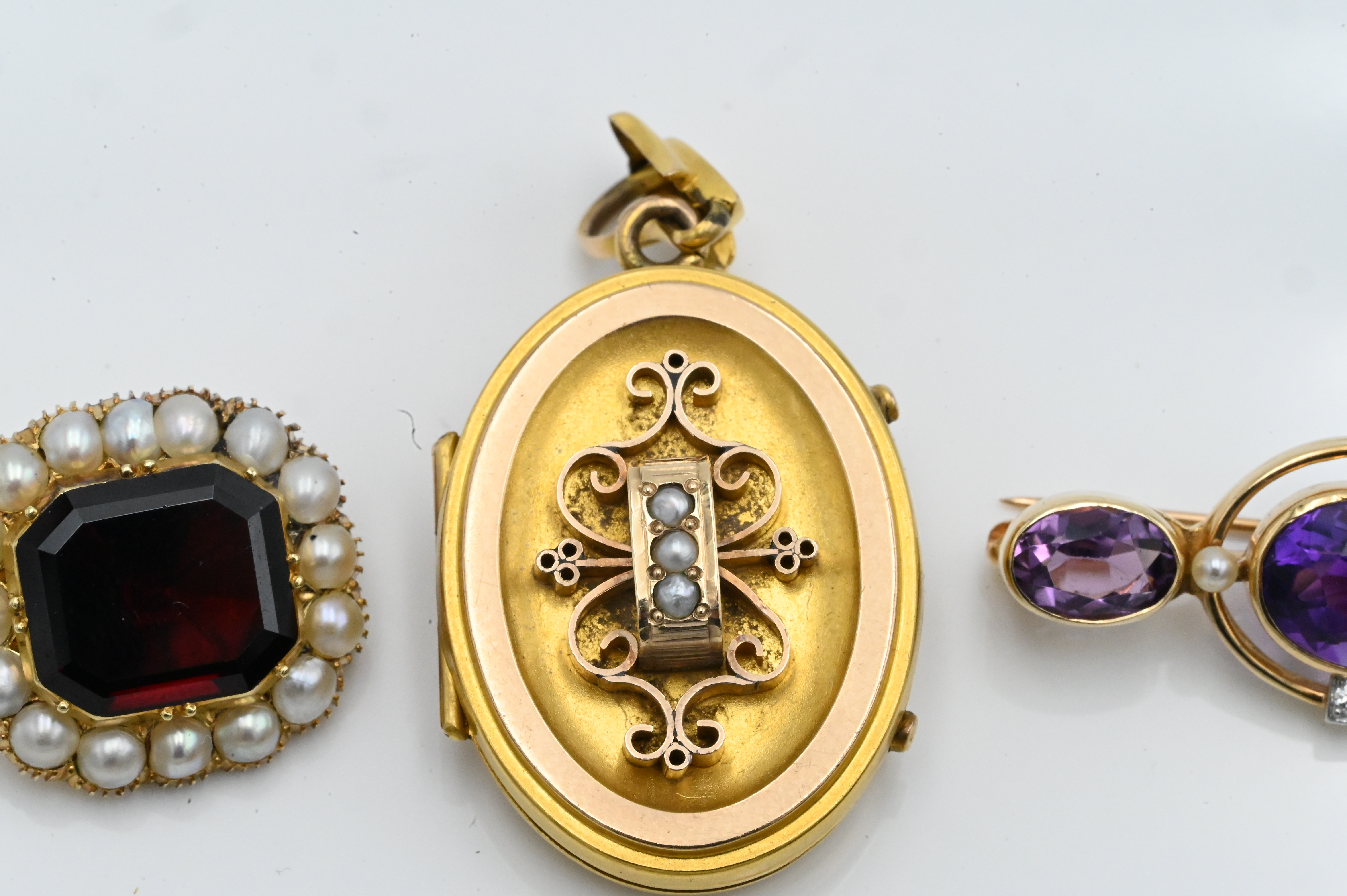 Three Piece Lot, to include two yellow gold brooches set with stone along with one locket, total weight 24.8 grams.