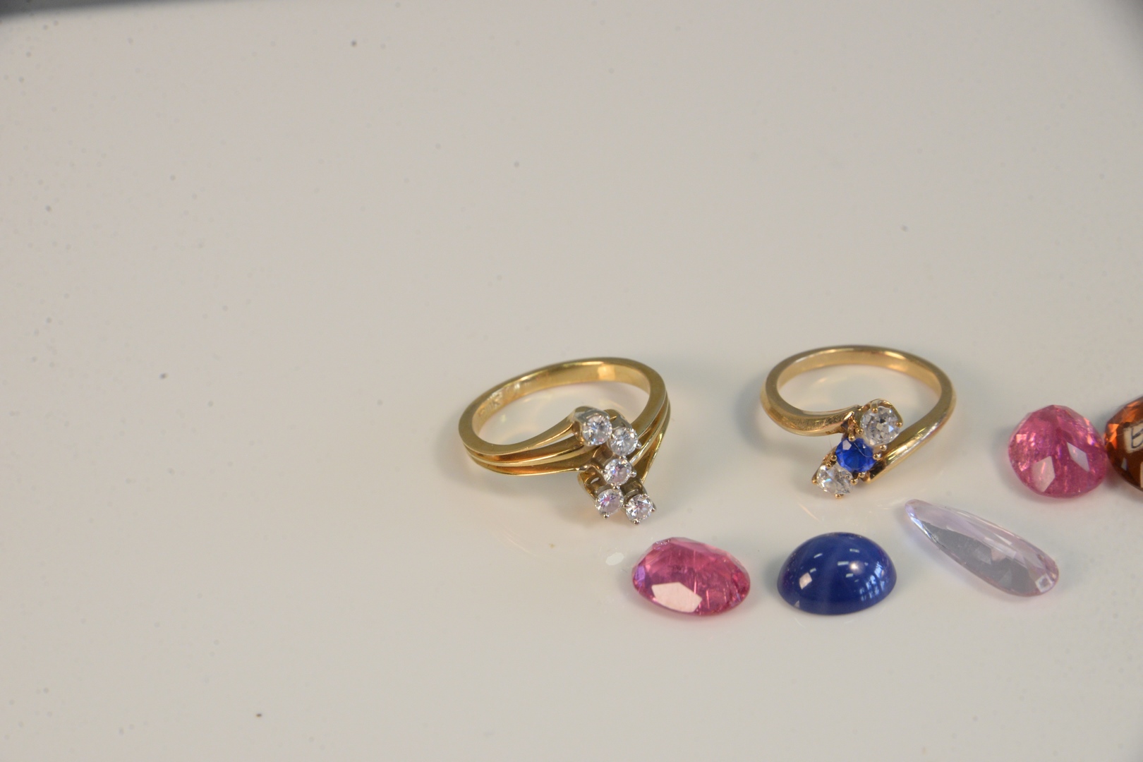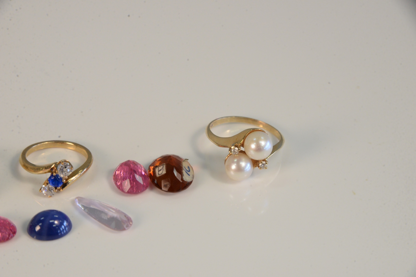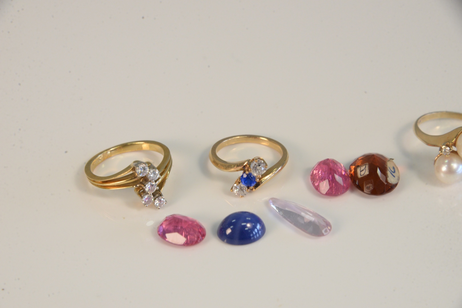 Lot 13: Three rings to include one set with five diamonds, one set with two pearls and two diamonds, one with diamond and blue stone plus fi…