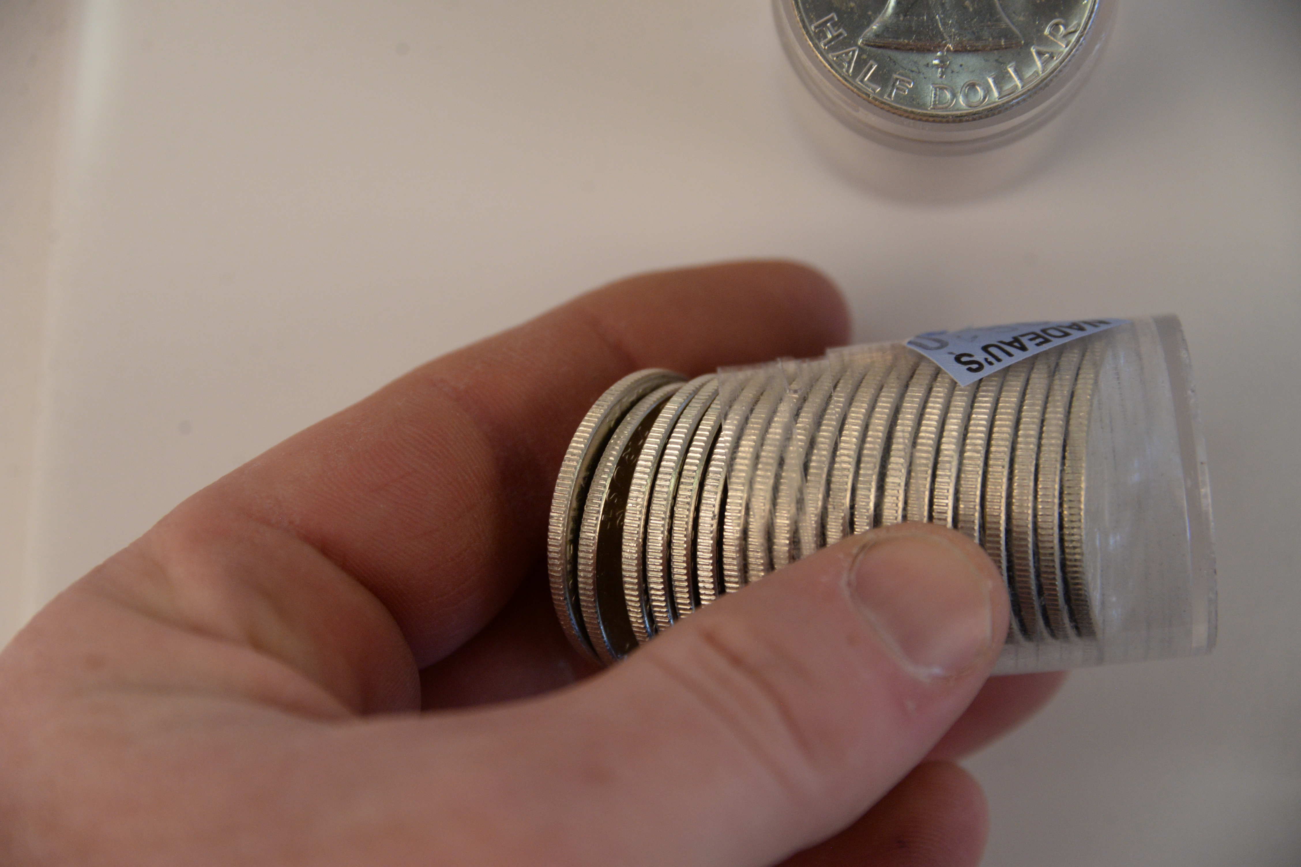 Three Rolls of Franklin Silver Half Dollars, two 1962 D, AU 1963 D, AU.