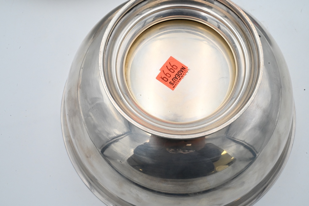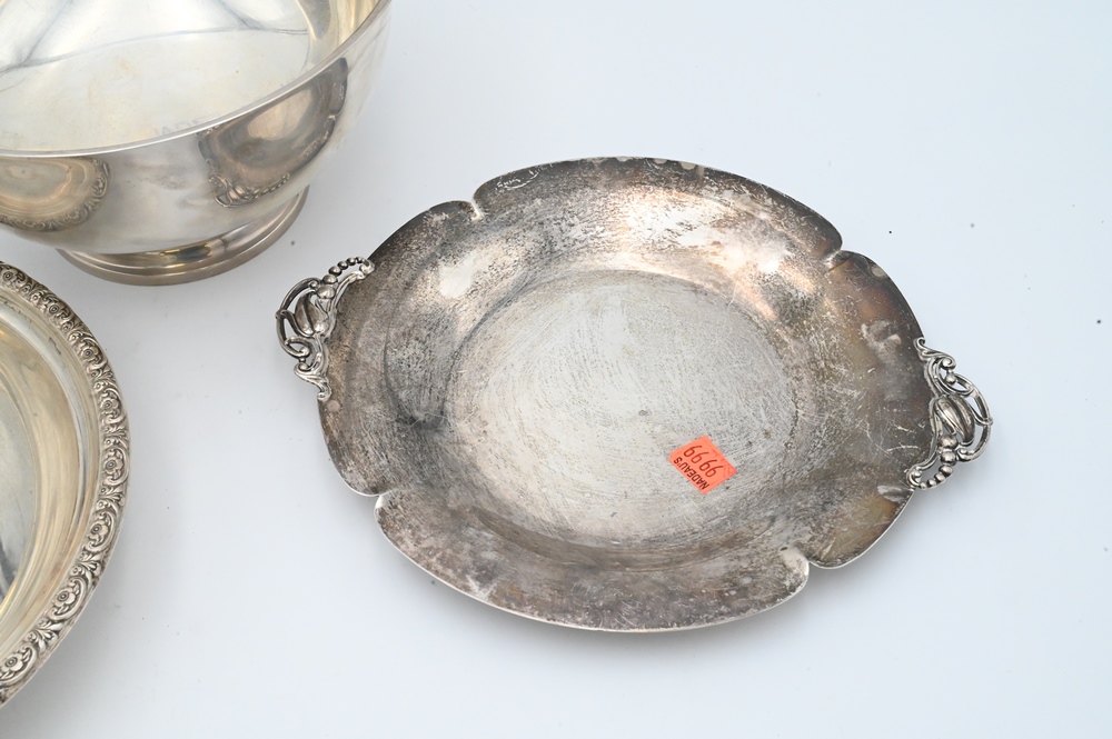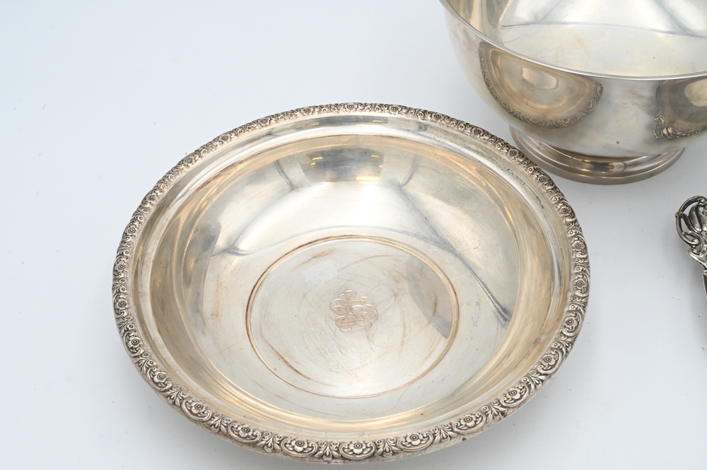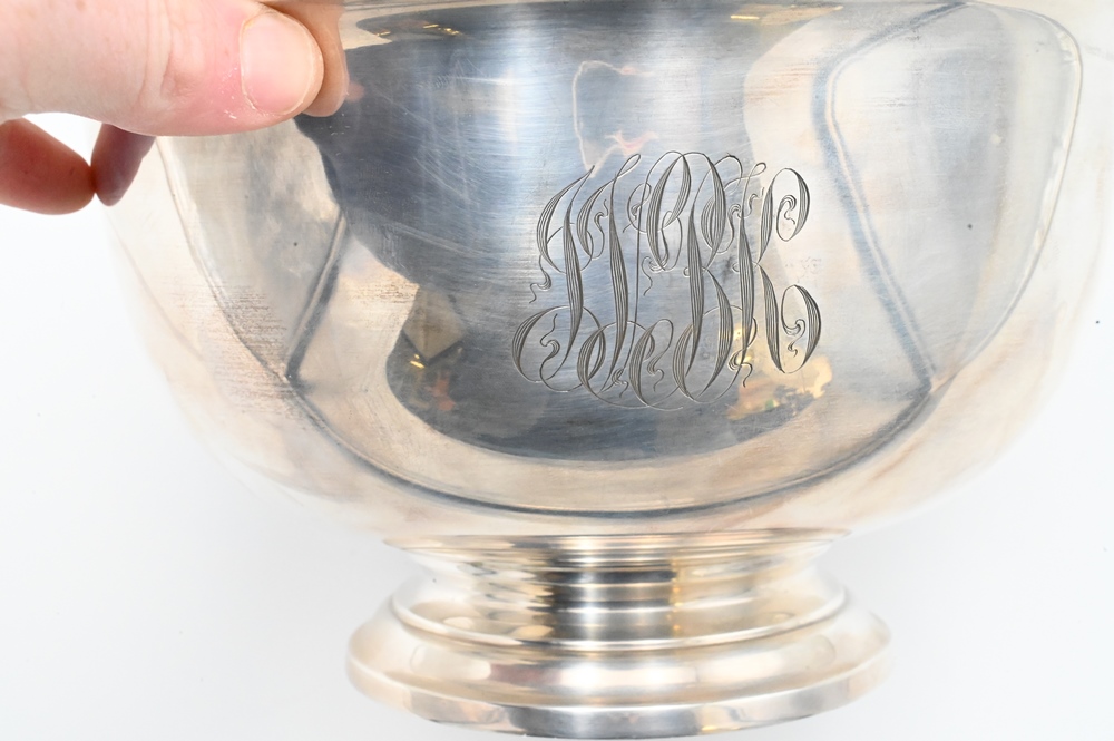 Lot 13: Three Sterling Silver Pieces, to include a large Paul Revere bowl, a Whiting Danish style tray, along with an International Sterling Prelude bowl, 39.9 t.oz, tray length 10 1/2 inches.