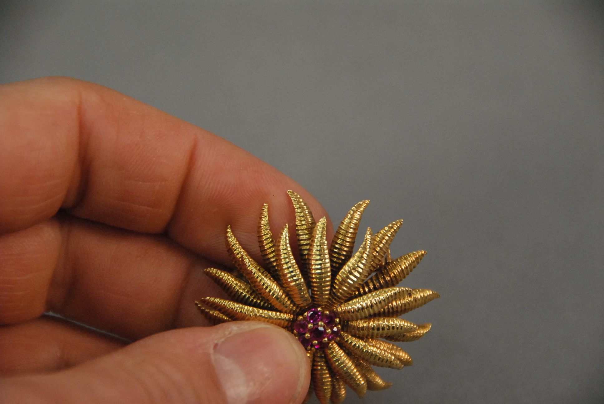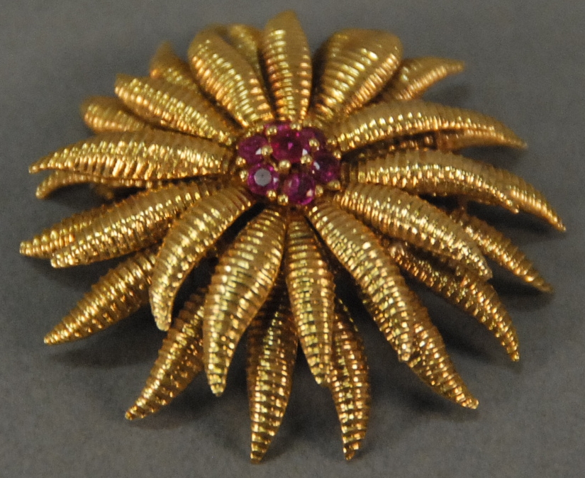 Lot 13: Tiffany 18K gold pair of floral pins, center set with 7 small rubies, pins marked Tiffany & Co. Italy. 33.7 grams