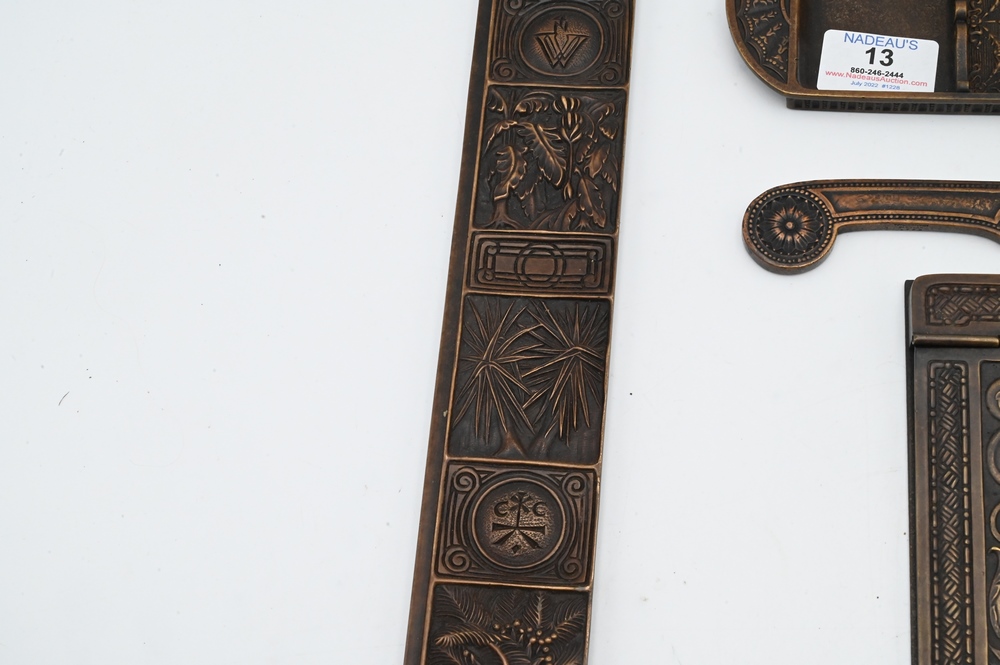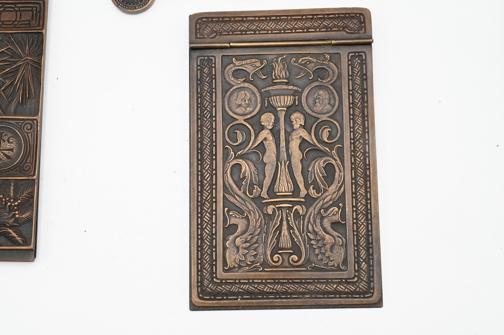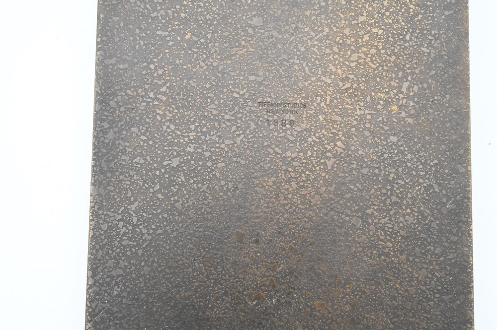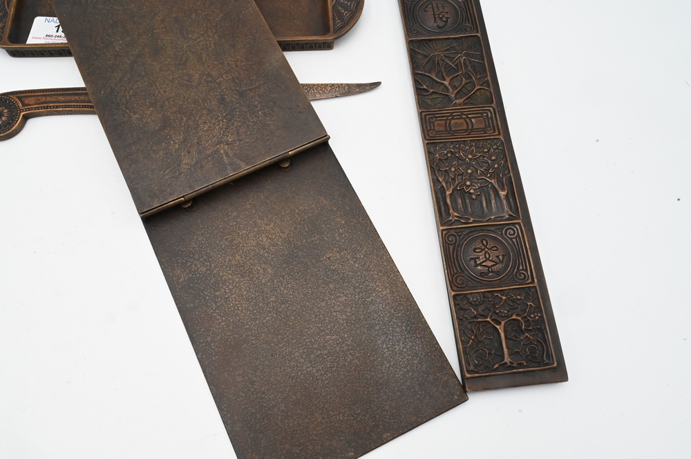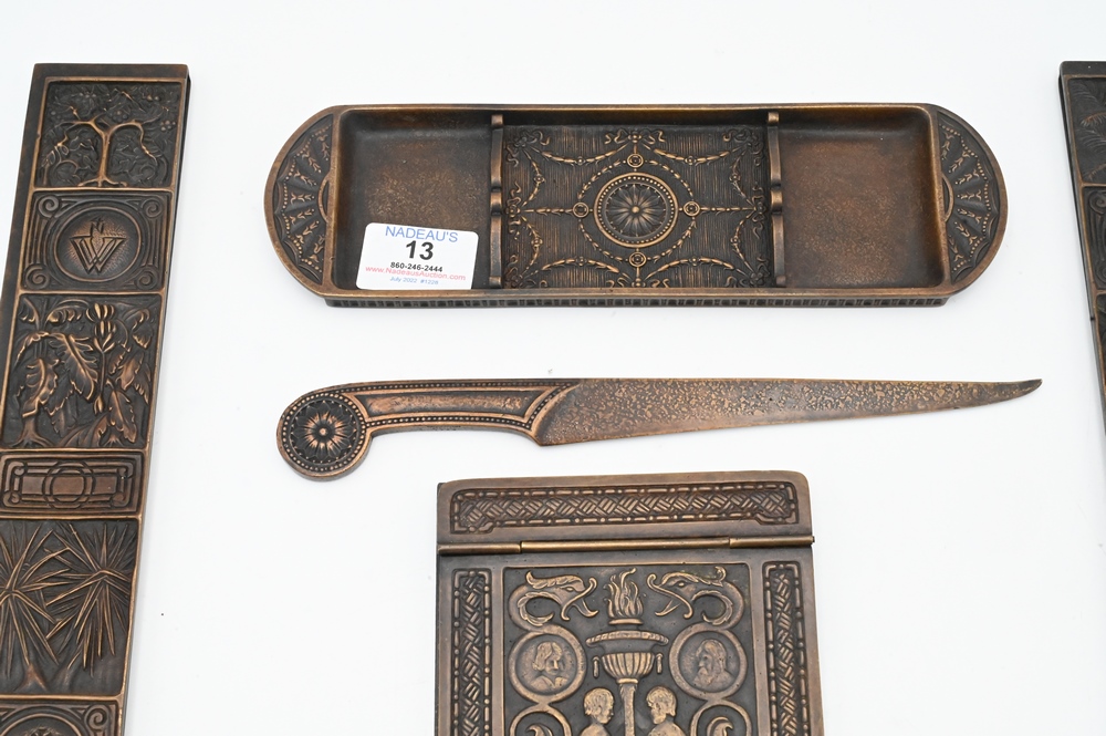 Tiffany Studios Five Piece Bronze Desk Set, to include blotter ends, 12 inches; pen tray; letter opener; along with a notebook holder.