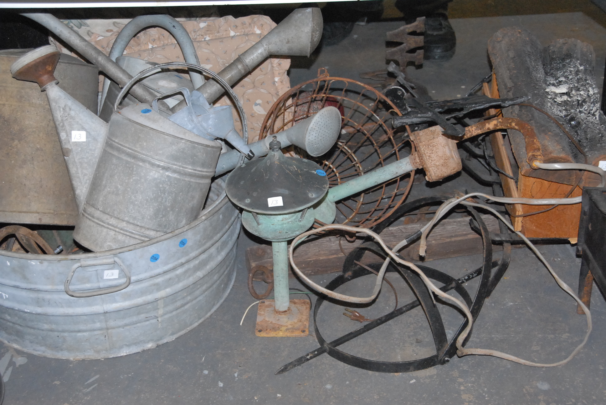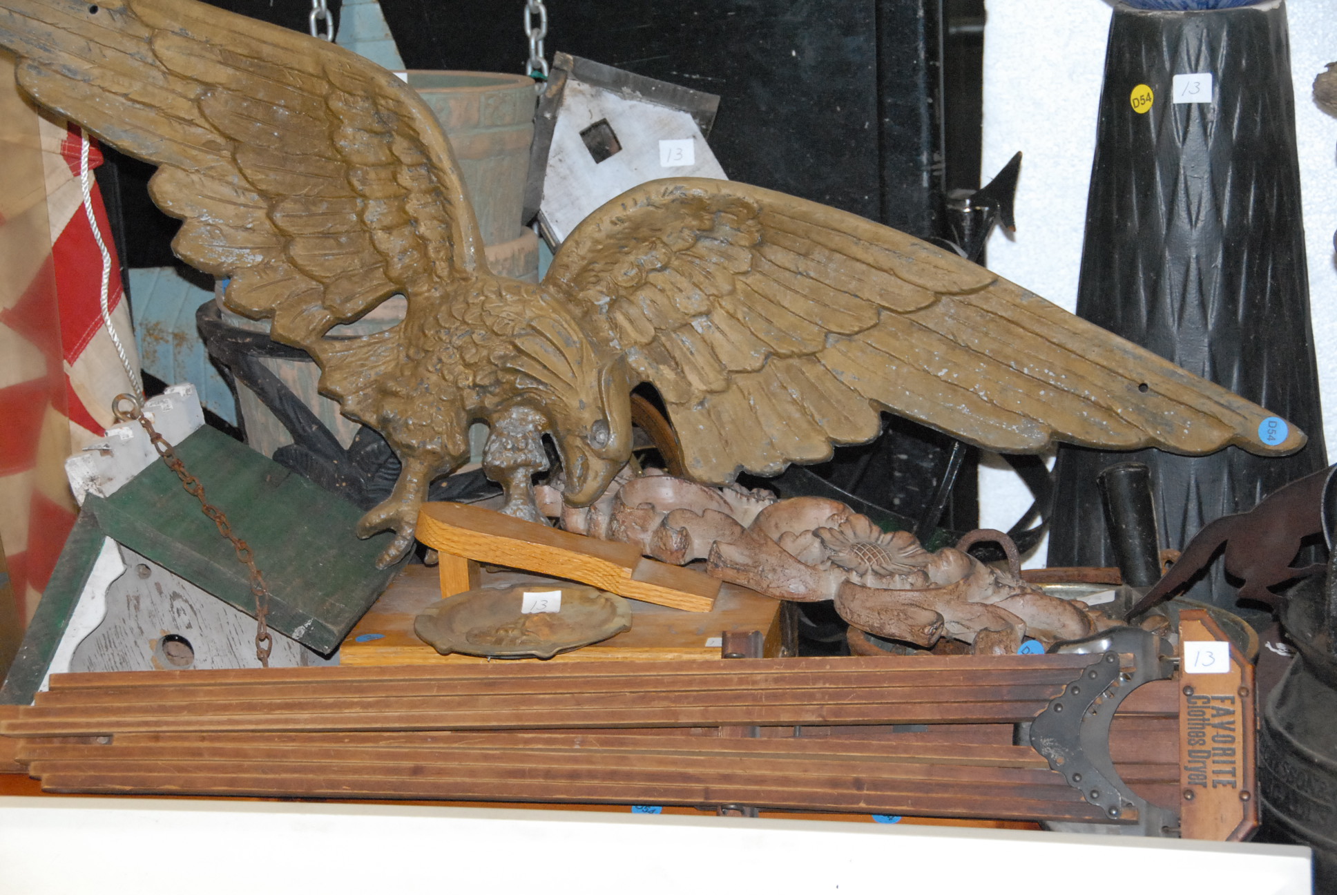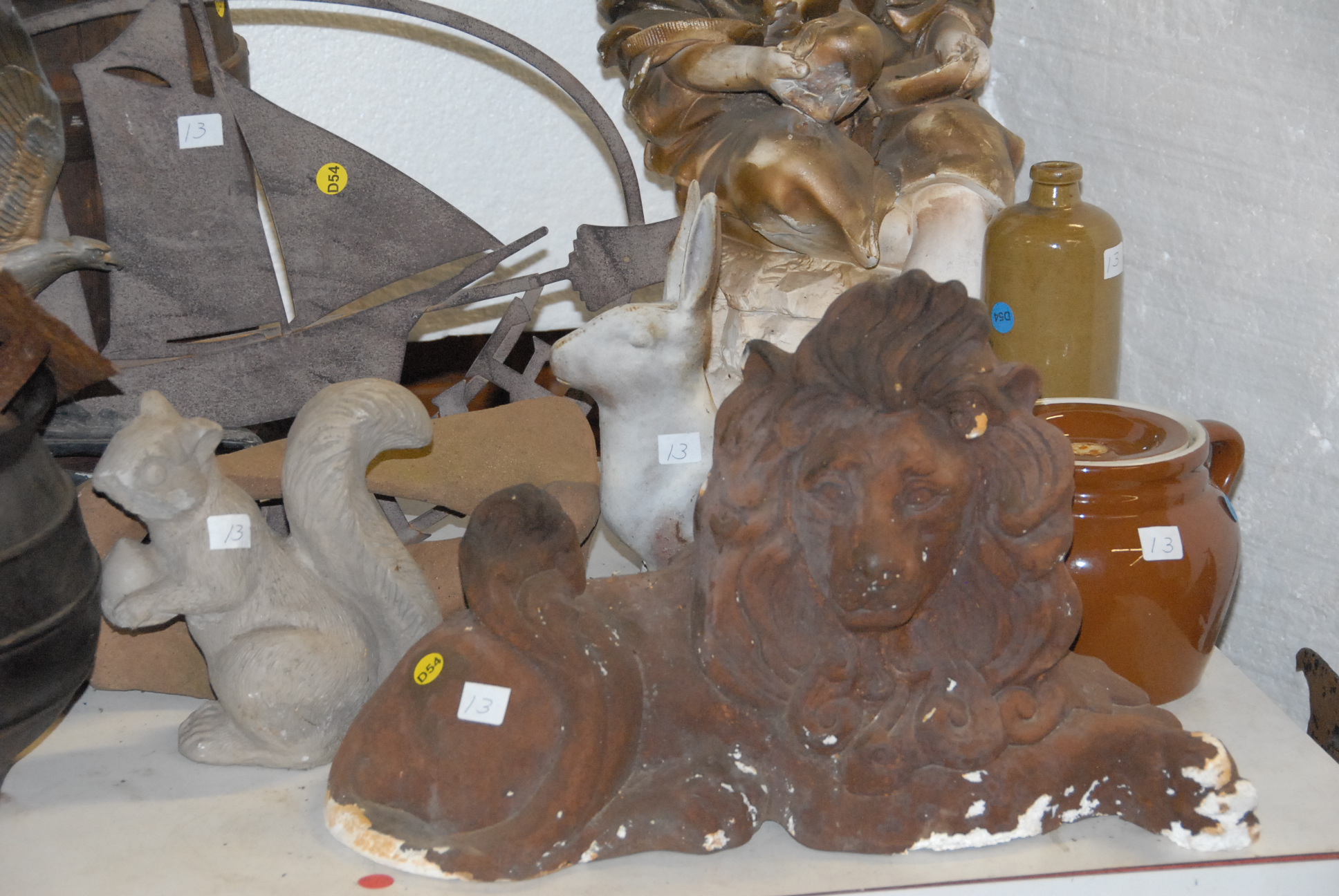 Two table lots on top and under tables to include watering cans, violin bows, metal eagle, outdoor statuary, kitchenware, glassware, thermos, wooden train, iron pot, iron rabbit, stag antlers, sailboat weathervane, and miscellaneous items.