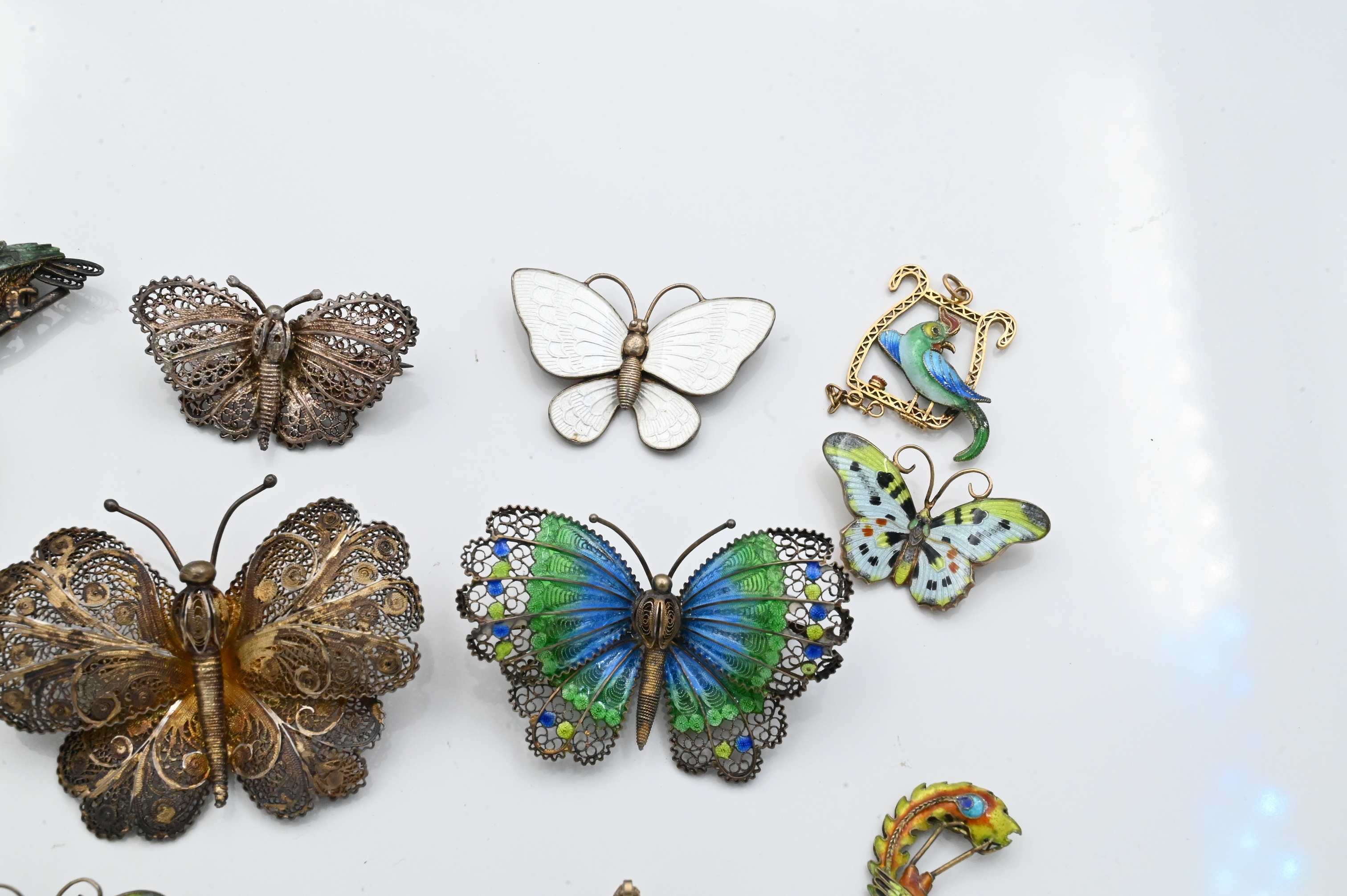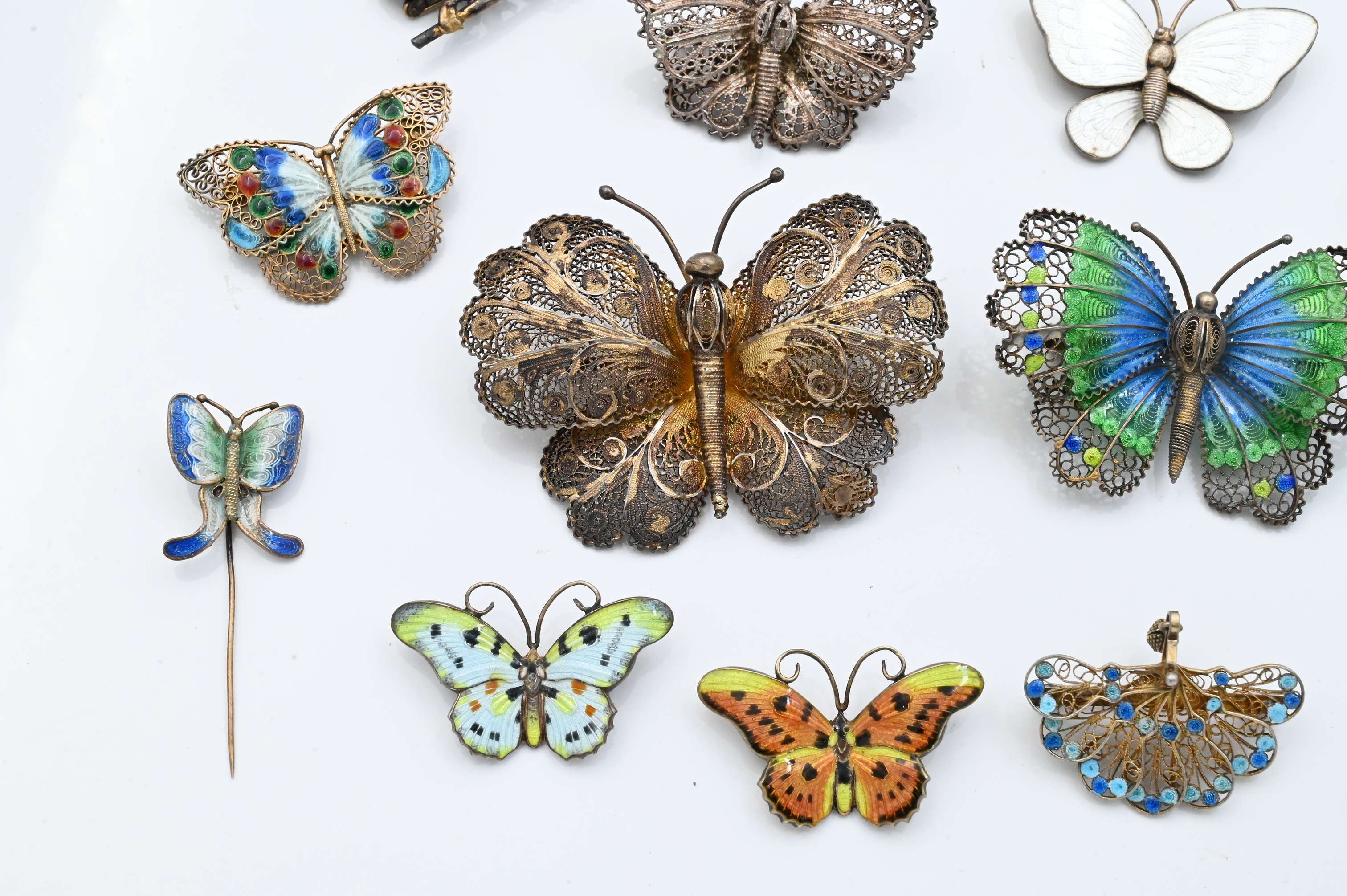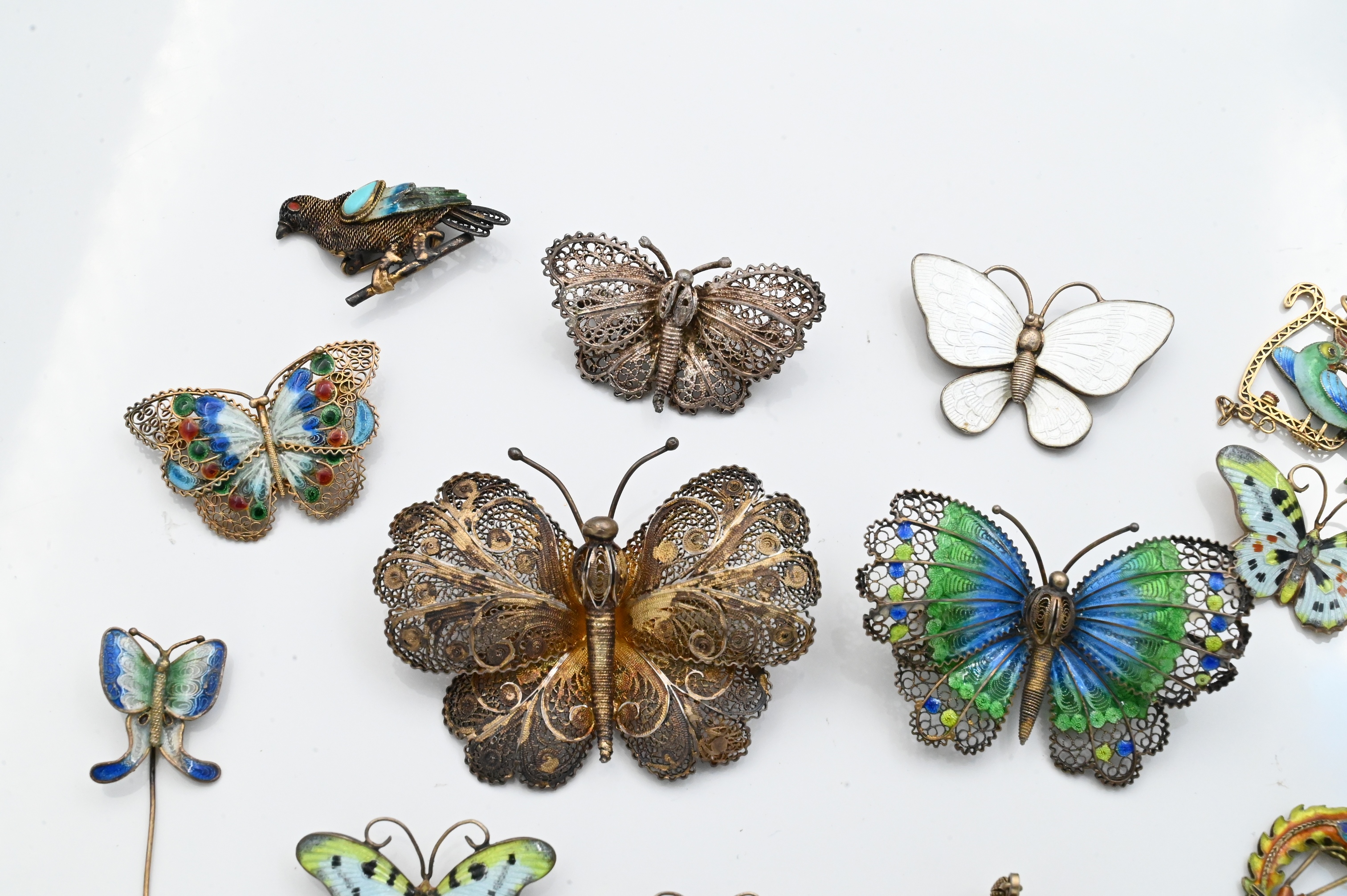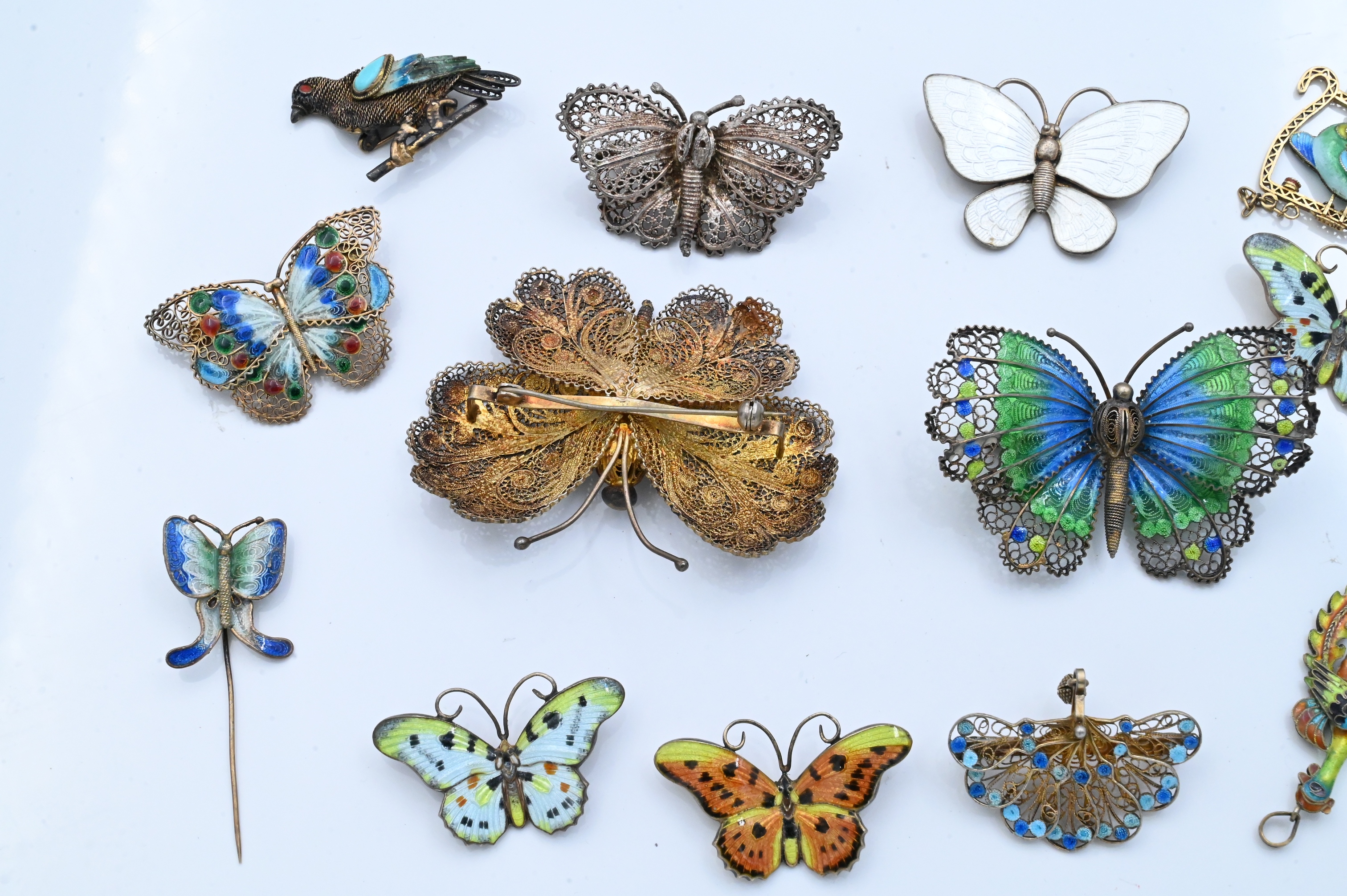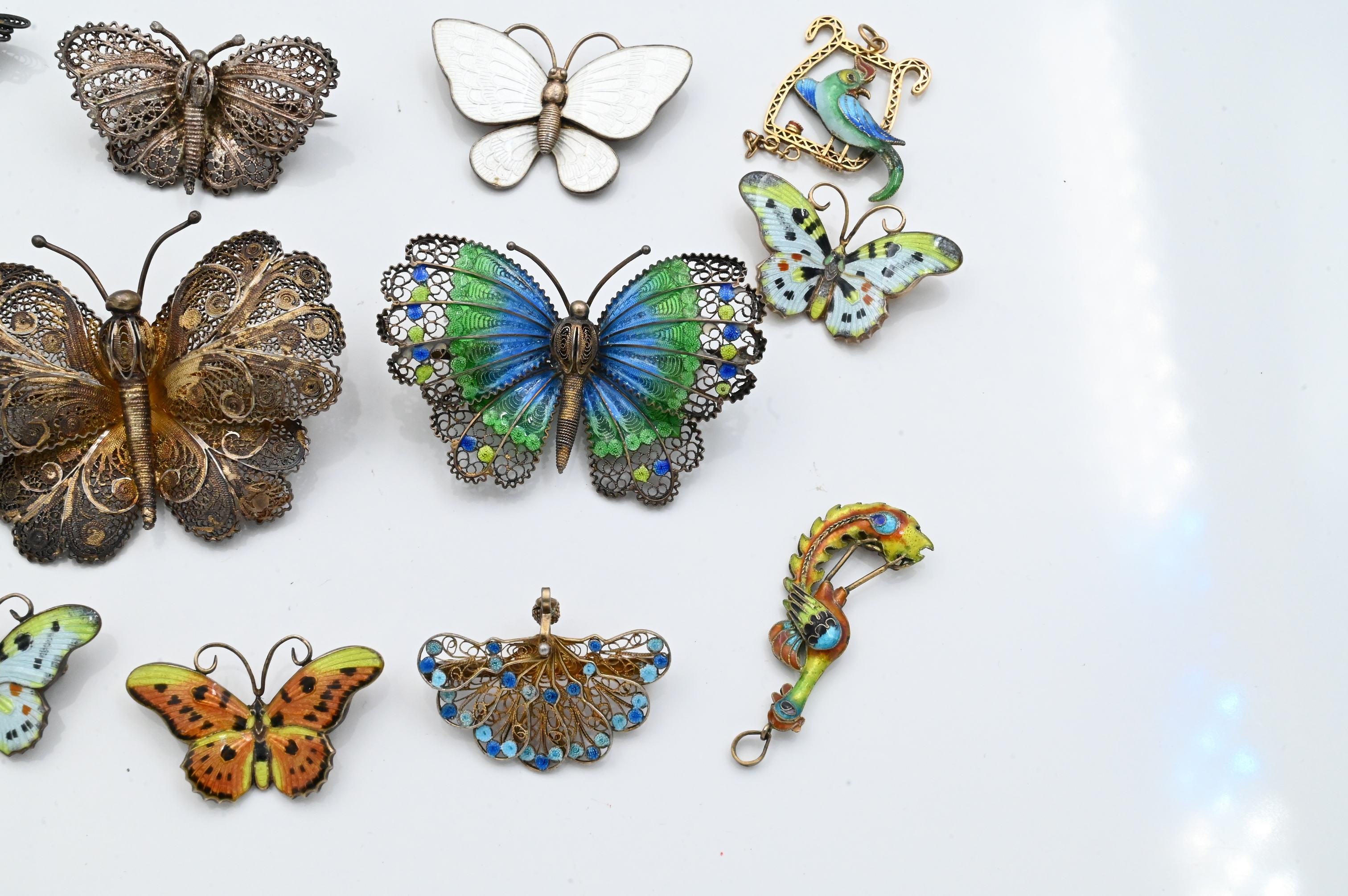 to include six enameled butterfly brooches, an enameled butterfly stickpin, an enameled phoenix pendant, along with two filigree butterfly brooches, etcetera