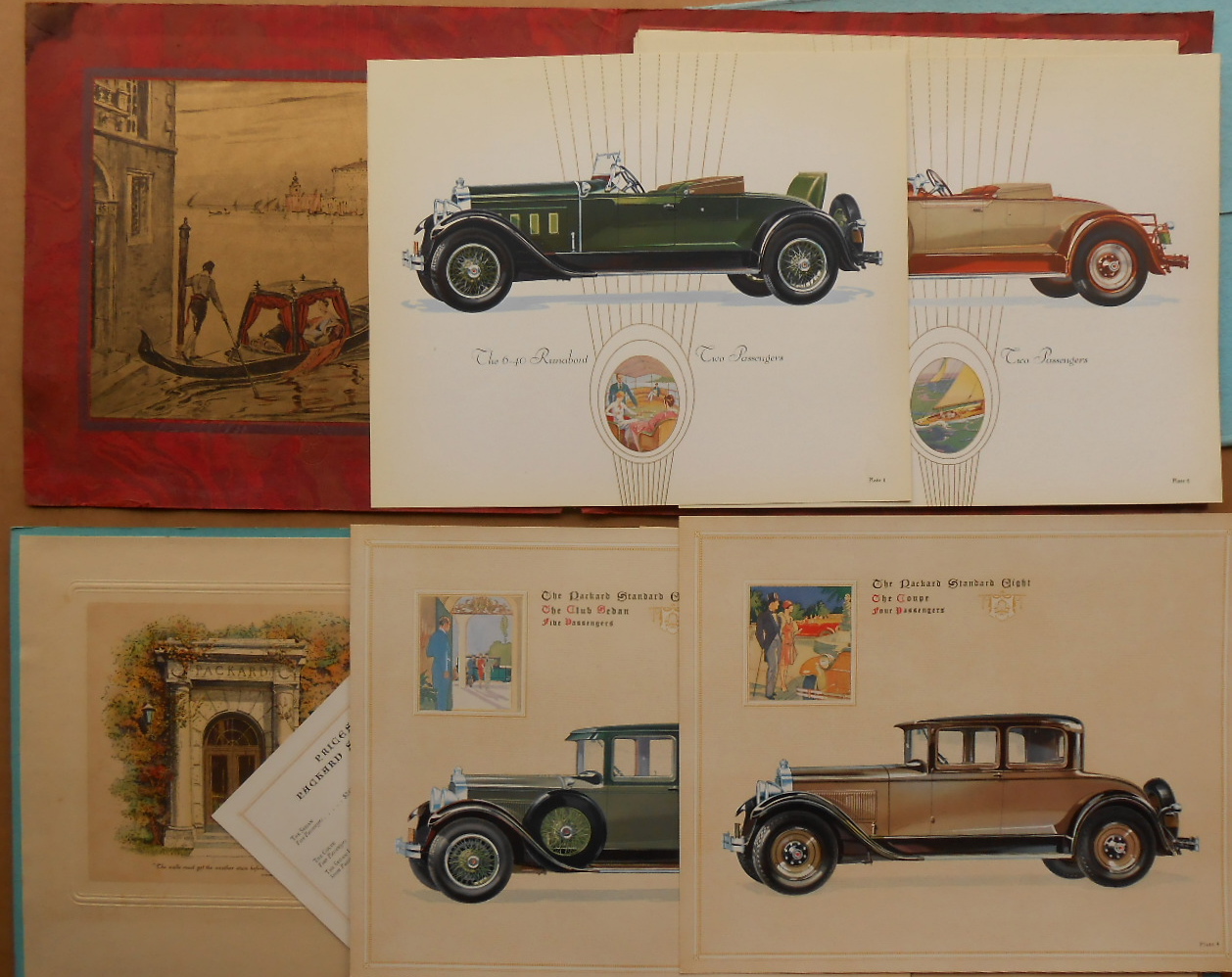 Lot 130: 3 Packard – 1928 526 catalog, 1929 626-633 portfolio with env, 1929 640 Custom 8 portfolio, cover stained