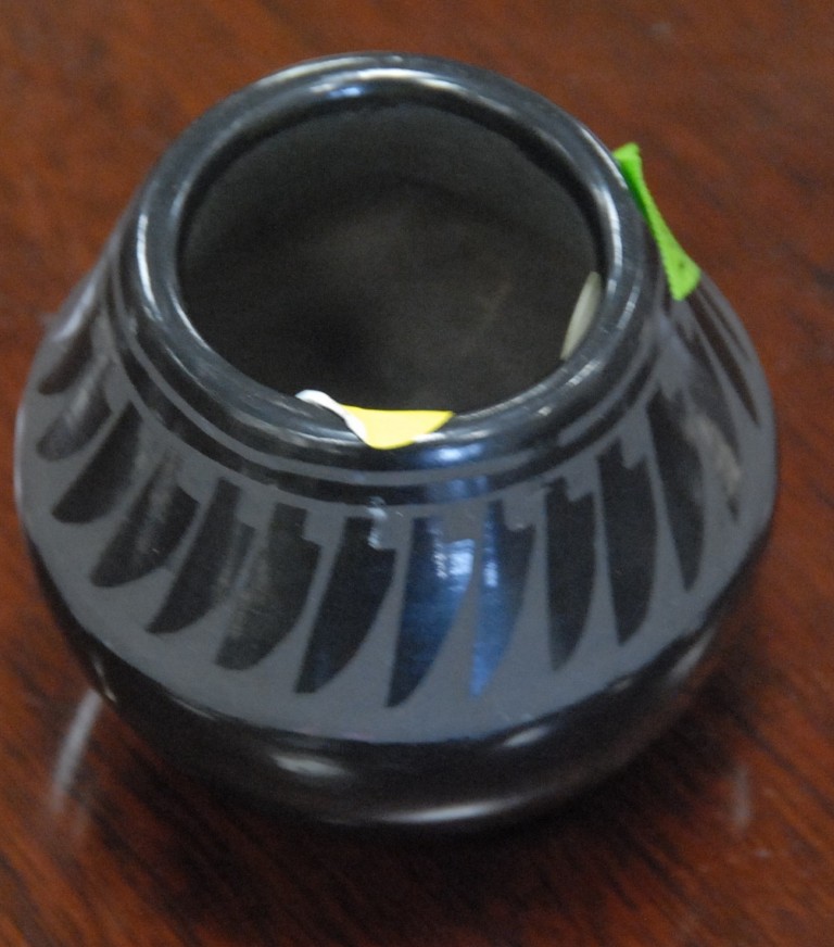 Black Indian pottery vase marked on bottom Santana Suazo Santa Clara, ht. 3, wd. 3.
