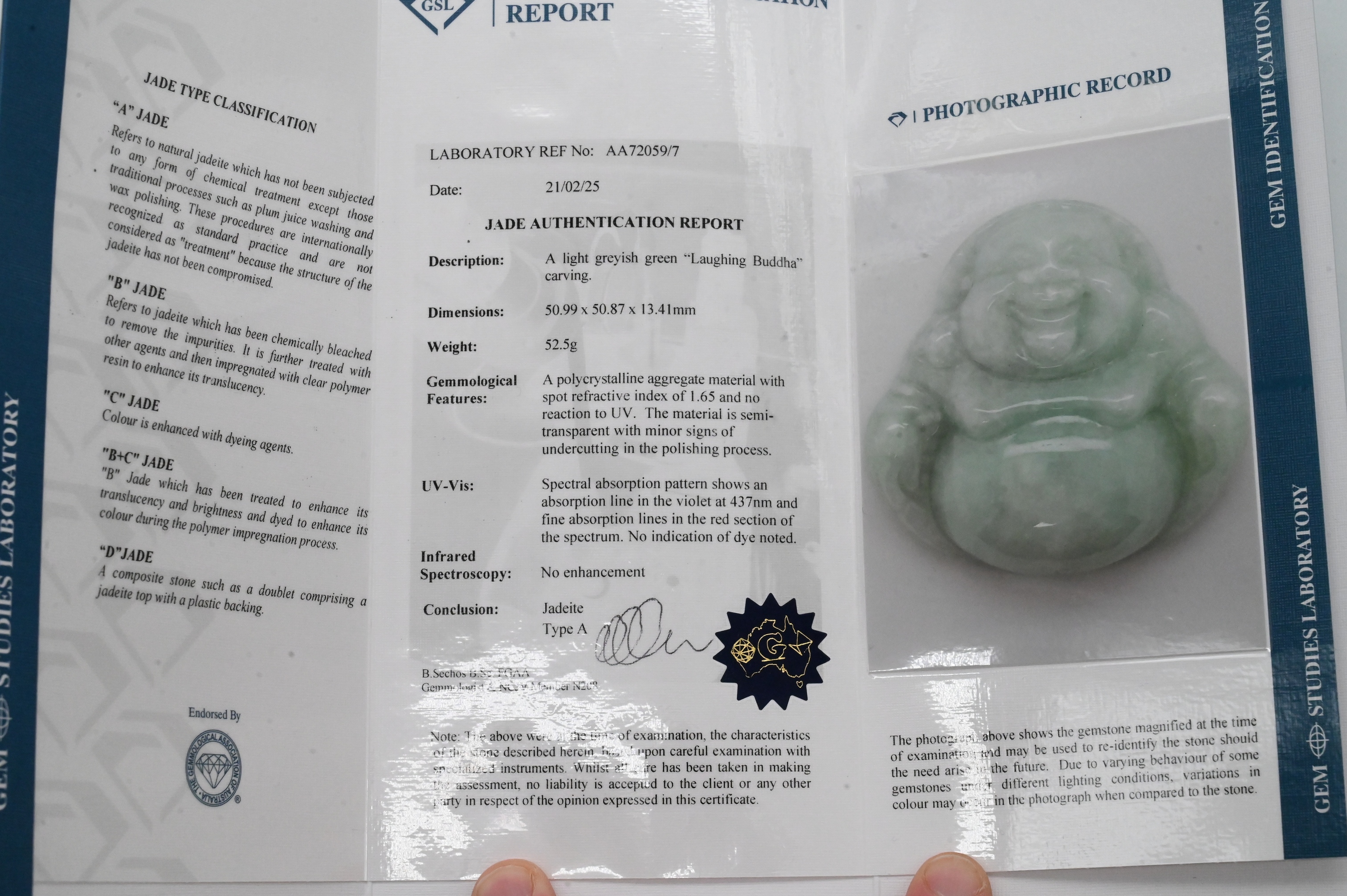 Accompanied by a GSL Gemstone Authentication Report (Lab Ref. No. AA72059/7, dated 2/21/2025), confirming the material as jadeite, Type A (natural, untreated), with no evidence of dye or enhancement